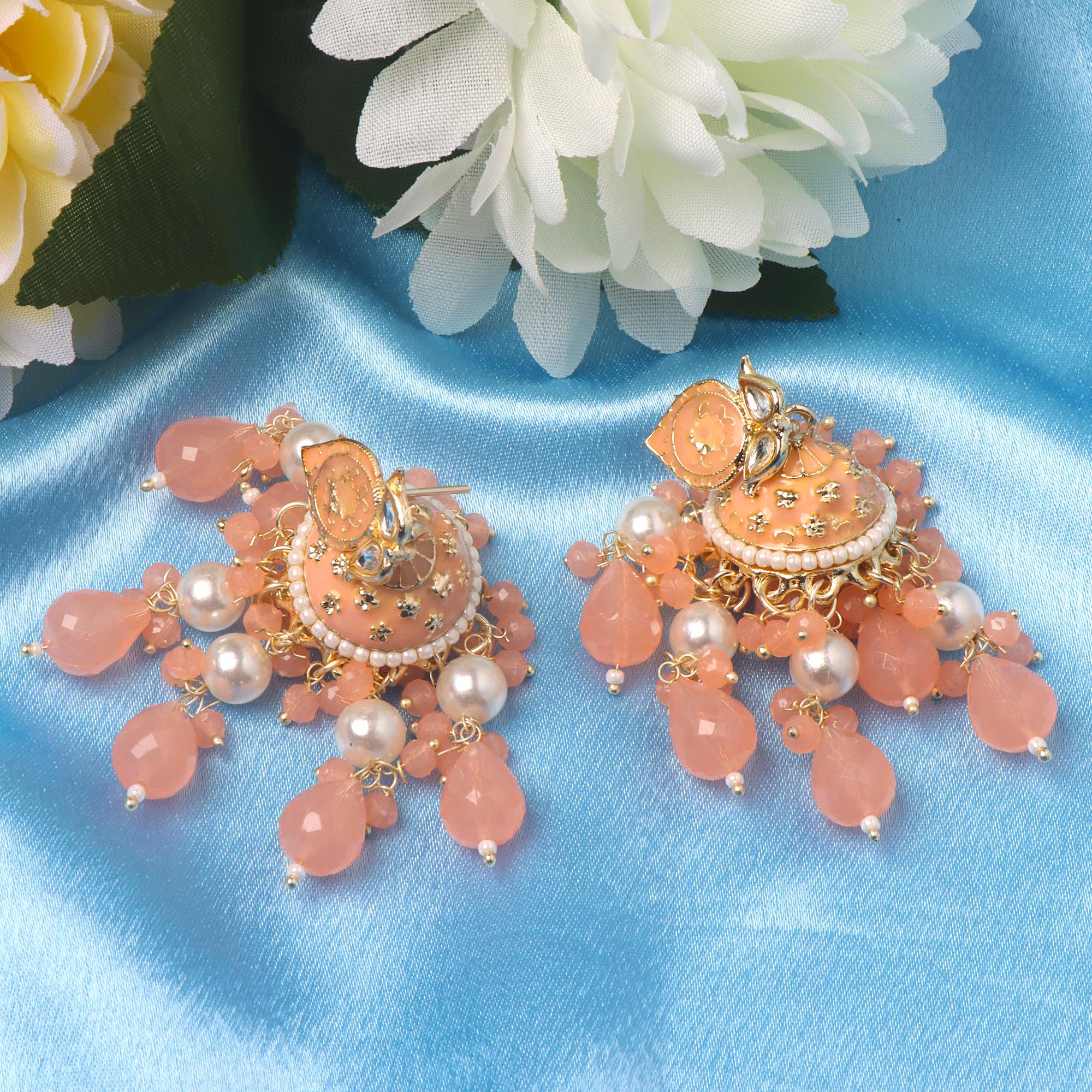 Elegant Kundan Pearl Jhumka Earrings for Women | OrnaOra Ethnic Jewelry - Peach