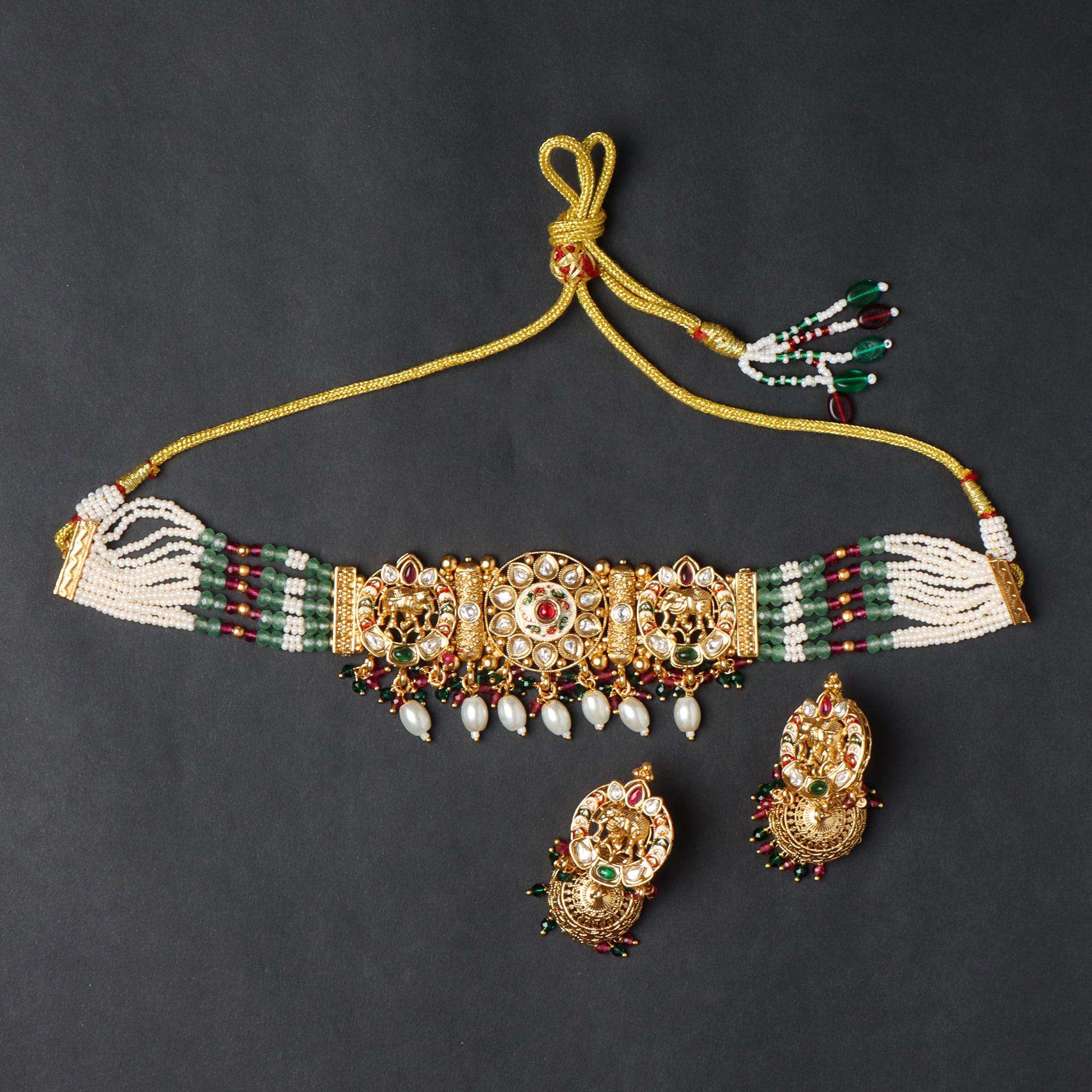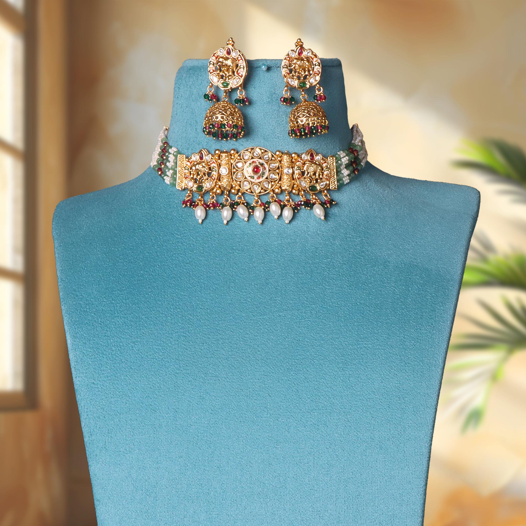A stunning imitation jewelry set blending antique charm with traditional elegance. This choker-style necklace and earrings set is perfect for festive and bridal looks.