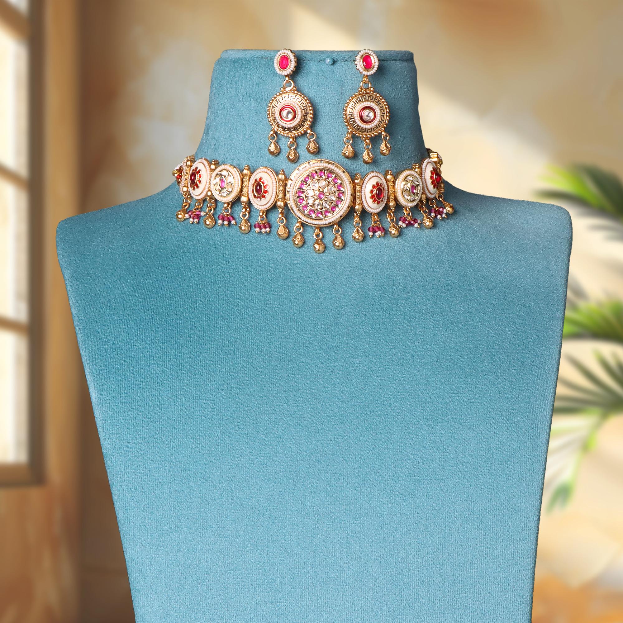 A dazzling imitation jewelry set featuring intricate Kundan work and delicate pearls. This elegant necklace and matching earrings radiate traditional charm for festive occasions.