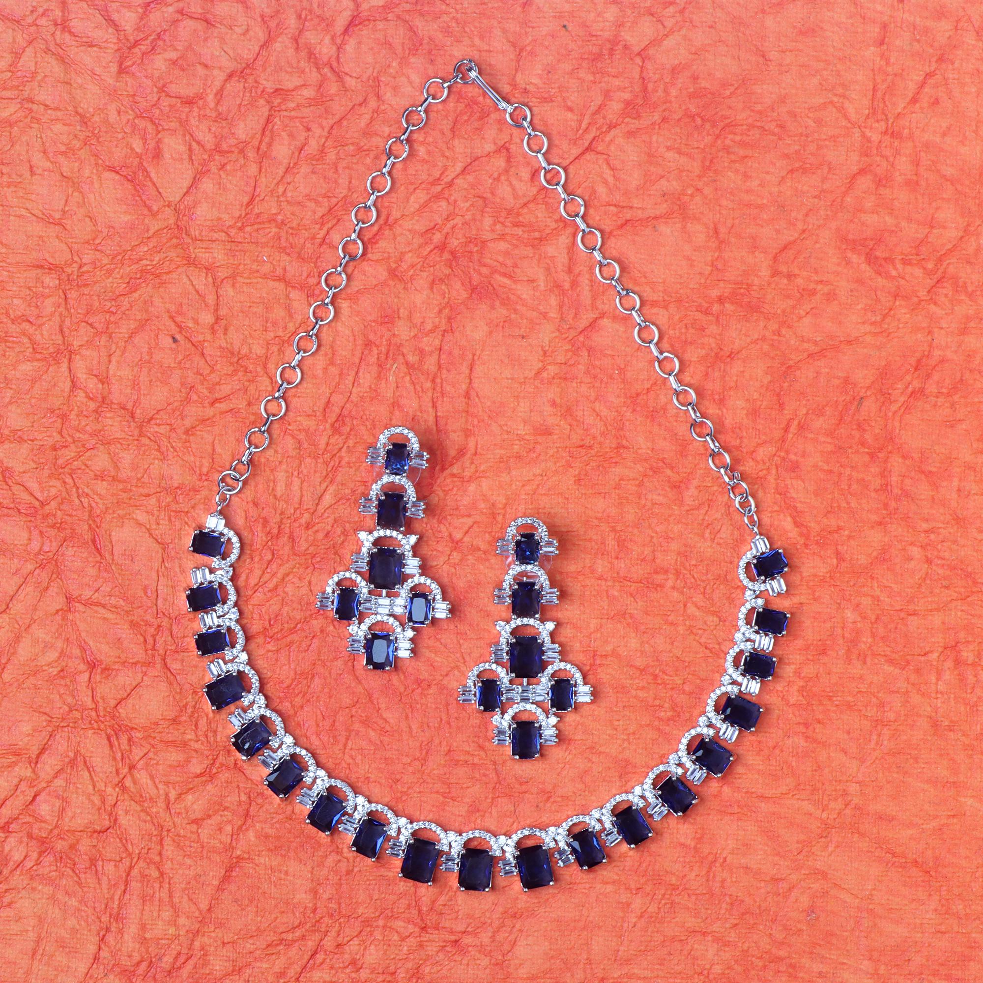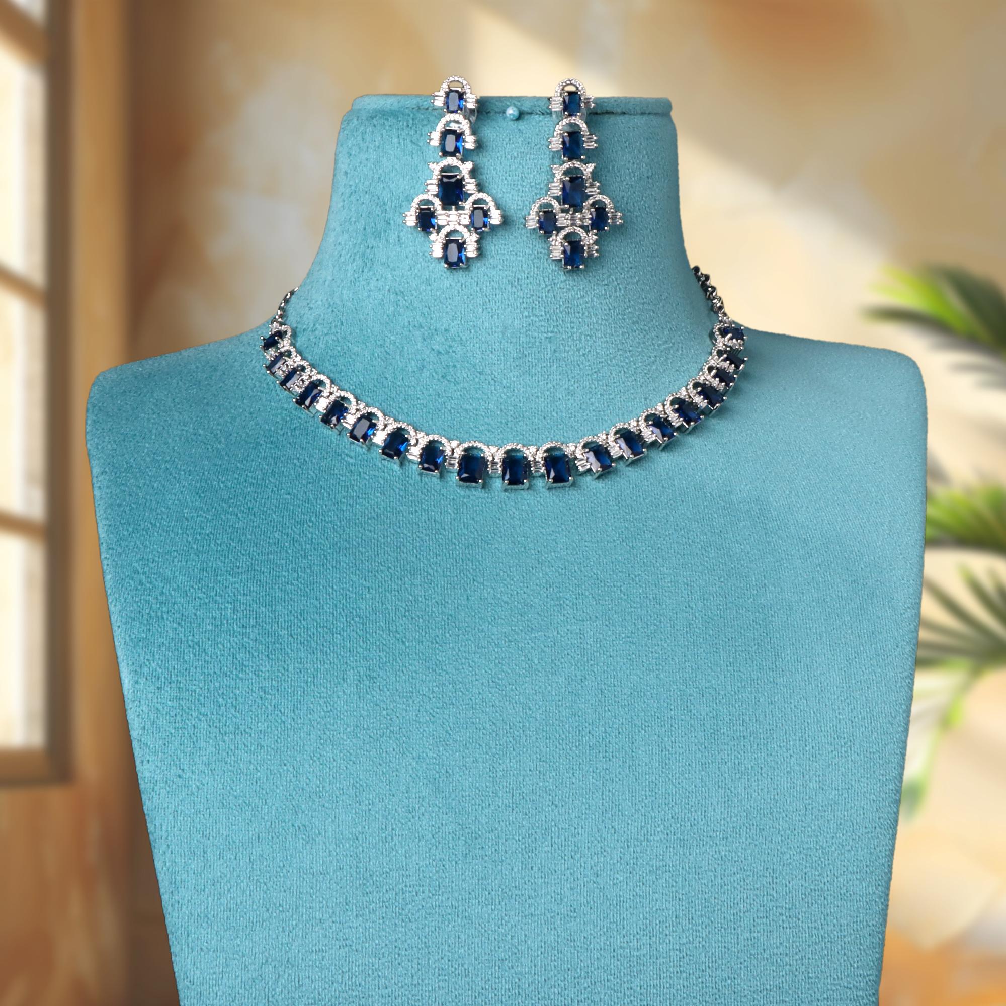 OrnaOra's elegant silver tone necklace and earring set features sparkling American diamonds and striking blue rectangular faux stones. This contemporary imitation jewelry adds a touch of glamorous sophistication.