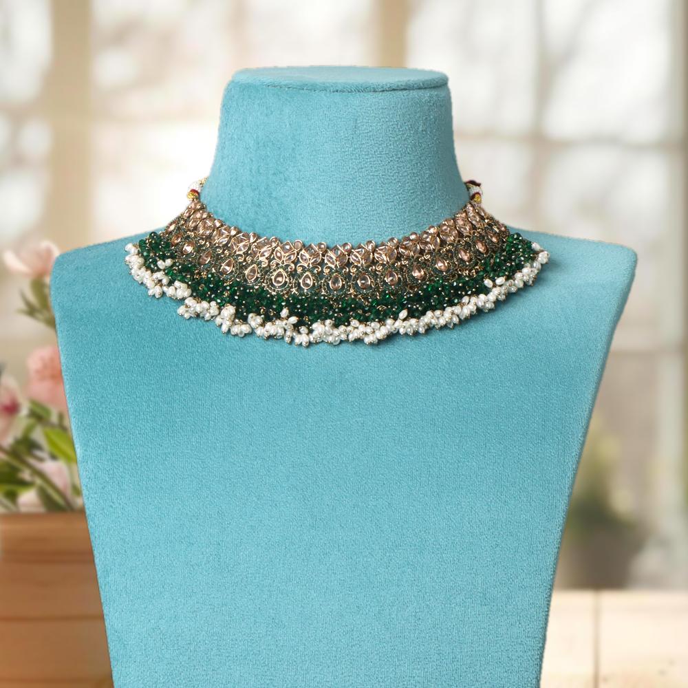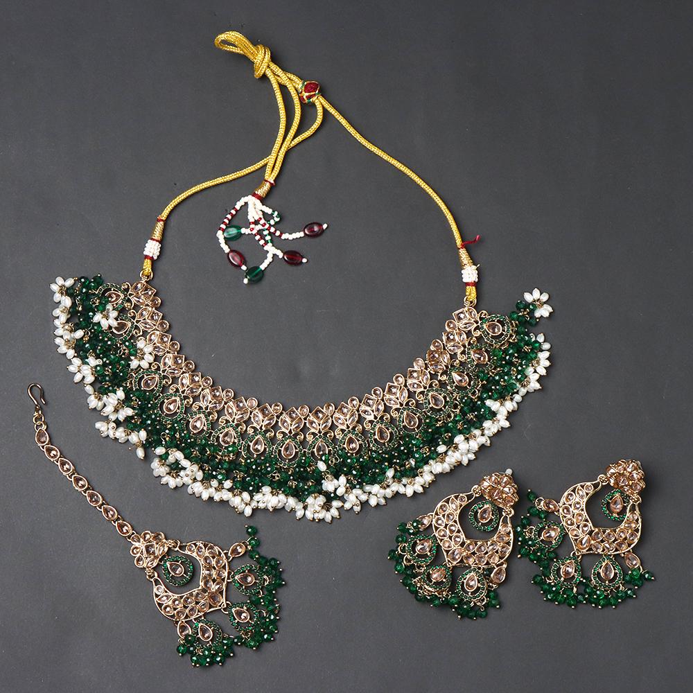 OrnaOra's imitation choker features intricate Kundan-style detailing with vibrant emerald green stone accents and delicate faux pearl drops. Includes matching imitation earrings and a beautiful maang tikka for a complete traditional look.