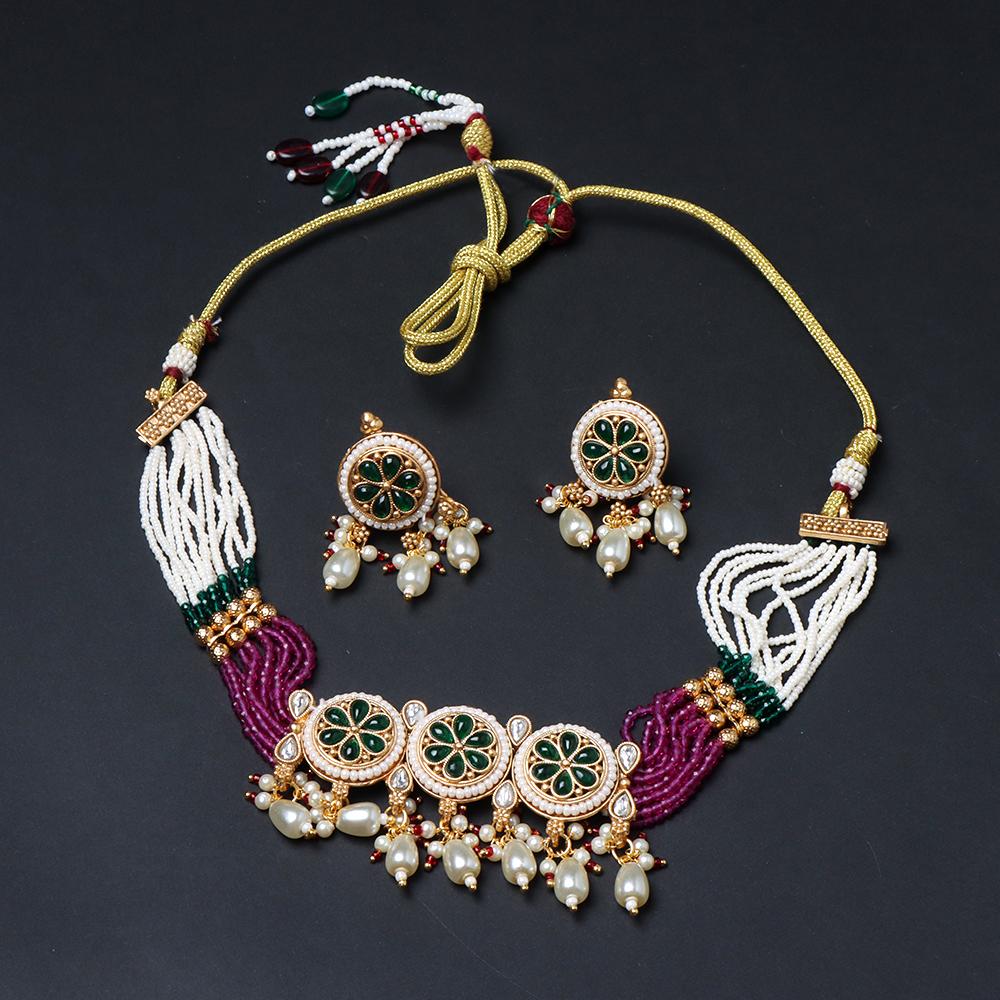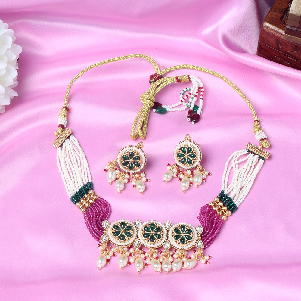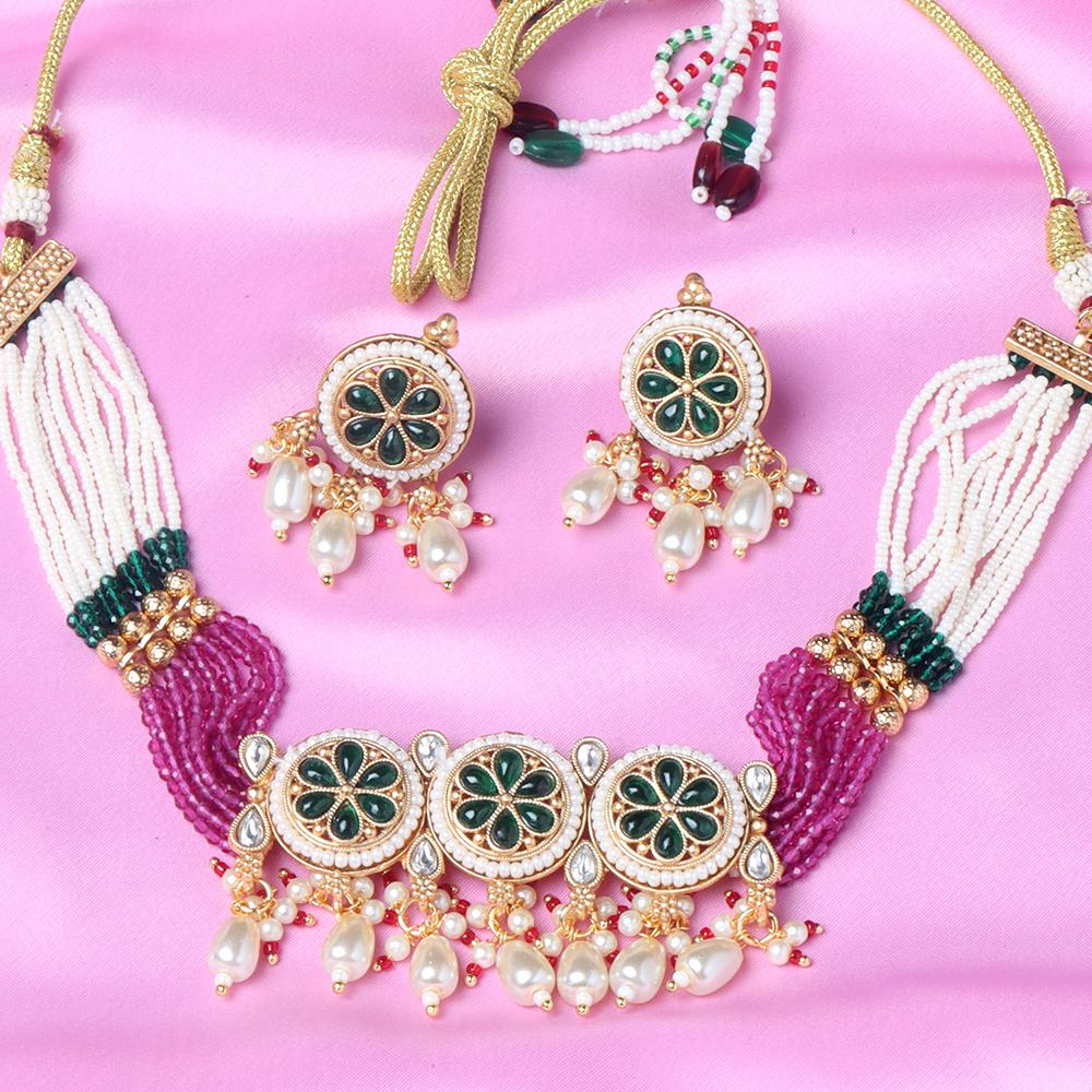 OrnaOra's imitation necklace features floral-inspired pendants with green accents and delicate faux pearl drops. The intricate design adds a touch of traditional charm. Comes with matching imitation earrings.