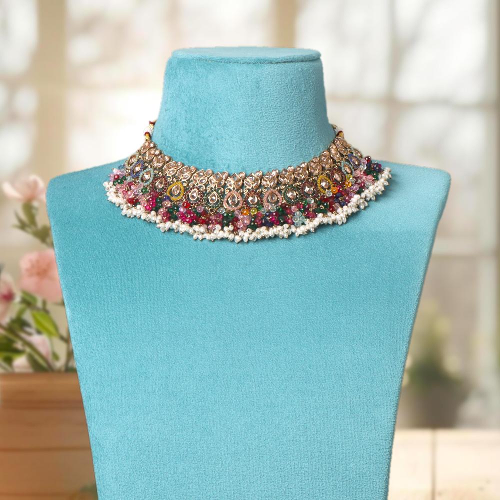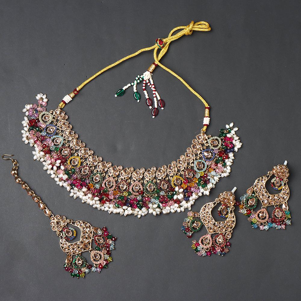 OrnaOra's imitation jewelry set features a broad, intricately designed choker with vibrant multicolor Kundan-style stones and delicate faux pearl accents. Includes matching statement imitation earrings and a regal maang tikka.