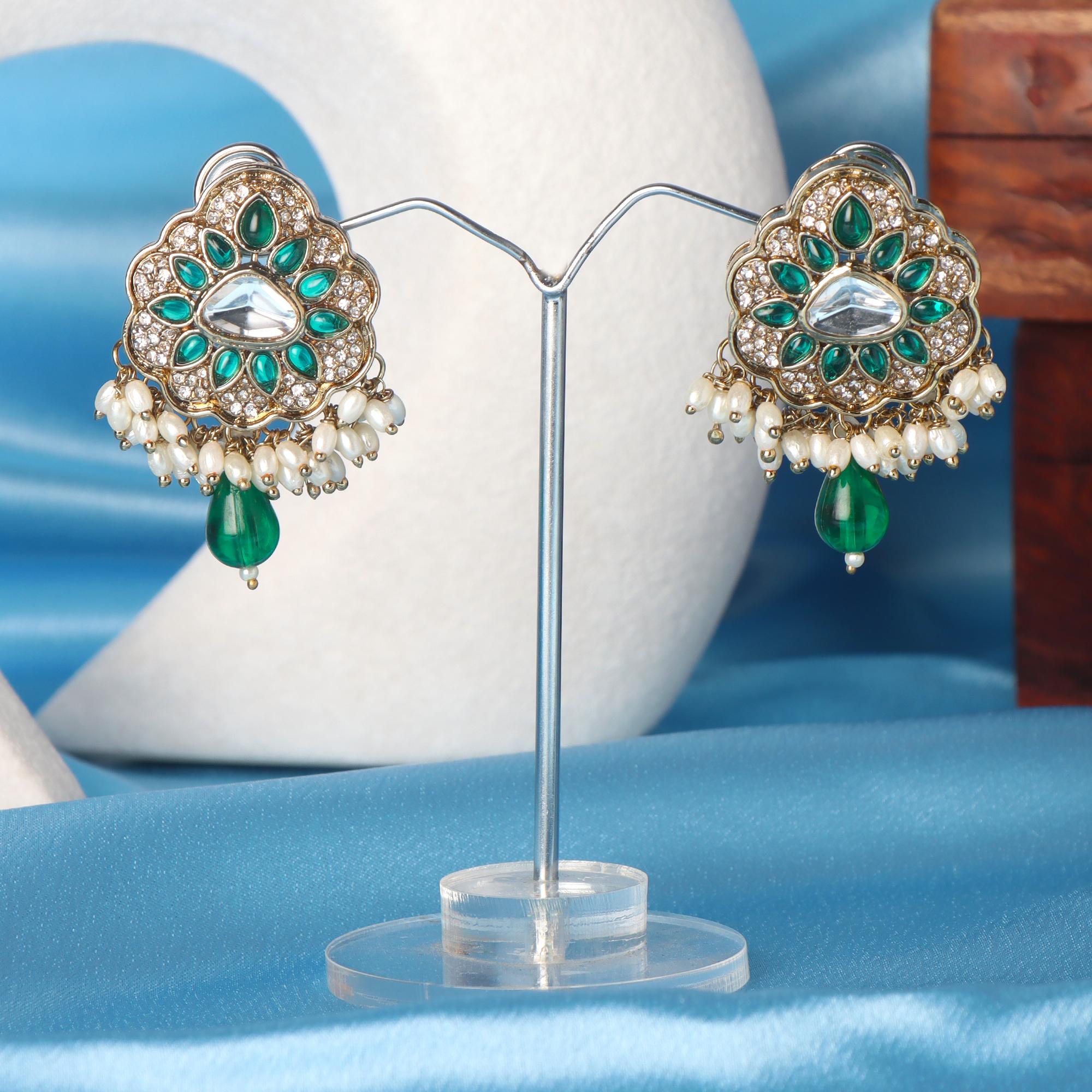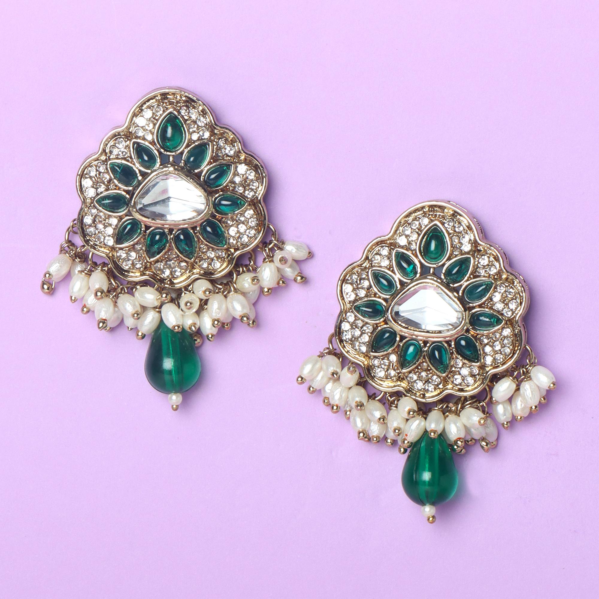 OrnaOra's vibrant imitation Green Stone Stud earrings feature a gold tone finish with sparkling faux stones, rich green and multi-coloured accents, imitation pearls, and a green bead drop. Charming imitation jewelry.