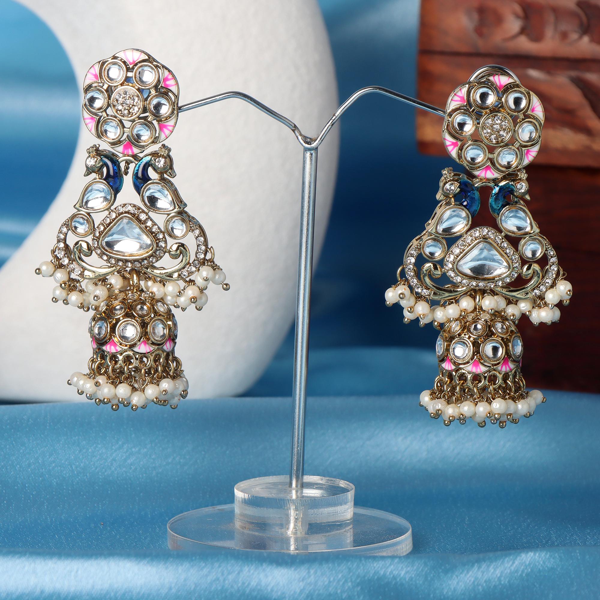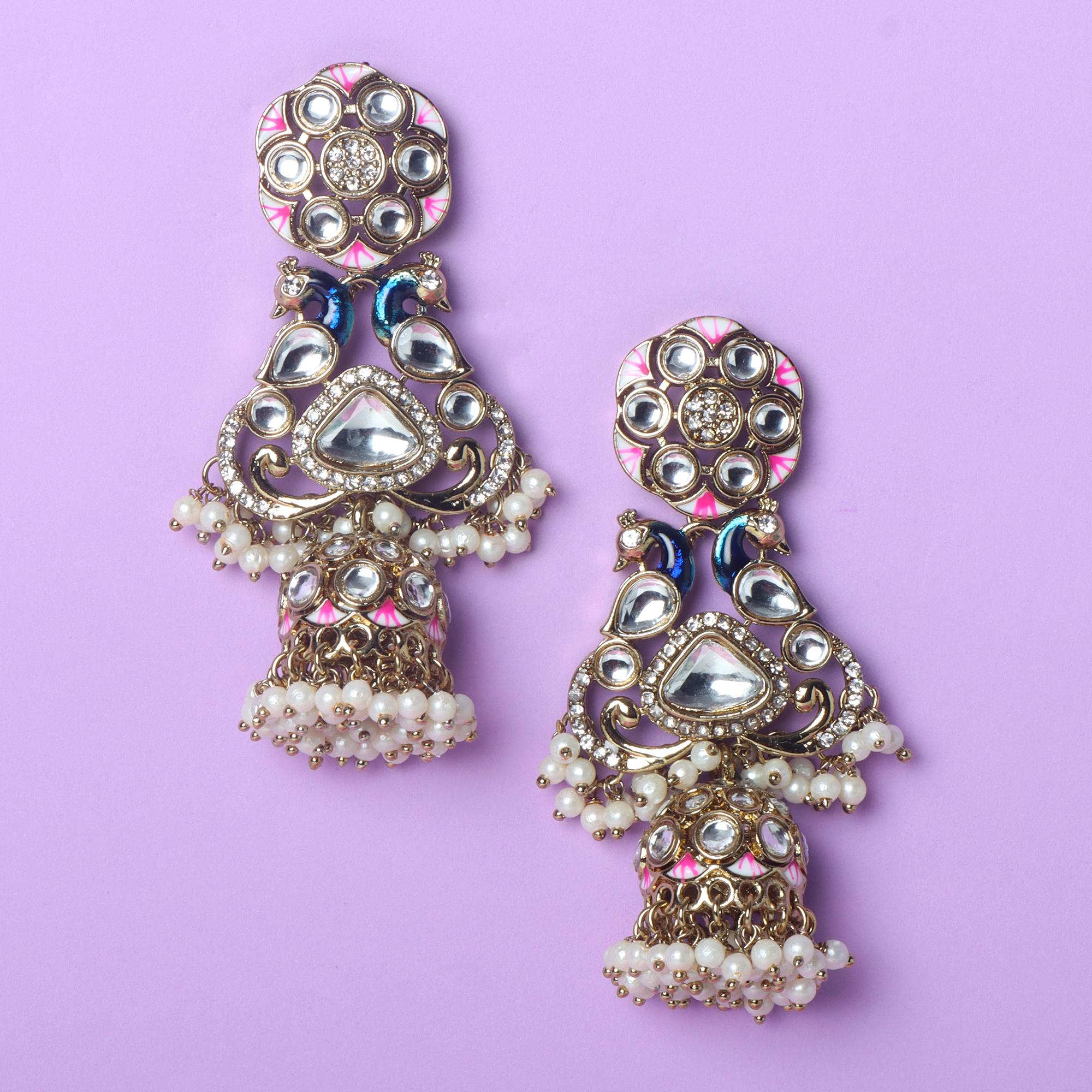 OrnaOra's beautiful imitation Ivory Bhagya Jhumkis feature a gold tone finish with sparkling faux stones, delicate pink and blue enamel peacock design, and elegant imitation pearl drops. Charming imitation jewelry.