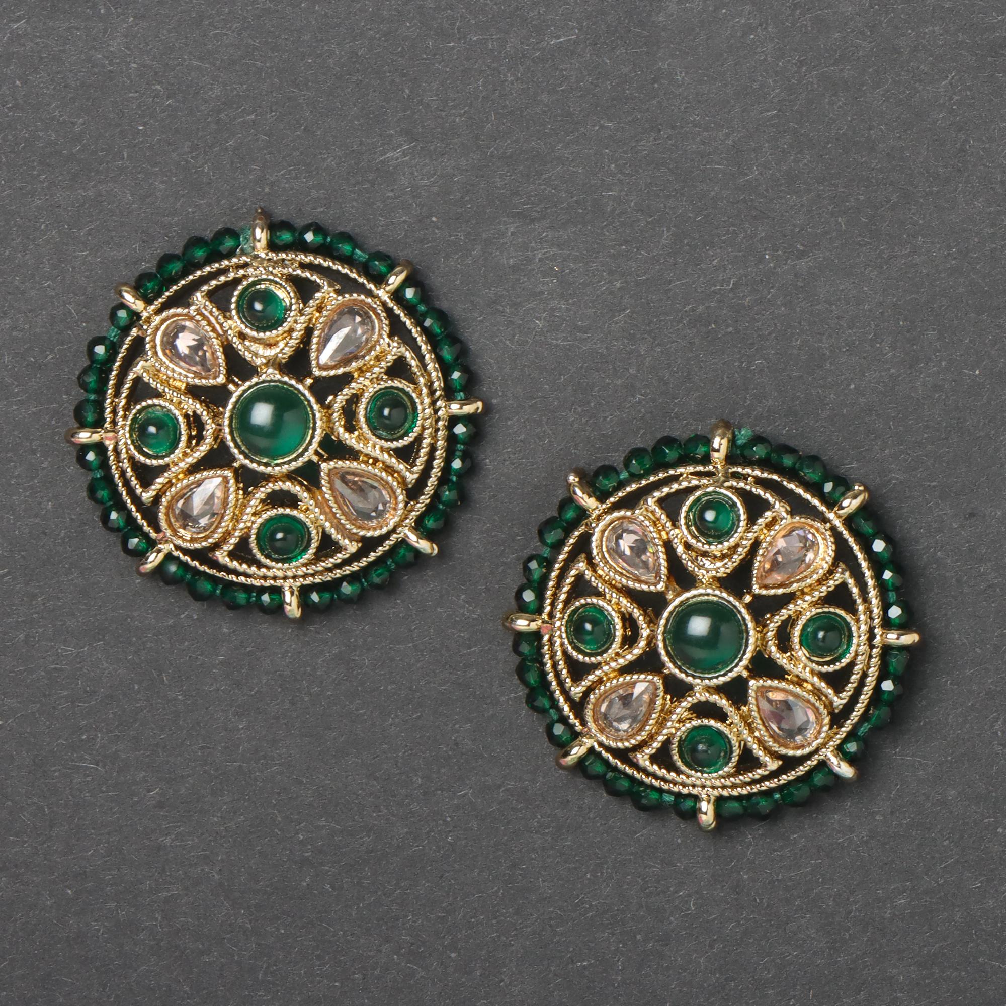 OrnaOra's vibrant imitation stud earrings feature a gold tone finish with dazzling faux kundan and green stones, bordered by green imitation beads. These round imitation earrings add a pop of colour.
