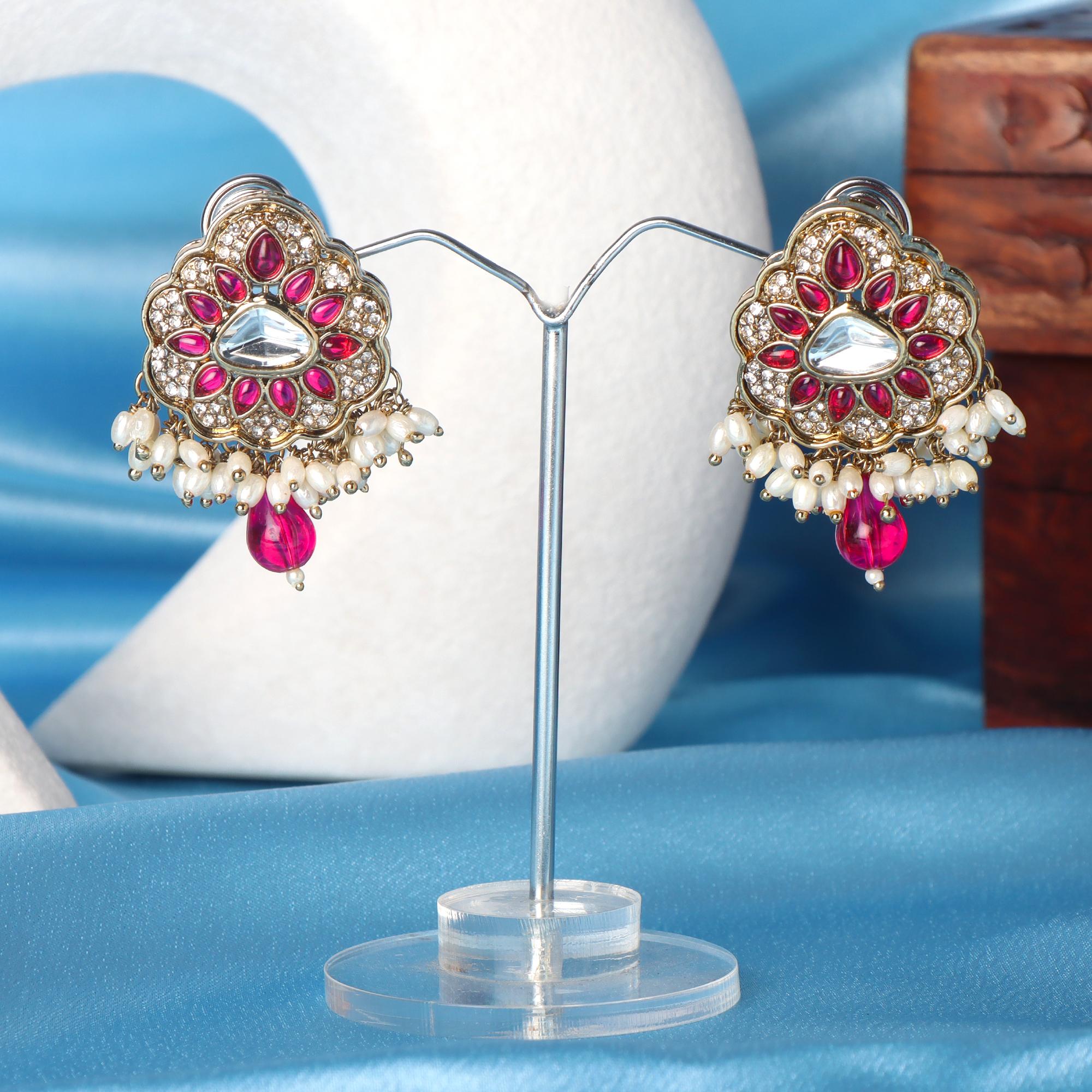 OrnaOra's vibrant imitation Rani Miraya Kundan studs feature a gold tone finish with sparkling faux kundan, red and multi-coloured stone accents, imitation pearls, and a maroon bead drop. Charming imitation jewelry.