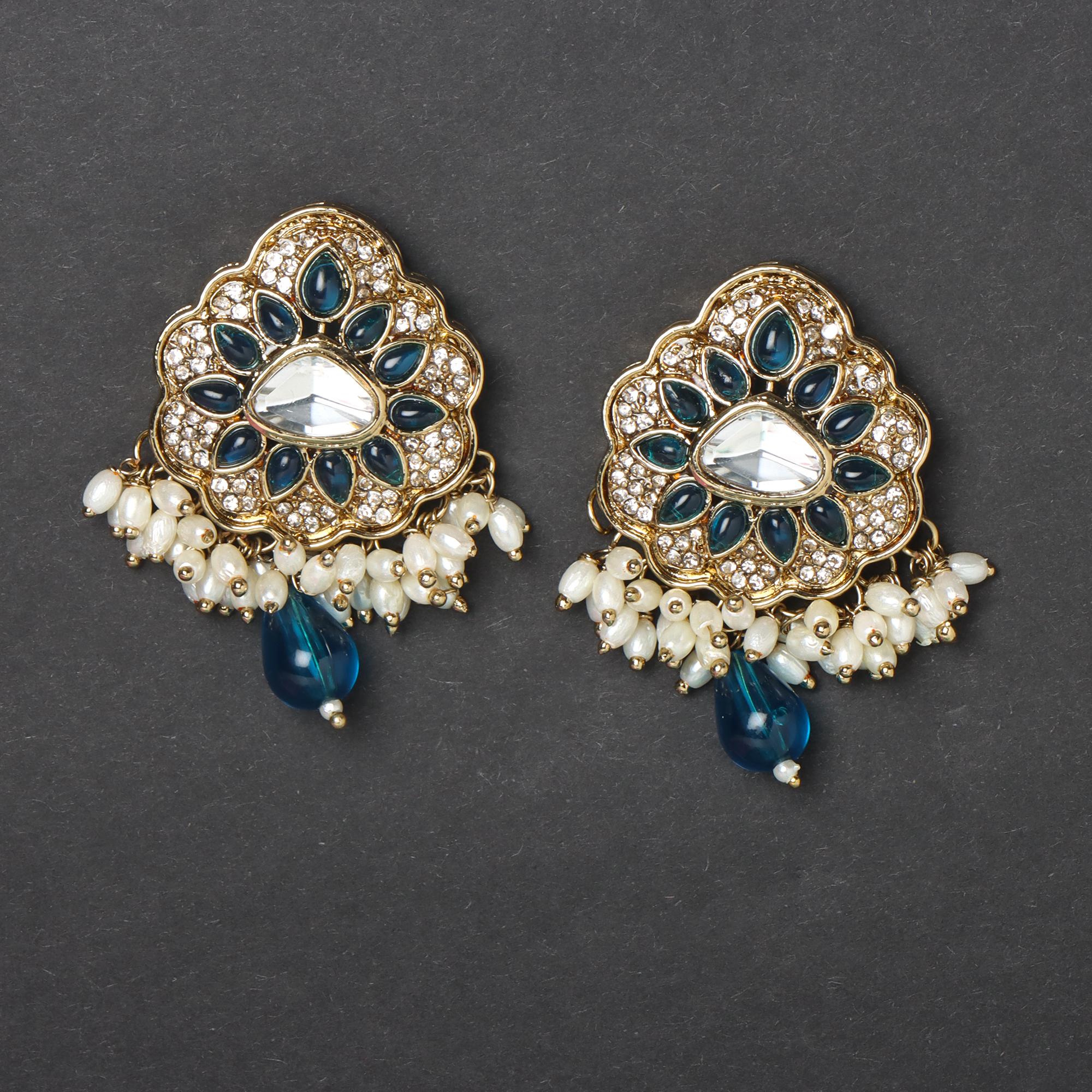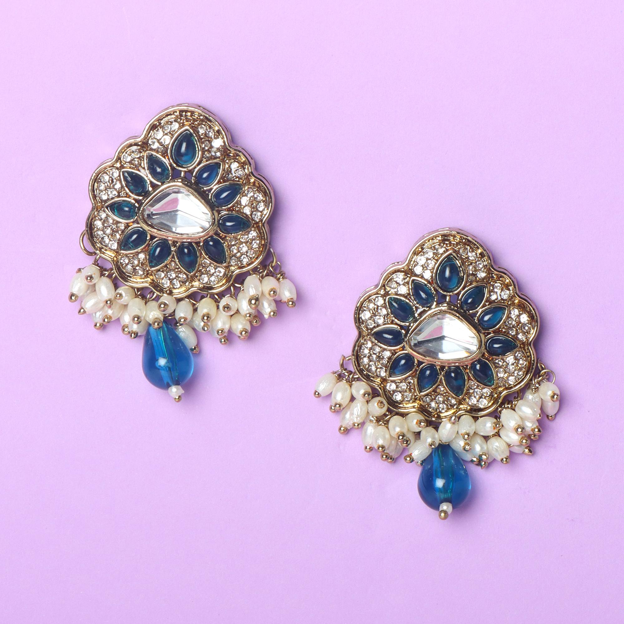 OrnaOra's striking imitation Sapphire Moissanite studs feature a gold tone finish with sparkling faux stones, rich sapphire blue accents, colourful details, imitation pearls, and a blue bead drop. Elegant imitation jewelry.