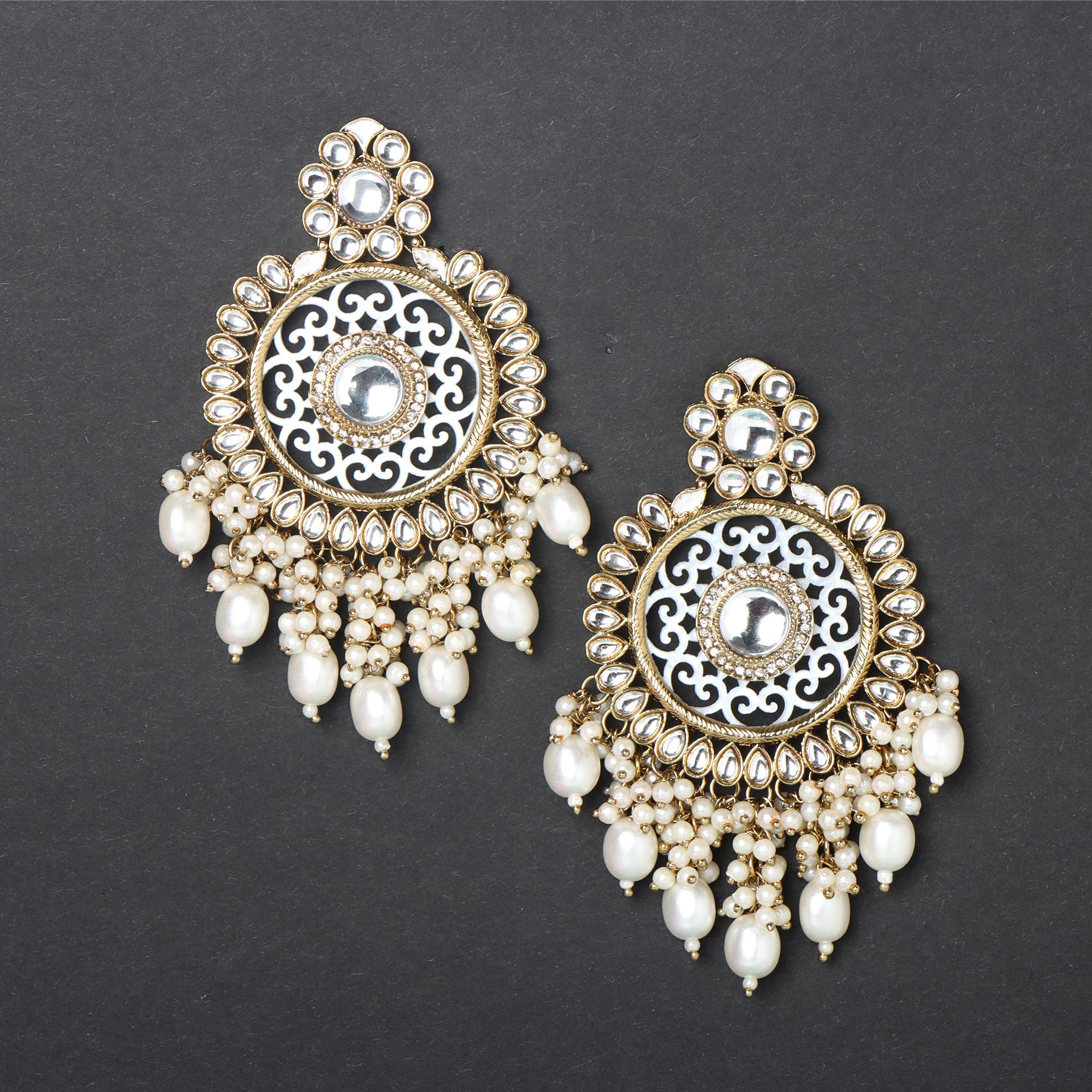 OrnaOra's beautiful imitation Ivory Miraya Chandbalis feature a gold tone finish with sparkling faux kundan stones, elegant ivory enamel details, imitation pearls, and white bead drops. Dramatic imitation jewelry.