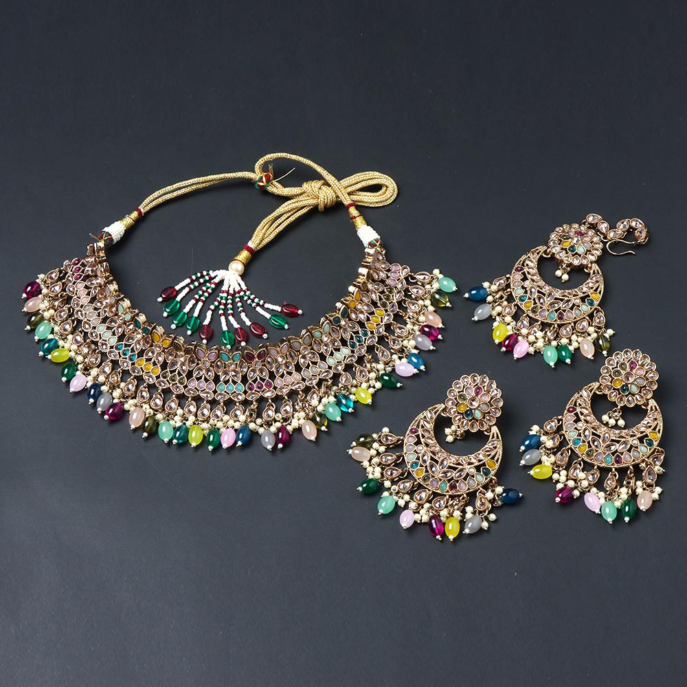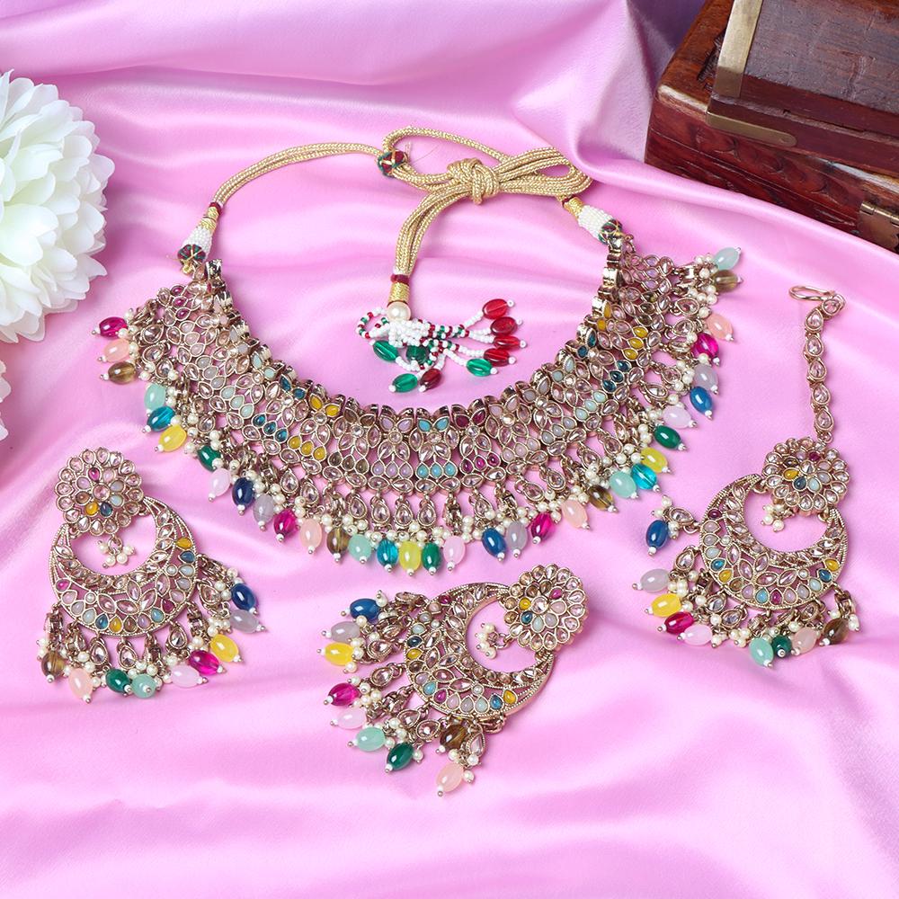 OrnaOra's imitation choker features intricate Kundan-inspired detailing adorned with vibrant multicolor stone drops and delicate faux pearl accents. This set includes matching statement imitation earrings for a festive look.