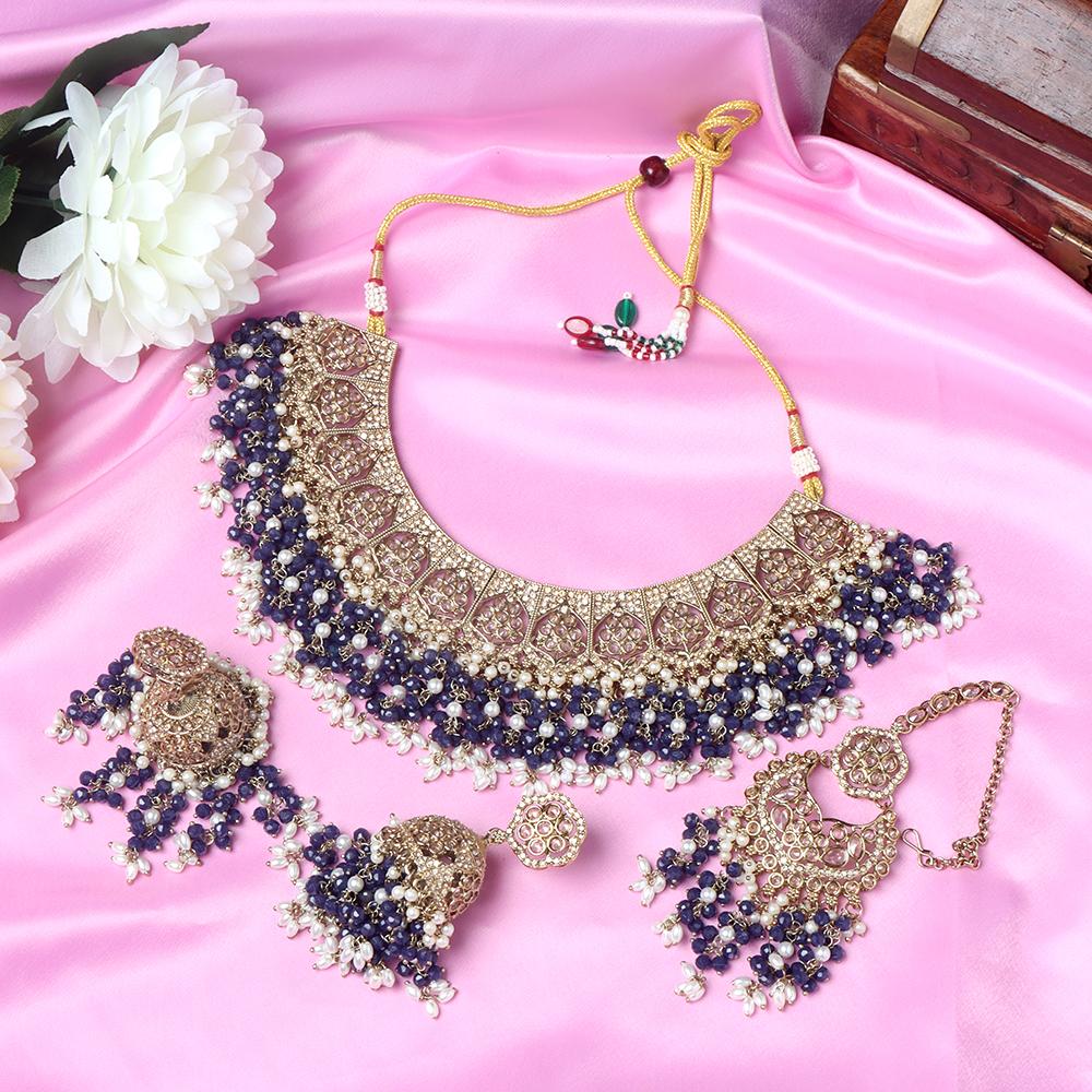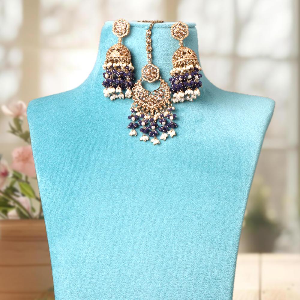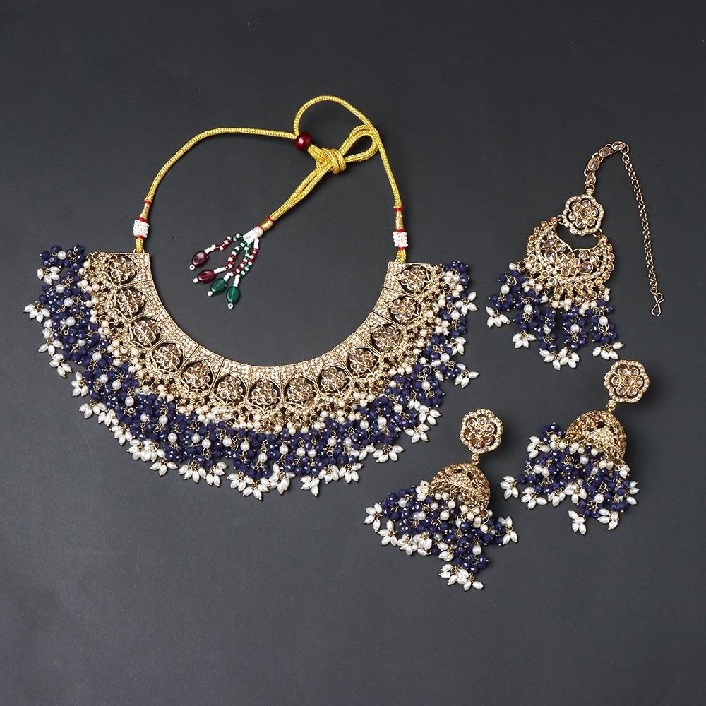 OrnaOra's elegant imitation jewelry set with a necklace and matching earrings adorned with royal blue beads. Perfect for traditional outfits and festive occasions.