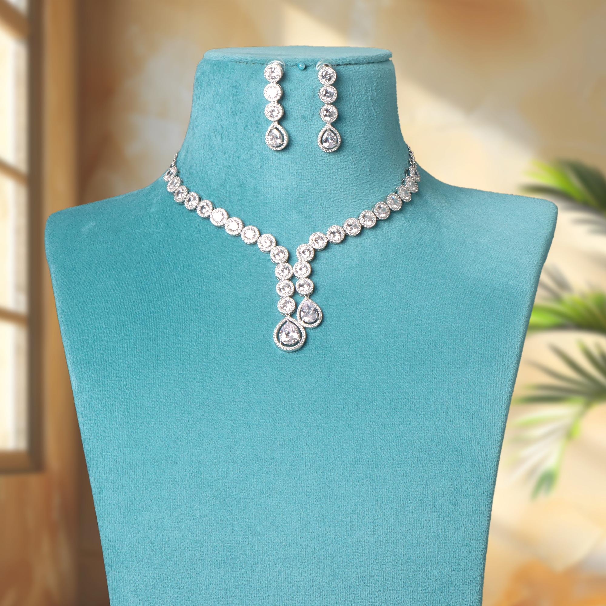 OrnaOra's elegant Silver Zirconia Jewellery Set features sparkling Zirconia stones in a graceful water drop design. Includes a beautiful Y-shaped necklace and matching dangle earrings. Perfect for weddings.