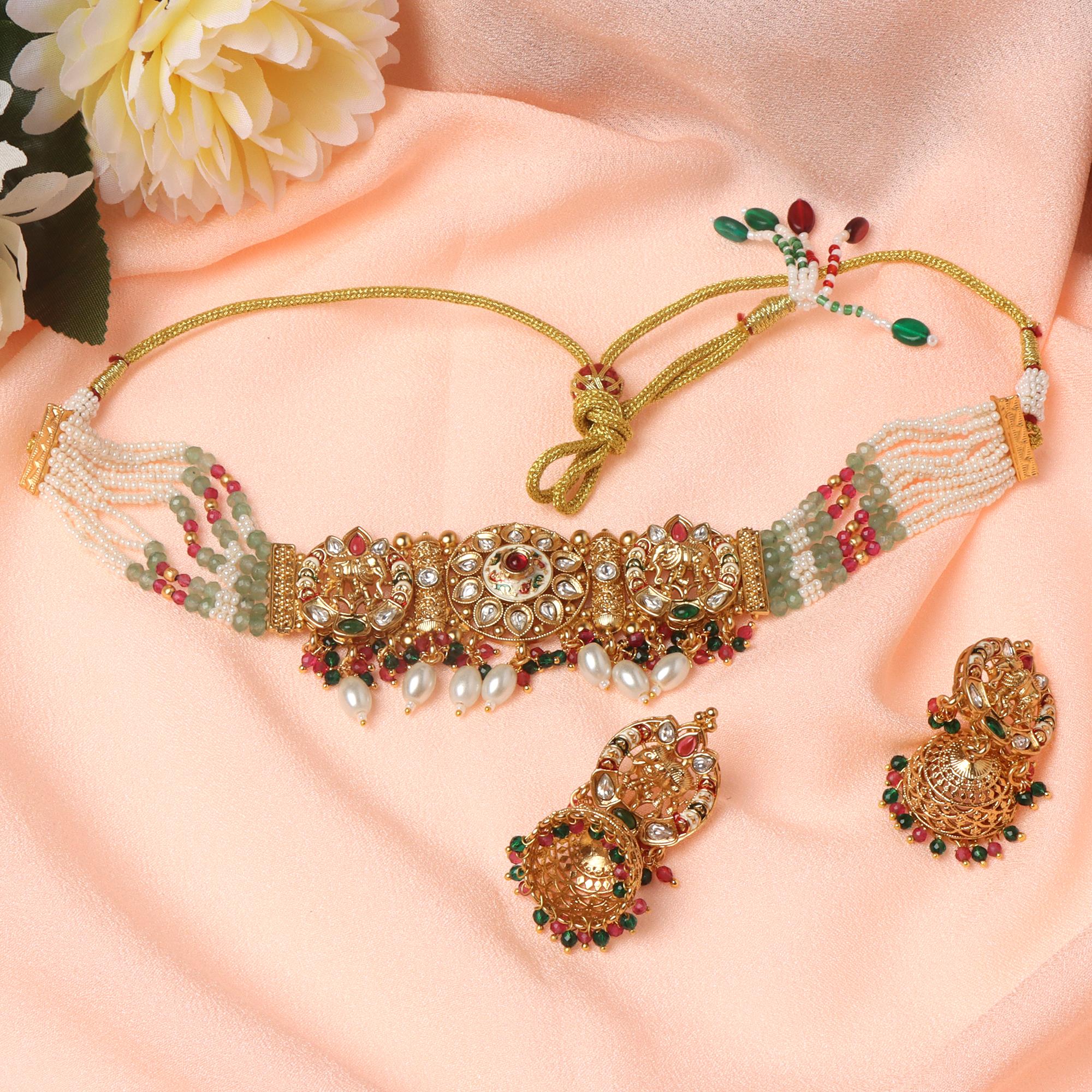 A stunning imitation jewelry set blending antique charm with traditional elegance. This choker-style necklace and earrings set is perfect for festive and bridal looks.