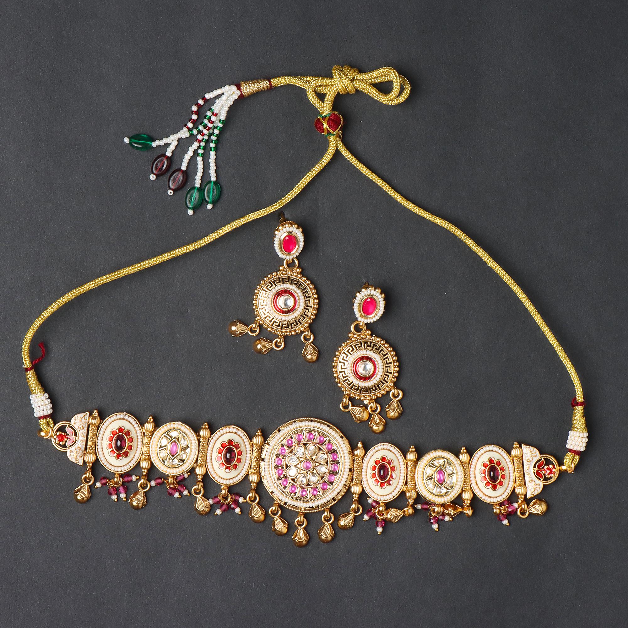 A dazzling imitation jewelry set featuring intricate Kundan work and delicate pearls. This elegant necklace and matching earrings radiate traditional charm for festive occasions.
