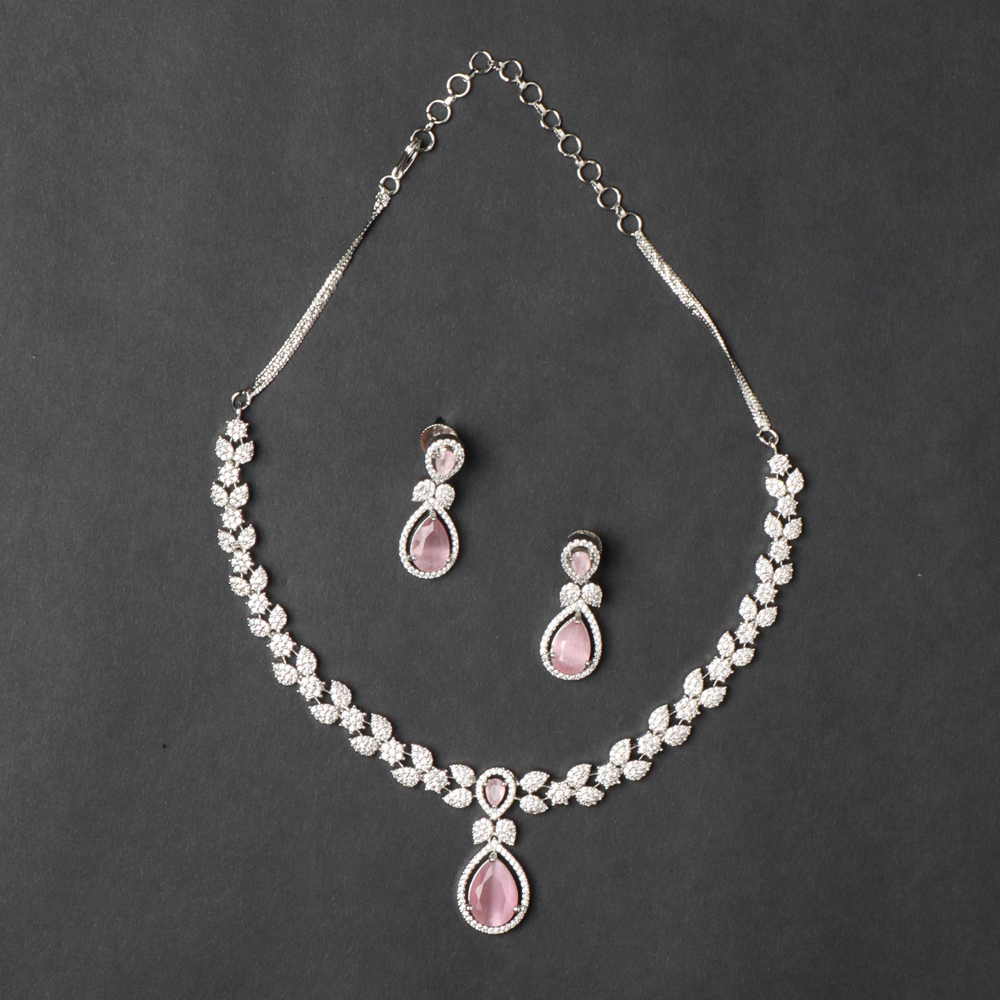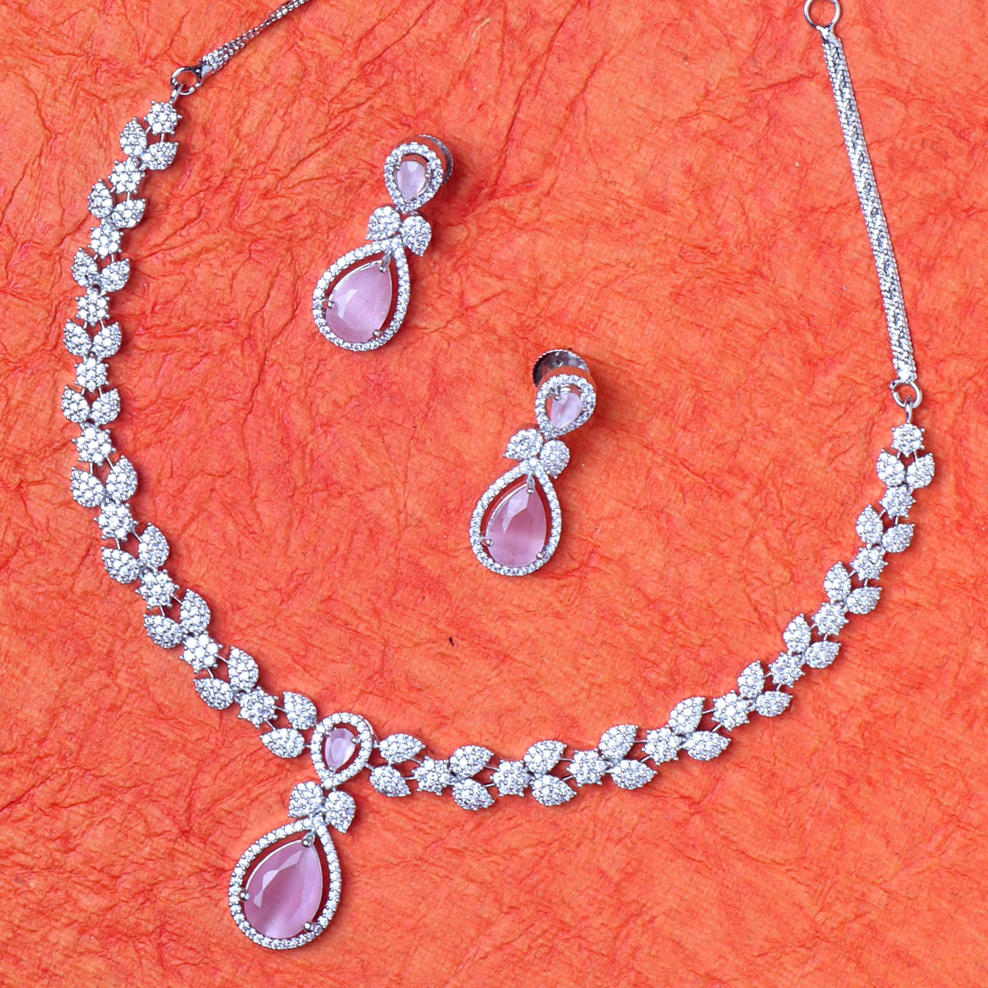 OrnaOra's elegant silver tone necklace and earring set features sparkling American diamonds in a delicate leaf design. This beautiful imitation jewelry adds sophisticated sparkle to any occasion.