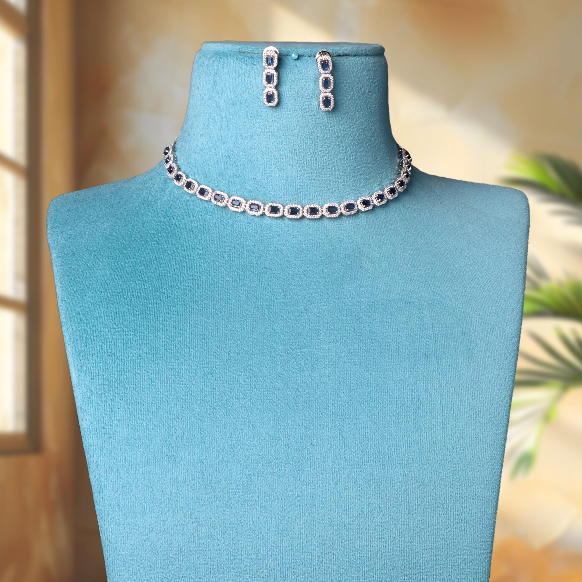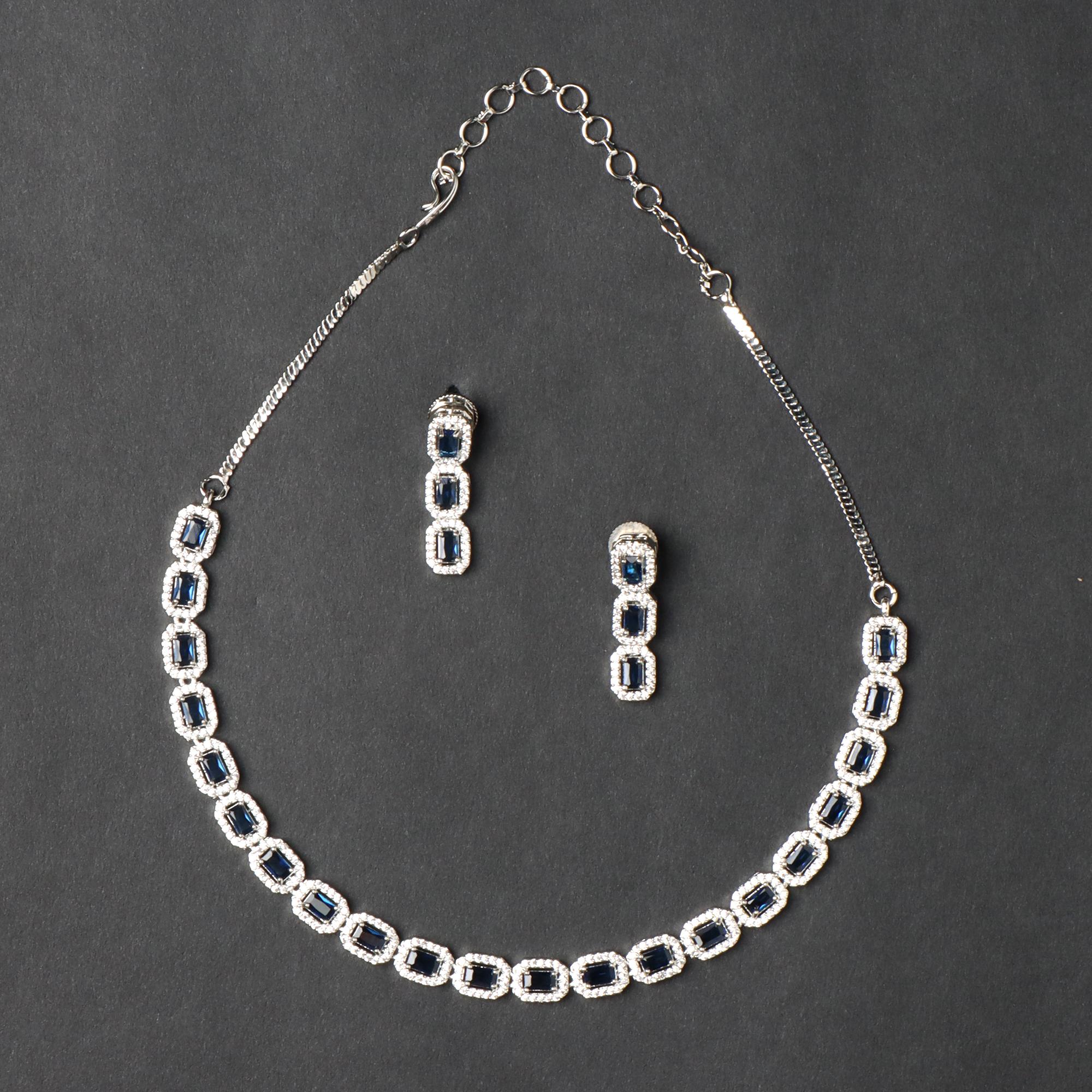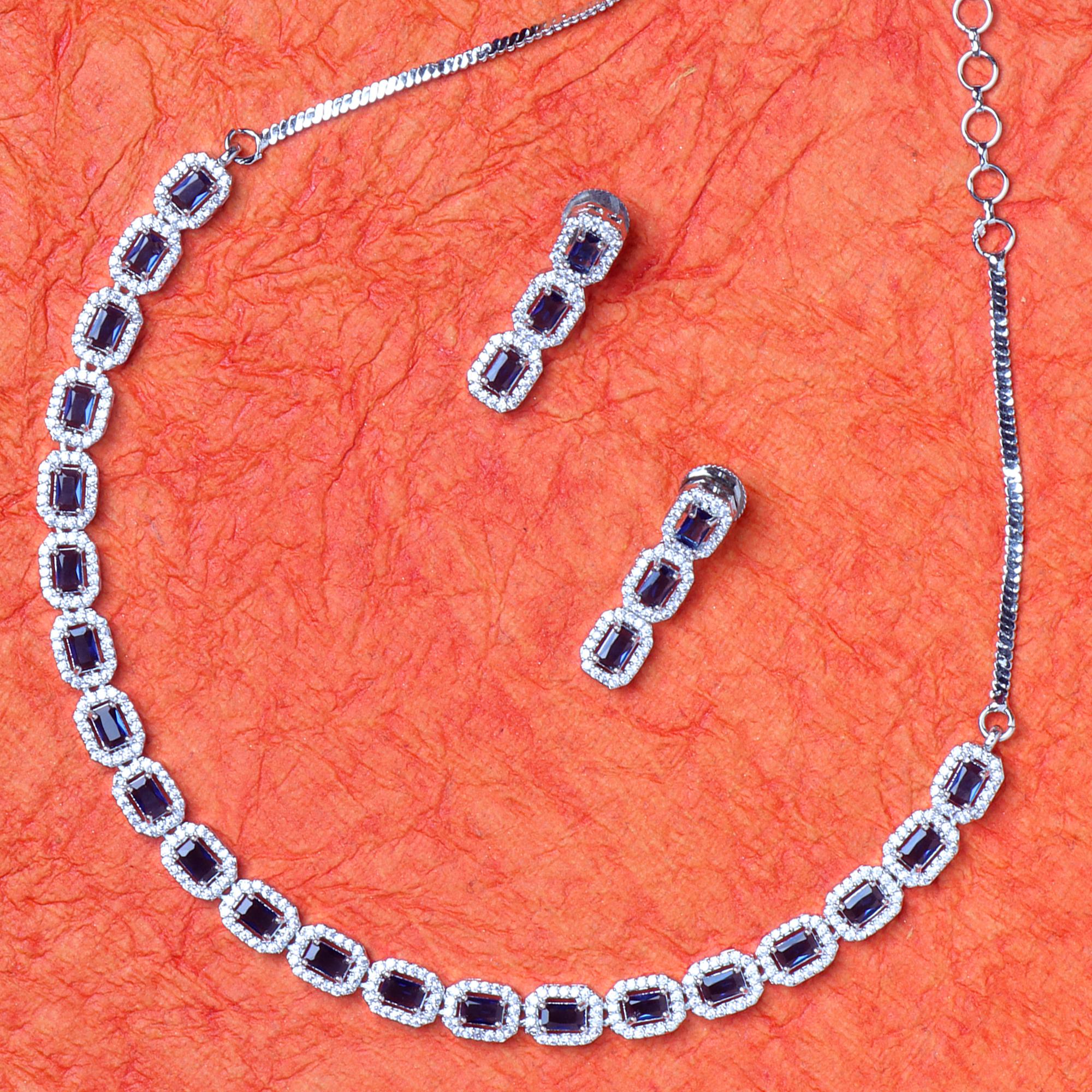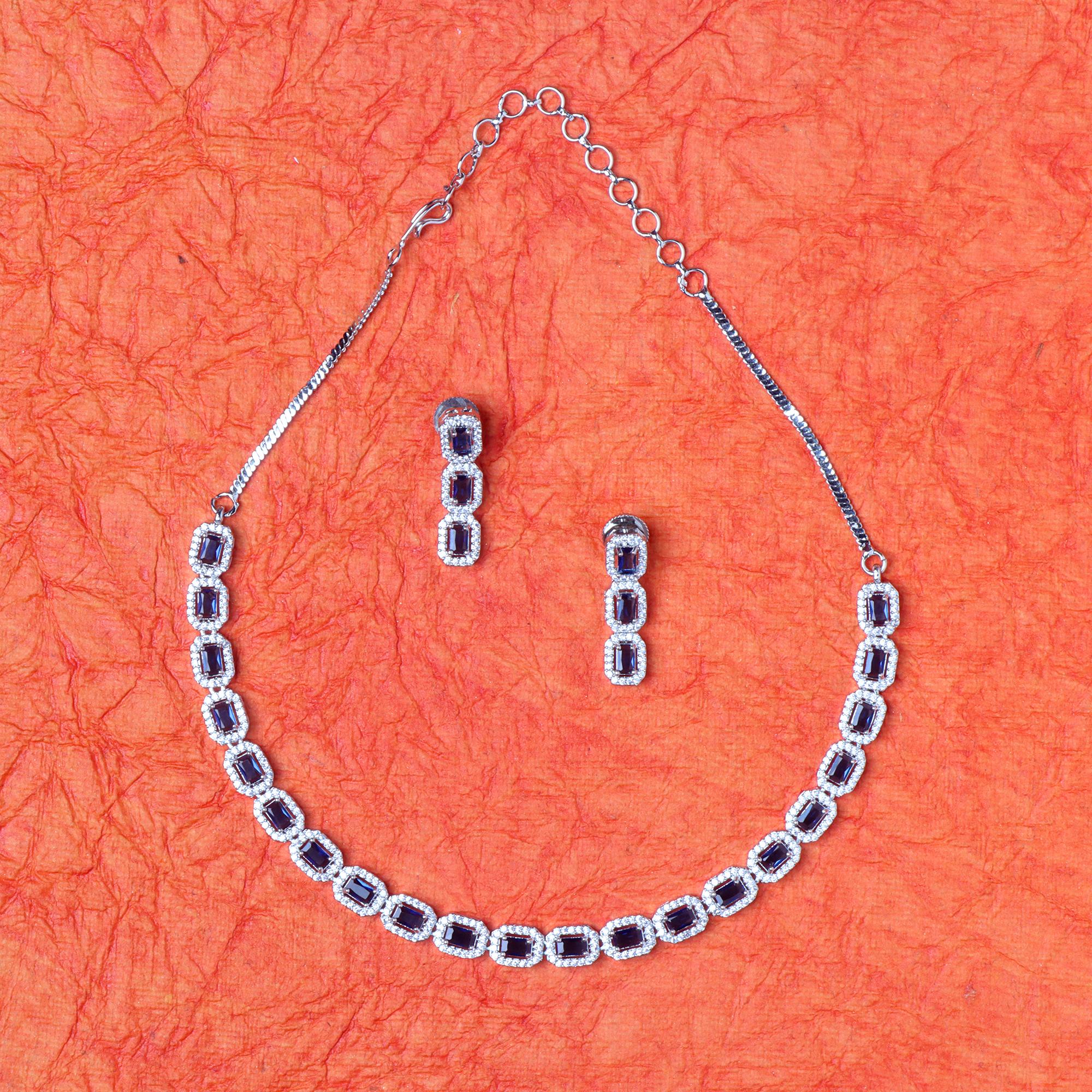 OrnaOra's elegant silver tone necklace and earring set features sparkling American diamonds and rich blue stones in a floral design. This imitation jewelry is perfect for special occasions.