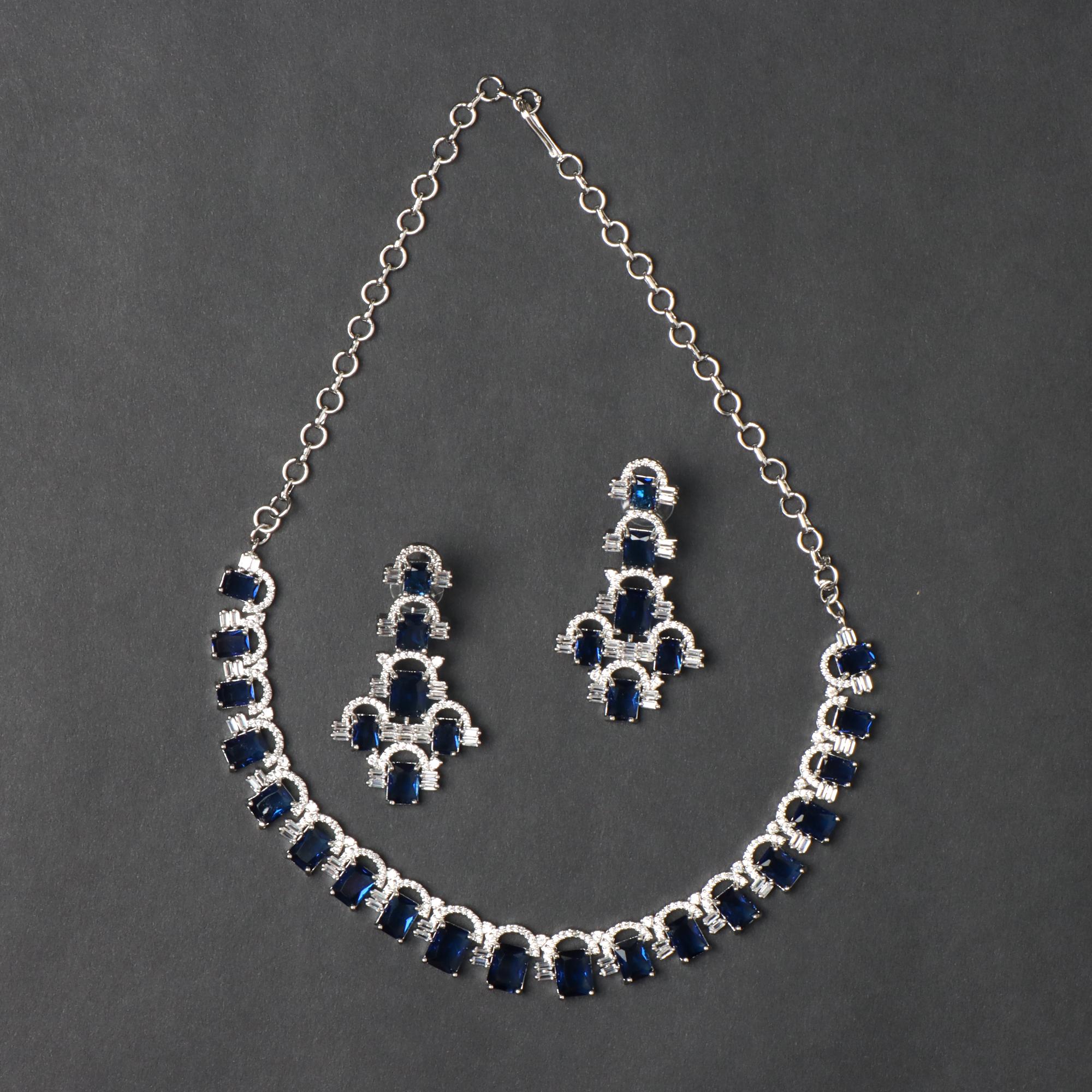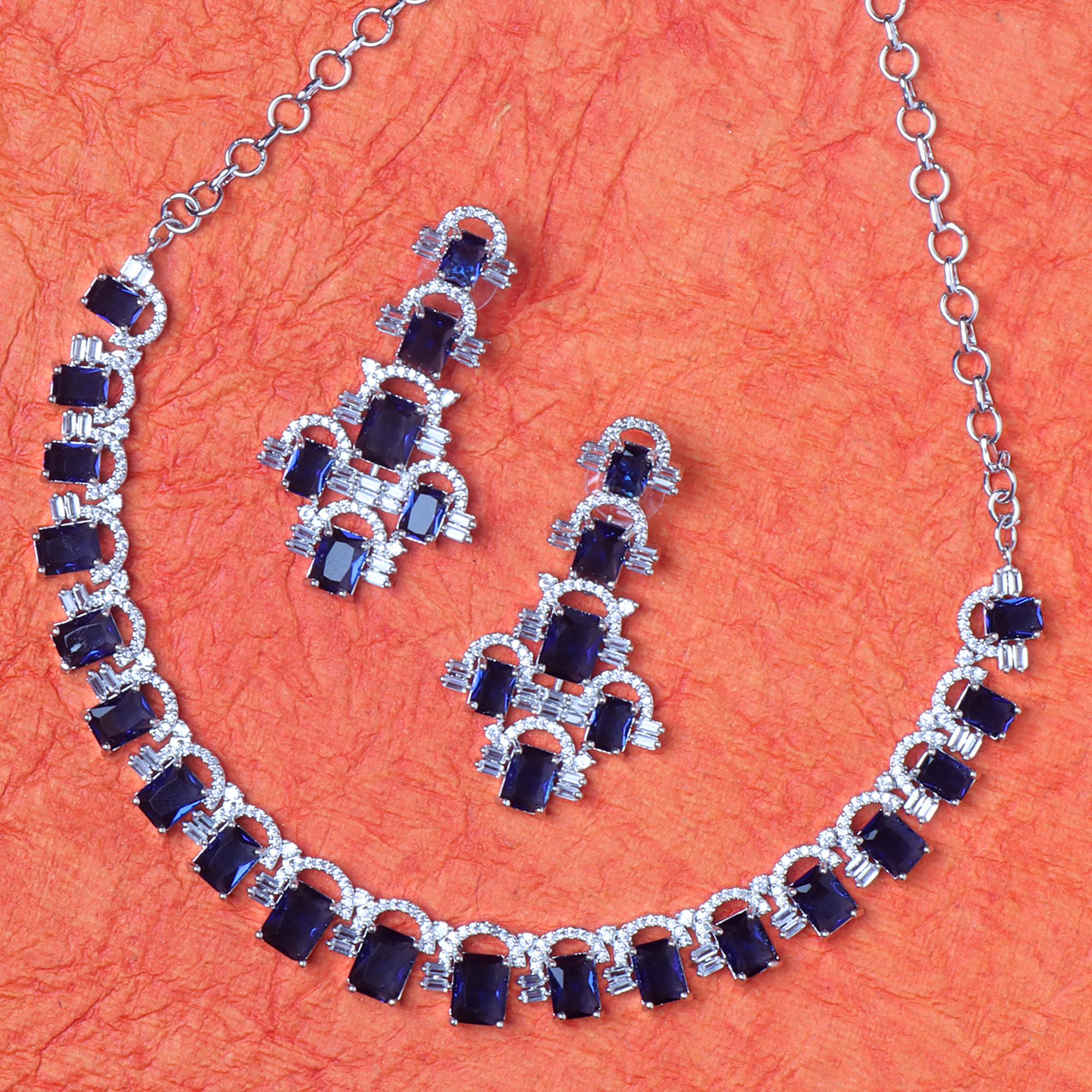 OrnaOra's elegant silver tone necklace and earring set features sparkling American diamonds and striking blue rectangular faux stones. This contemporary imitation jewelry adds a touch of glamorous sophistication.