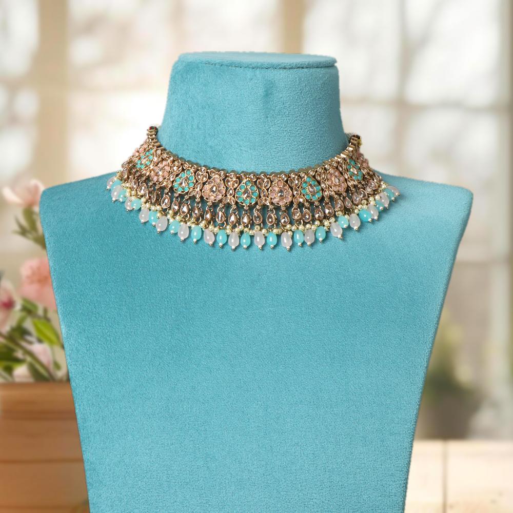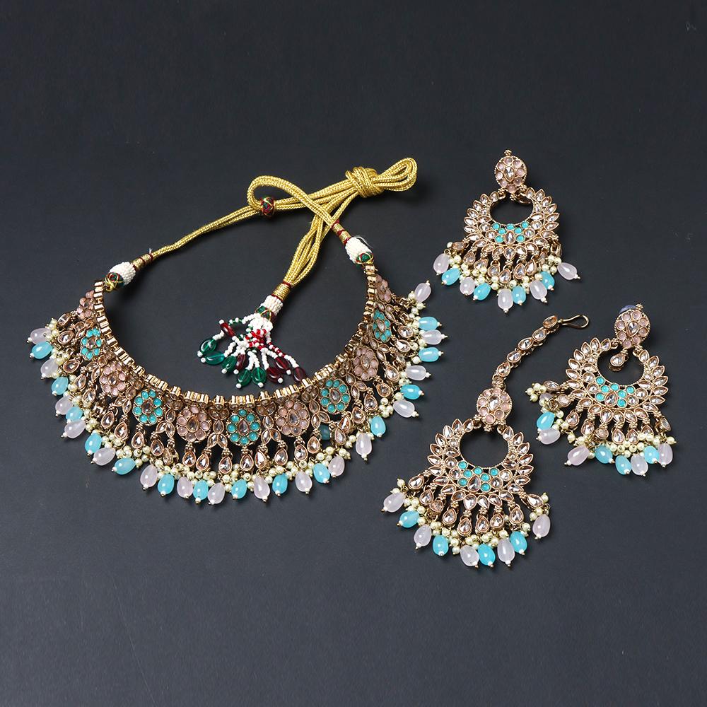 OrnaOra's imitation choker features an antique gold finish with intricate Kundan-style detailing and delicate faux pearl and blue bead drops. Includes matching imitation earrings and a maang tikka for a complete traditional look.