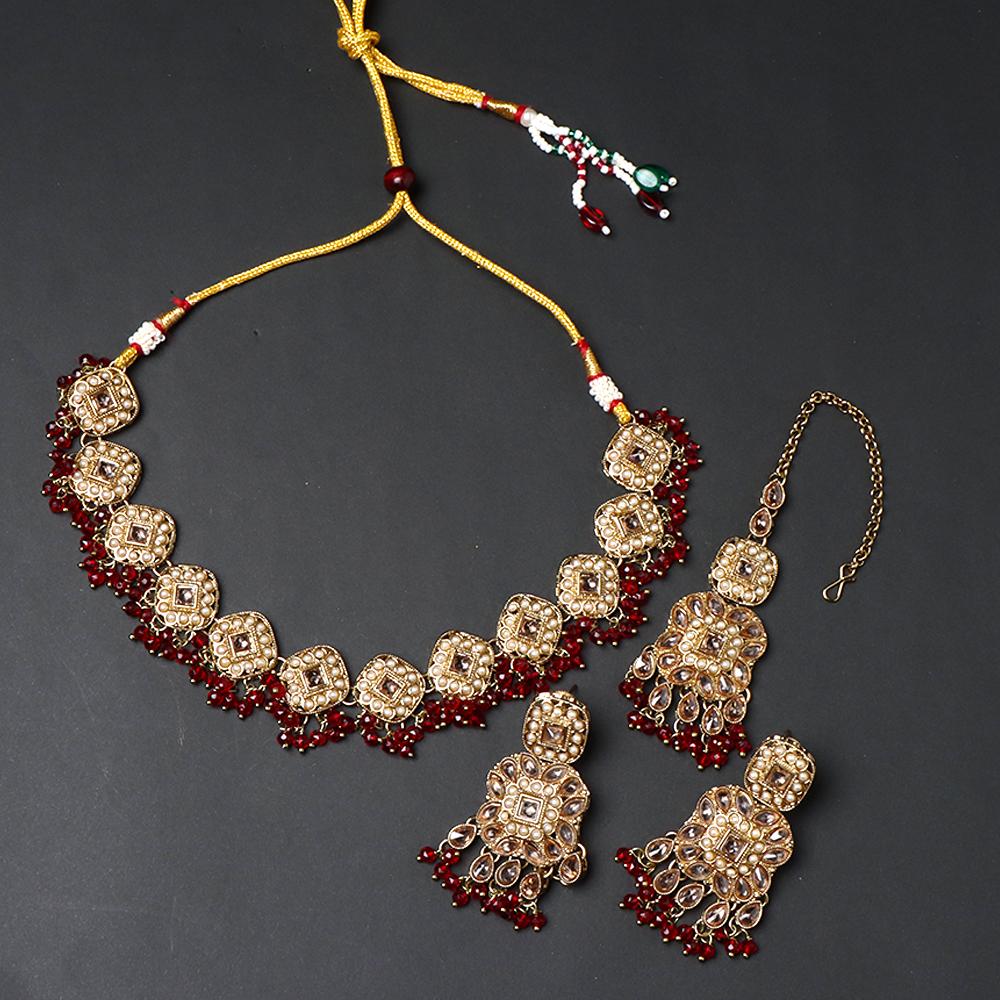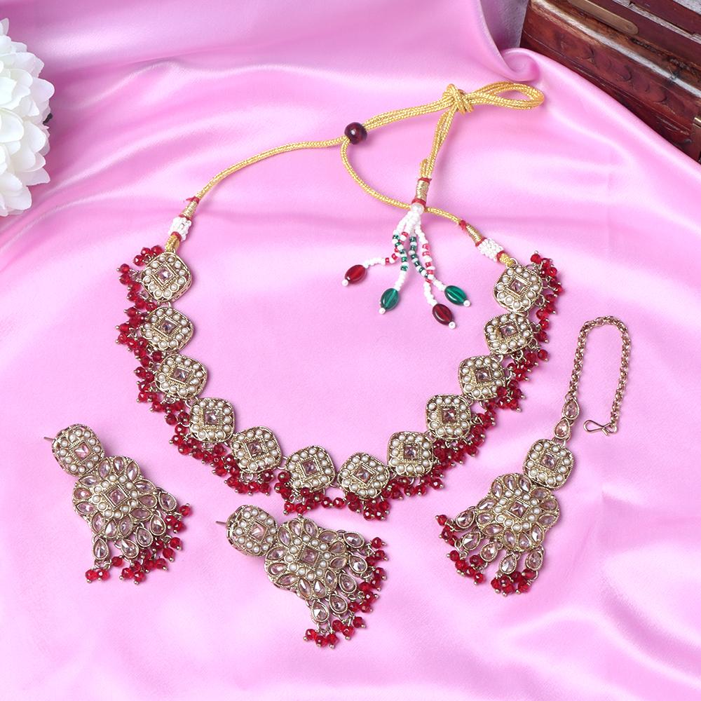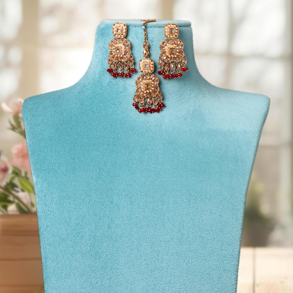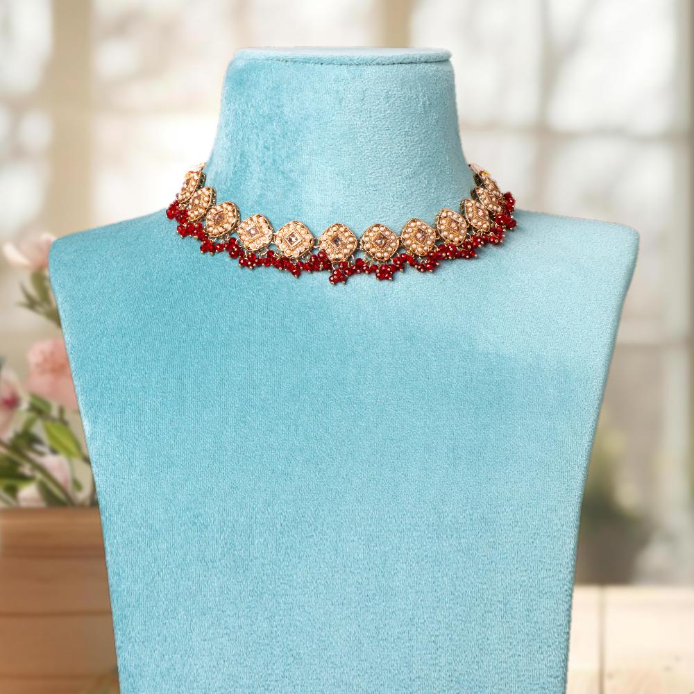 OrnaOra's graceful imitation jewelry set with intricate red beads and gold detailing, featuring a necklace and earrings. Ideal for festive occasions or traditional attire.
