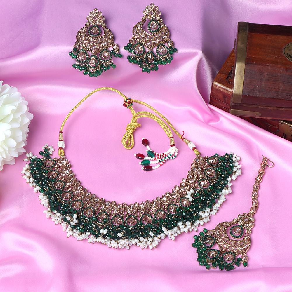 OrnaOra's imitation choker features intricate Kundan-style detailing with vibrant emerald green stone accents and delicate faux pearl drops. Includes matching imitation earrings and a beautiful maang tikka for a complete traditional look.