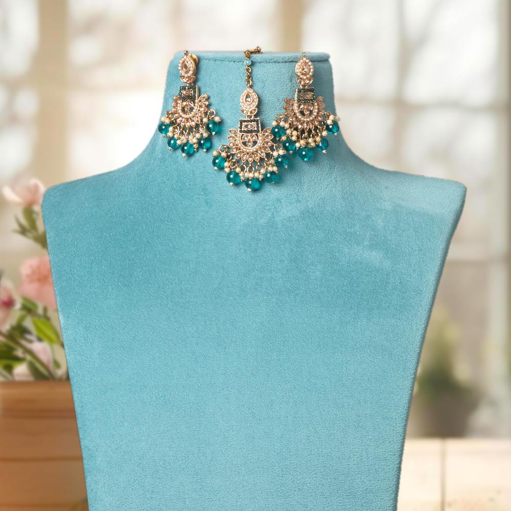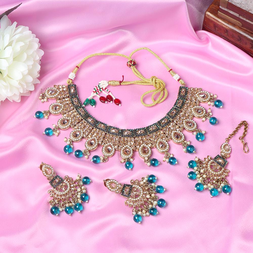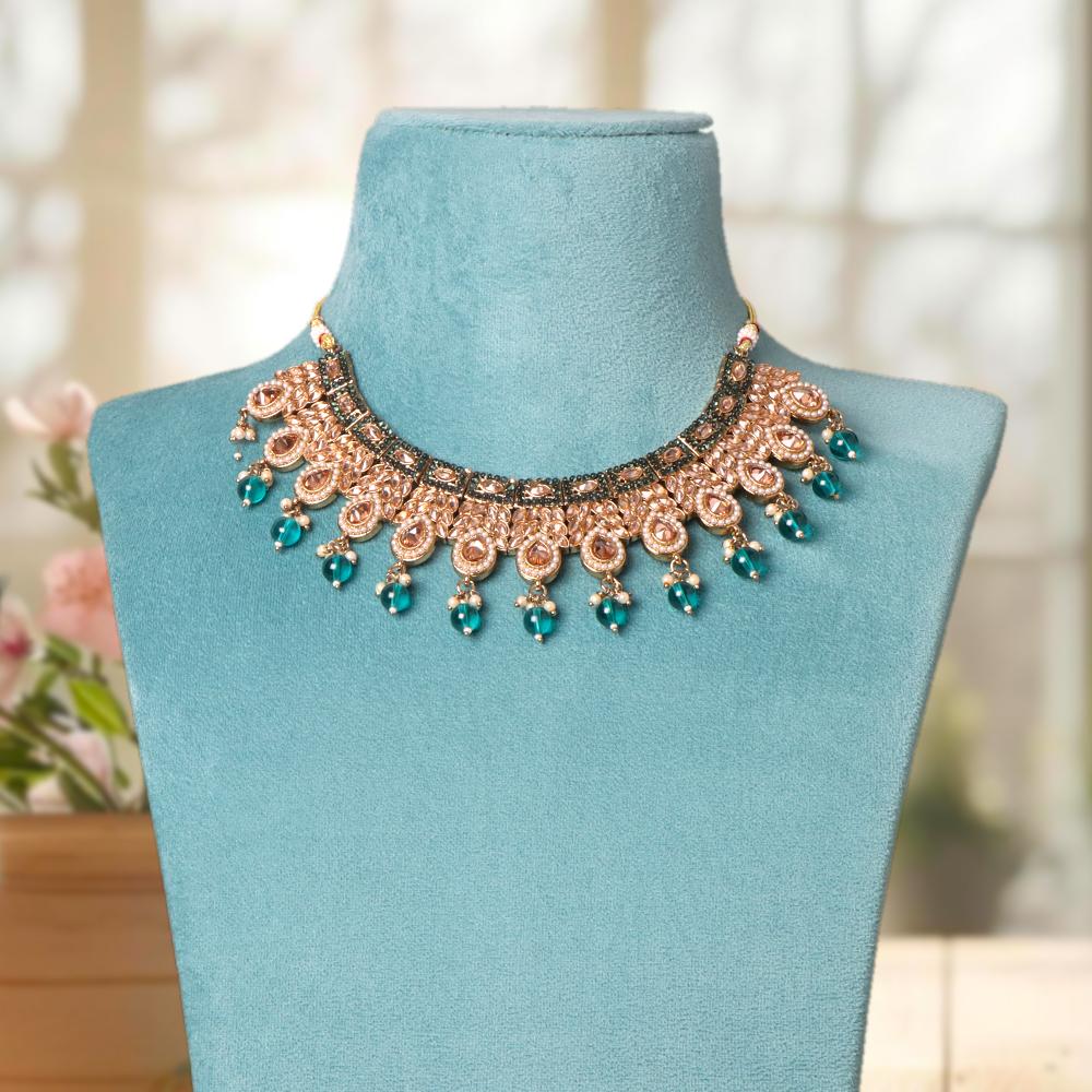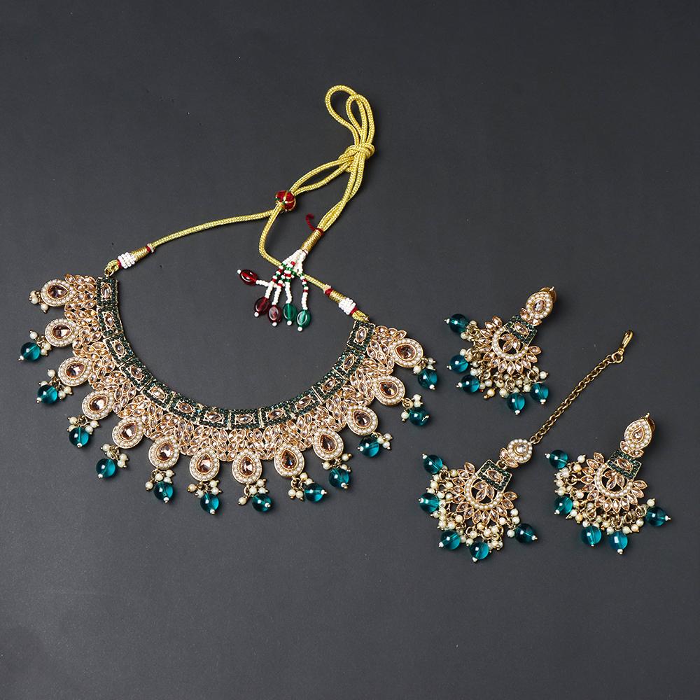 OrnaOra's imitation choker features intricate Kundan-style detailing with faux emerald drops. This elegant set includes matching imitation earrings and a delicate maang tikka, perfect for adding traditional charm to your look.