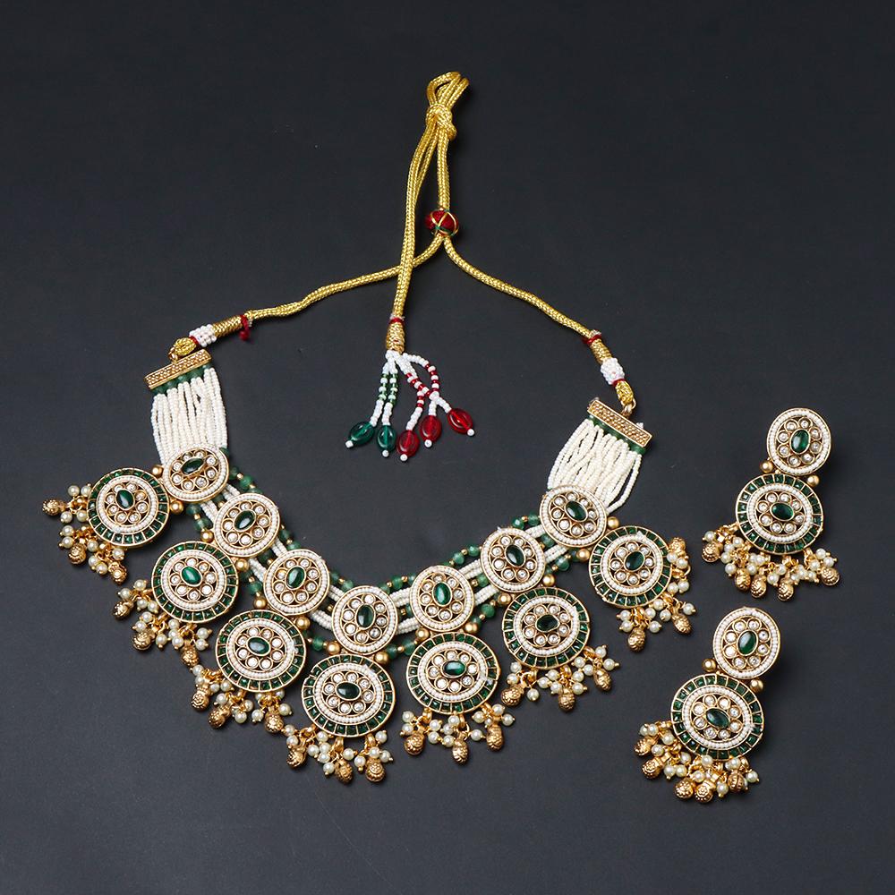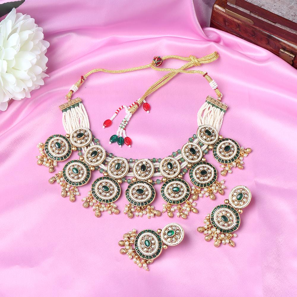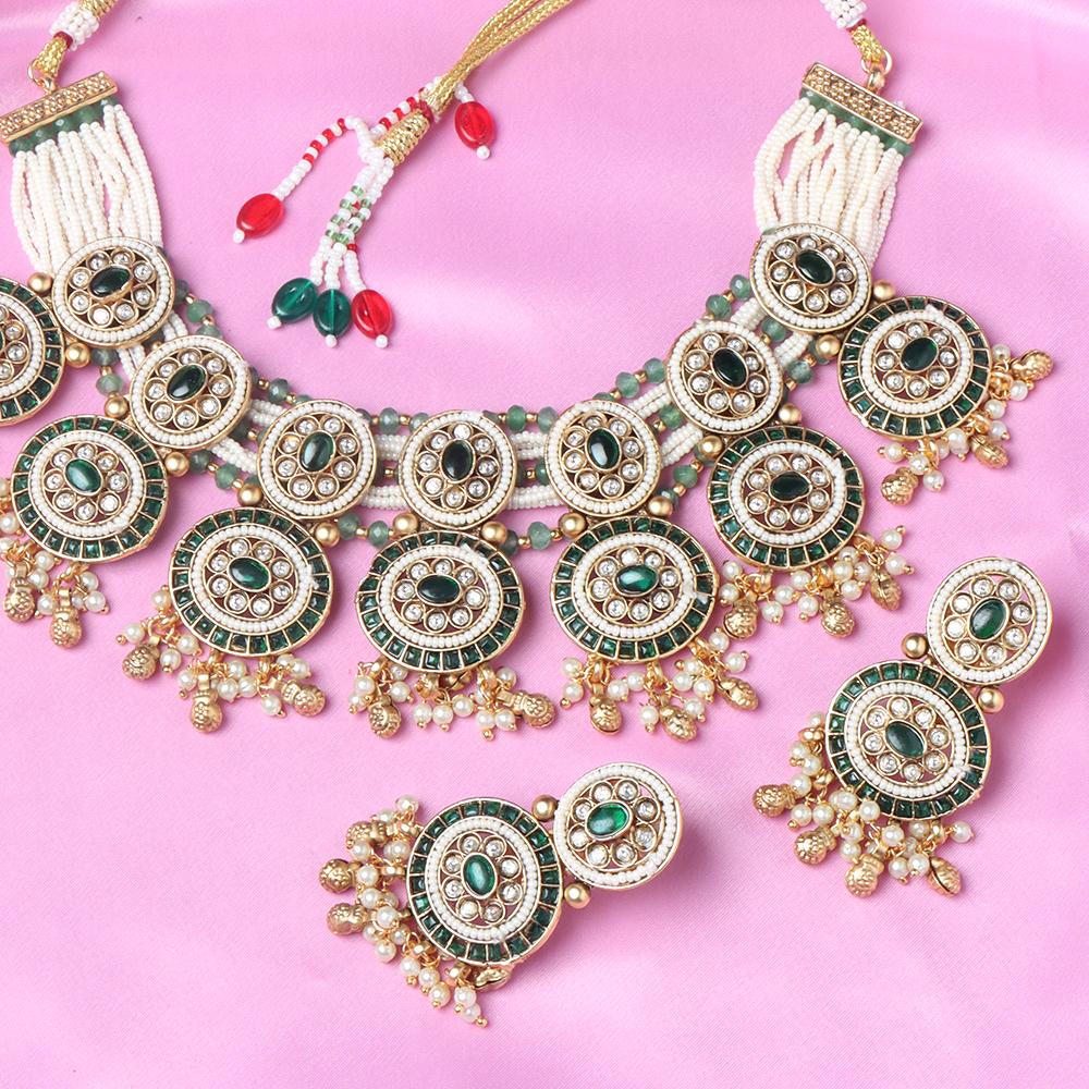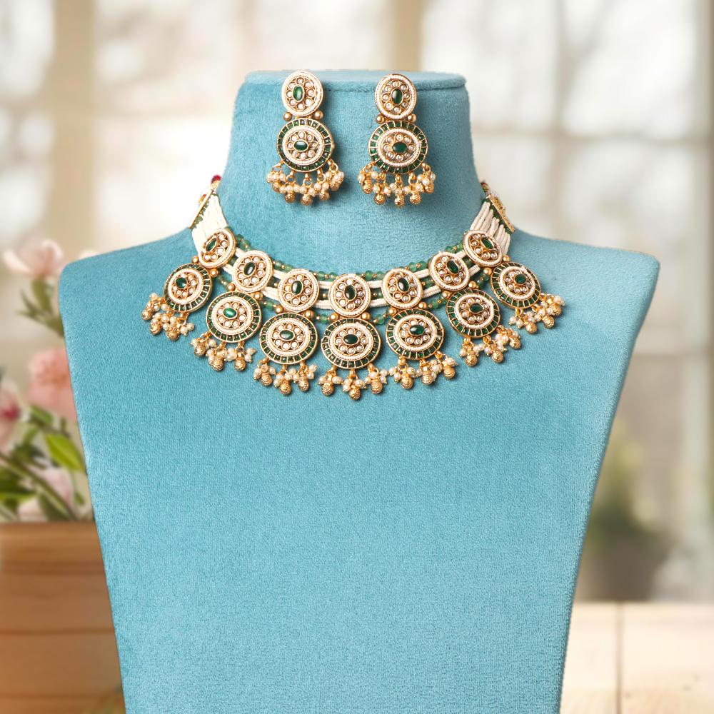 OrnaOra's imitation jewelry set features a layered choker with circular pendants adorned with green accents and faux pearls. Perfect for adding a traditional touch to weddings and festive occasions. Includes matching earrings.