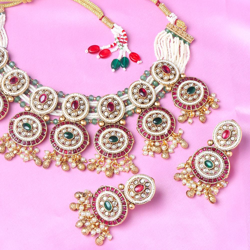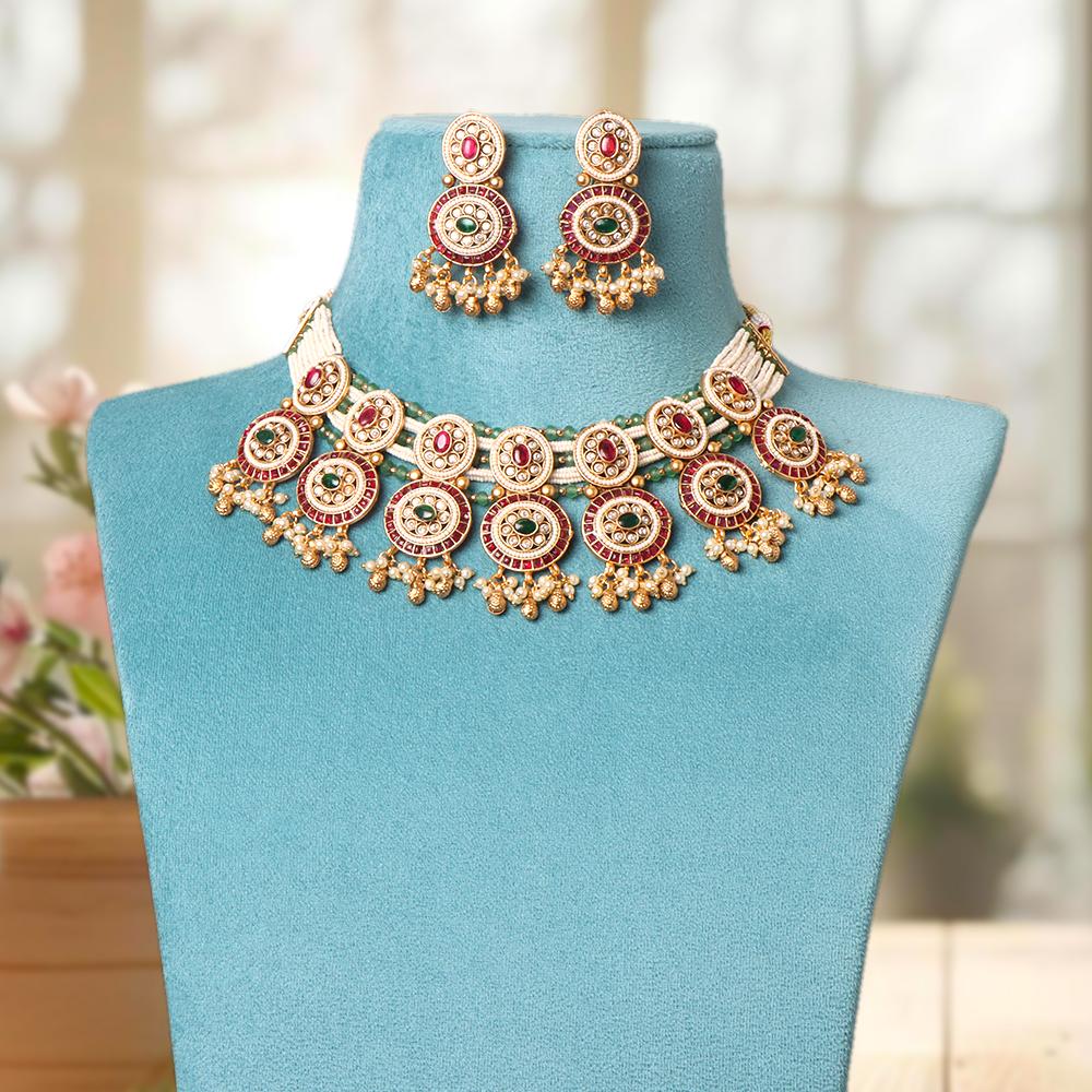 OrnaOra's imitation jewelry choker features circular pendants with vibrant red and green accents, complemented by delicate faux pearl drops. A stylish addition to festive and traditional outfits. Includes matching earrings.