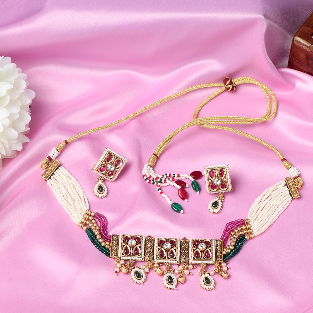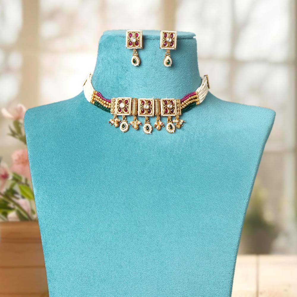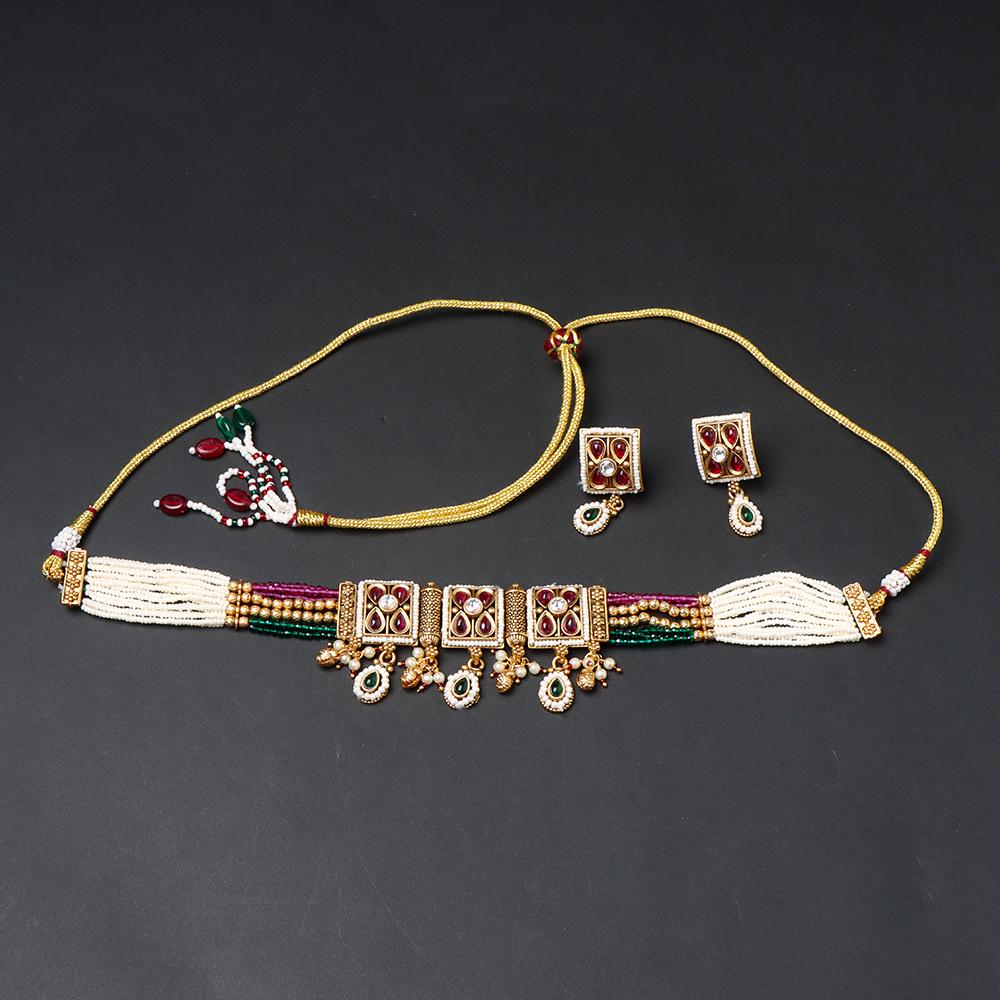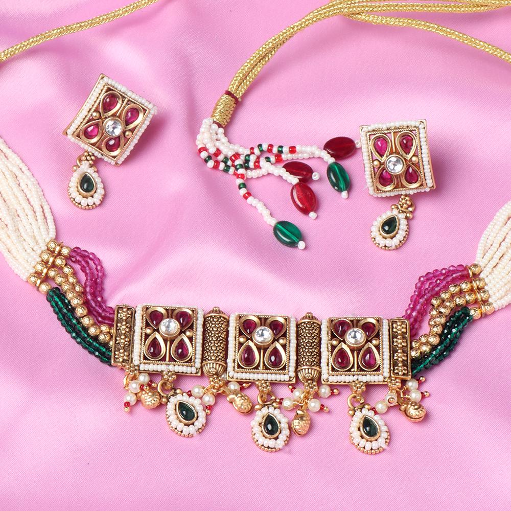 OrnaOra's imitation choker features detailed square pendants with faux ruby and emerald accents. Delicate artificial pearl drops enhance its traditional charm. Perfect for festive occasions. Includes matching imitation earrings.