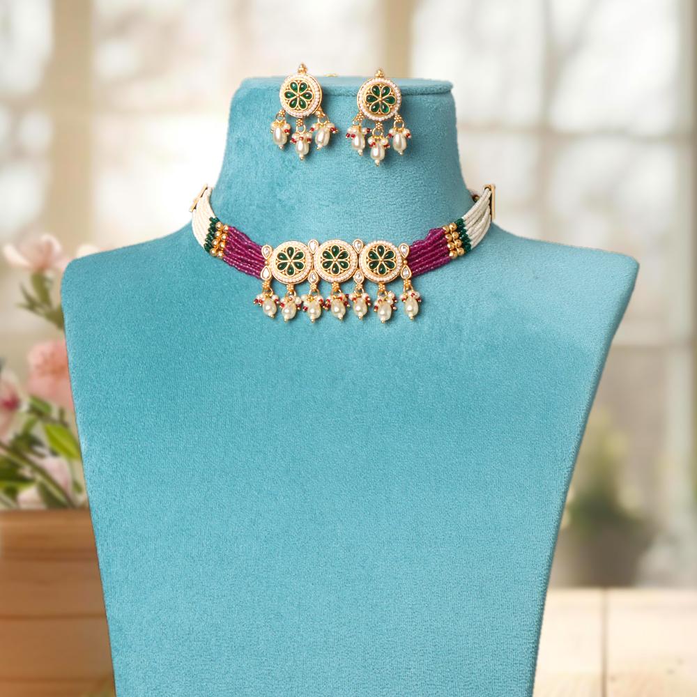 OrnaOra's imitation necklace features floral-inspired pendants with green accents and delicate faux pearl drops. The intricate design adds a touch of traditional charm. Comes with matching imitation earrings.