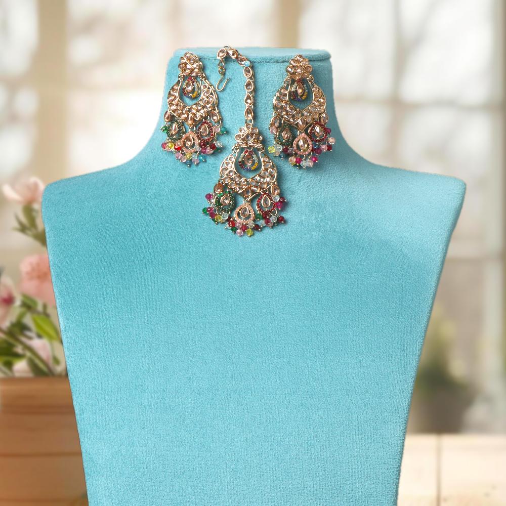 OrnaOra recommends pairing this opulent imitation jewelry set with a bridal lehenga or a rich silk saree for a grand and sophisticated wedding or festive occasion. The maang tikka adds a majestic touch.