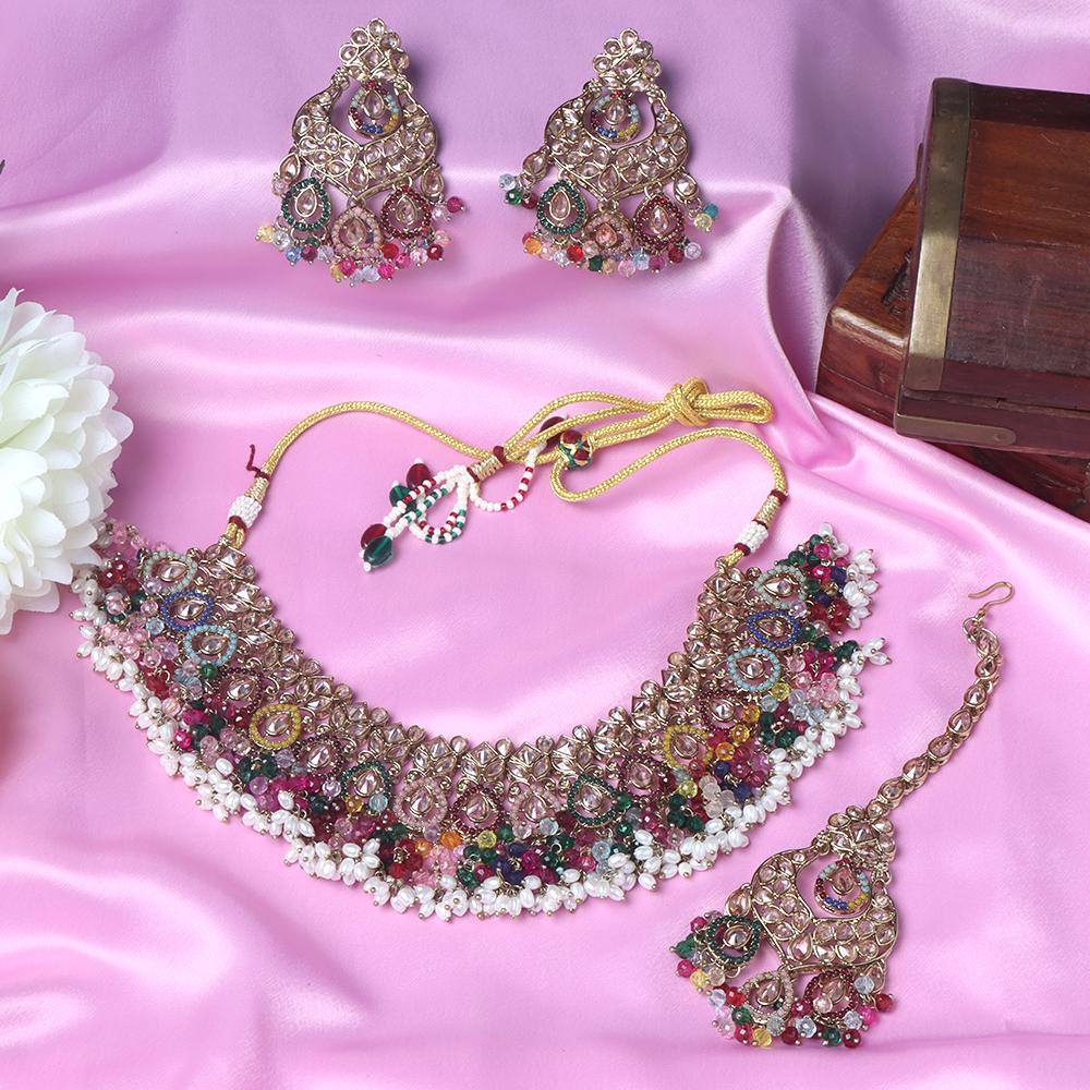 OrnaOra's imitation jewelry set features a broad, intricately designed choker with vibrant multicolor Kundan-style stones and delicate faux pearl accents. Includes matching statement imitation earrings and a regal maang tikka.