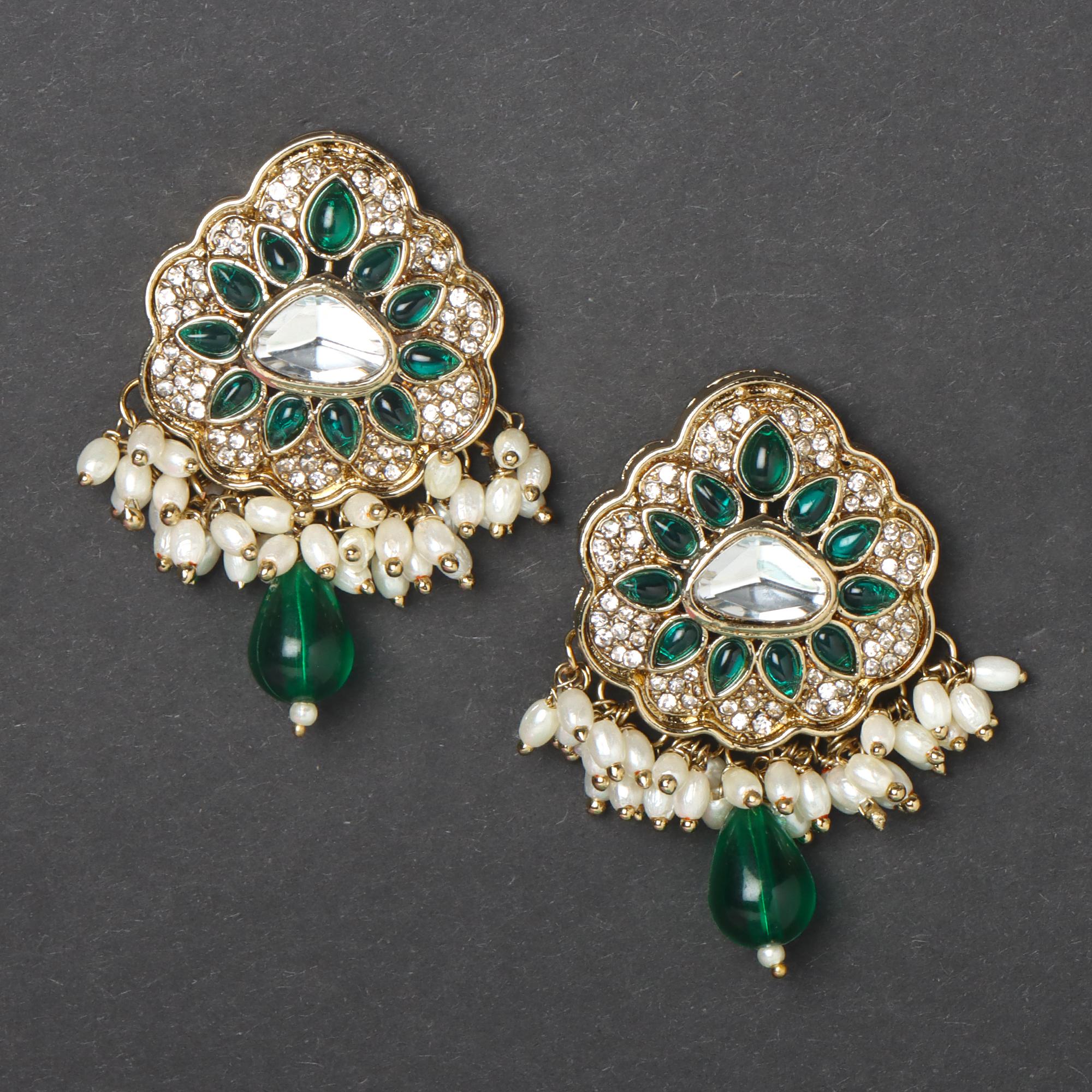 OrnaOra's vibrant imitation Green Stone Stud earrings feature a gold tone finish with sparkling faux stones, rich green and multi-coloured accents, imitation pearls, and a green bead drop. Charming imitation jewelry.