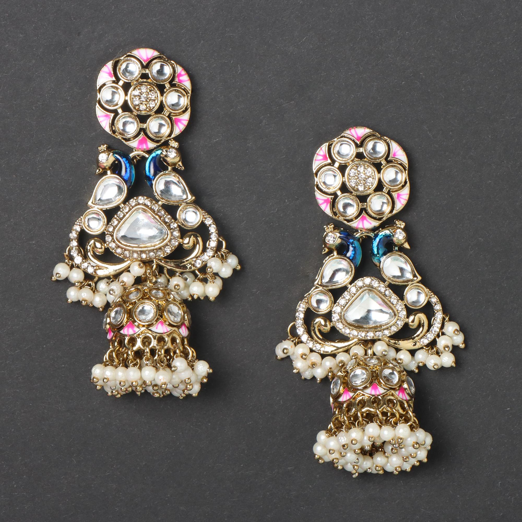 OrnaOra's beautiful imitation Ivory Bhagya Jhumkis feature a gold tone finish with sparkling faux stones, delicate pink and blue enamel peacock design, and elegant imitation pearl drops. Charming imitation jewelry.