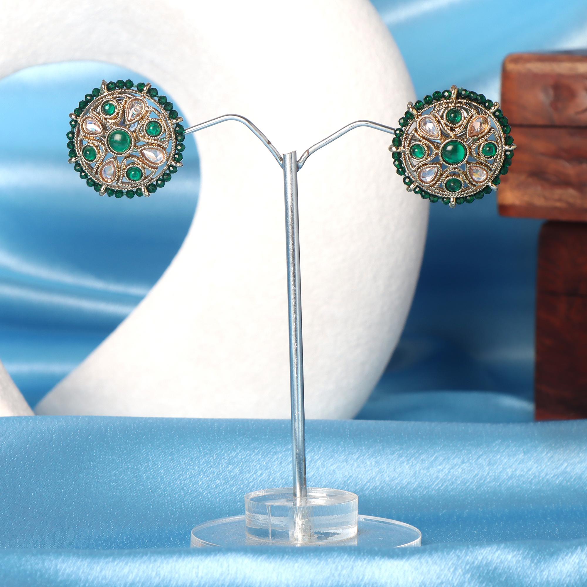 OrnaOra's vibrant imitation stud earrings feature a gold tone finish with dazzling faux kundan and green stones, bordered by green imitation beads. These round imitation earrings add a pop of colour.