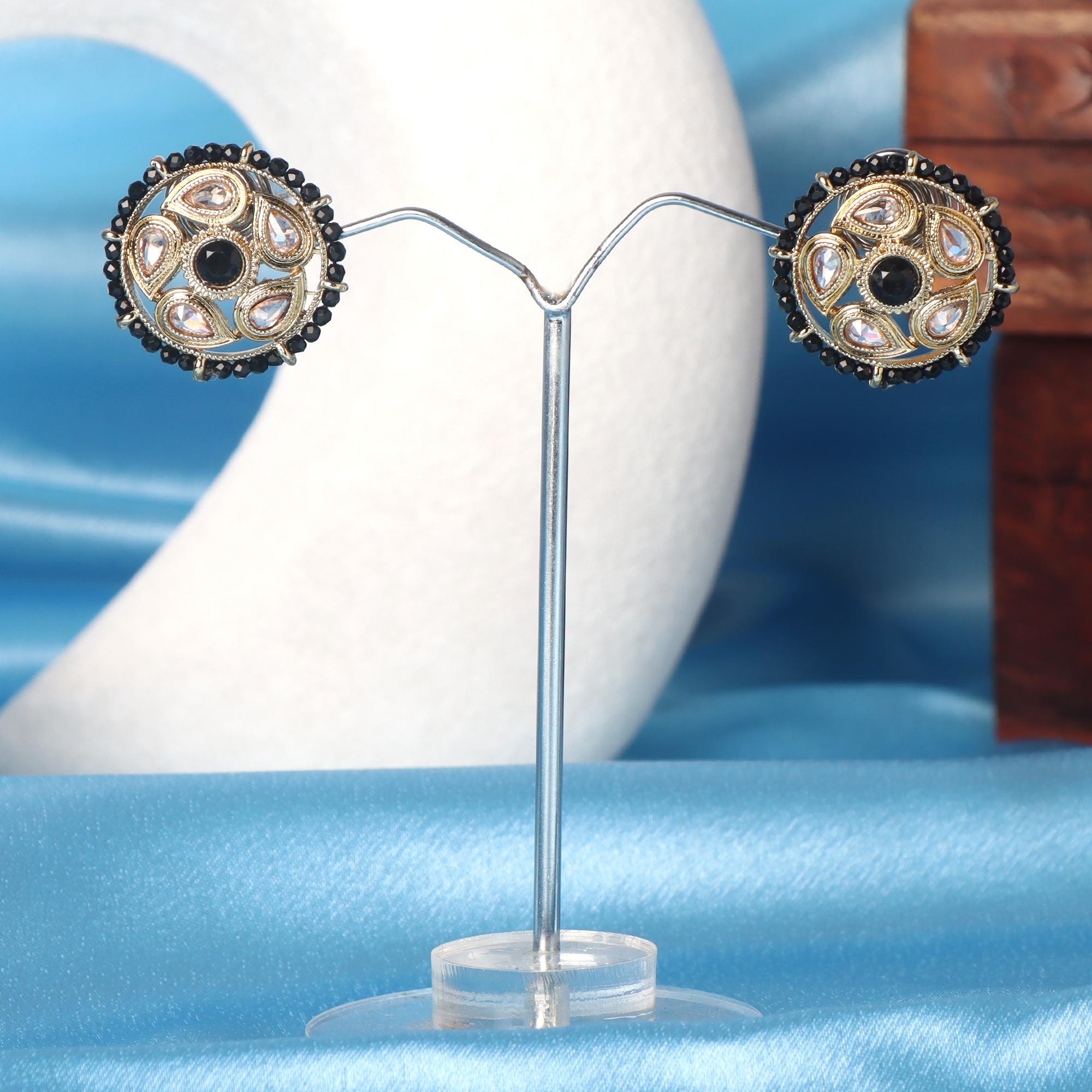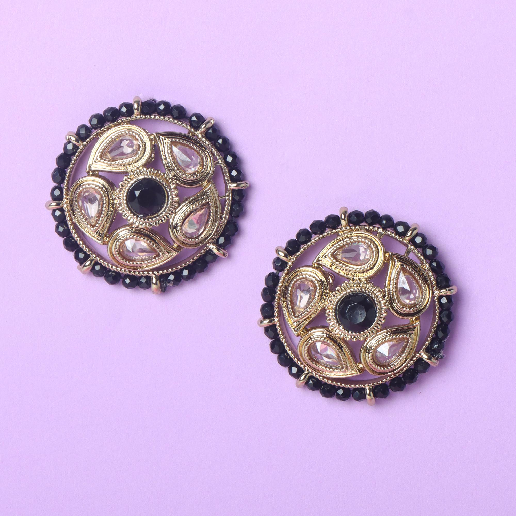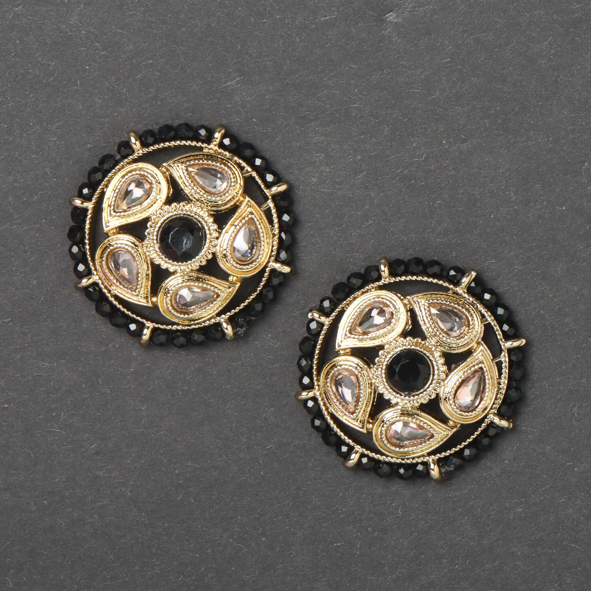OrnaOra's elegant imitation stud earrings feature a gold tone finish with sparkling faux kundan stones, a central black stone, and a black bead border. These classic imitation earrings offer refined style.