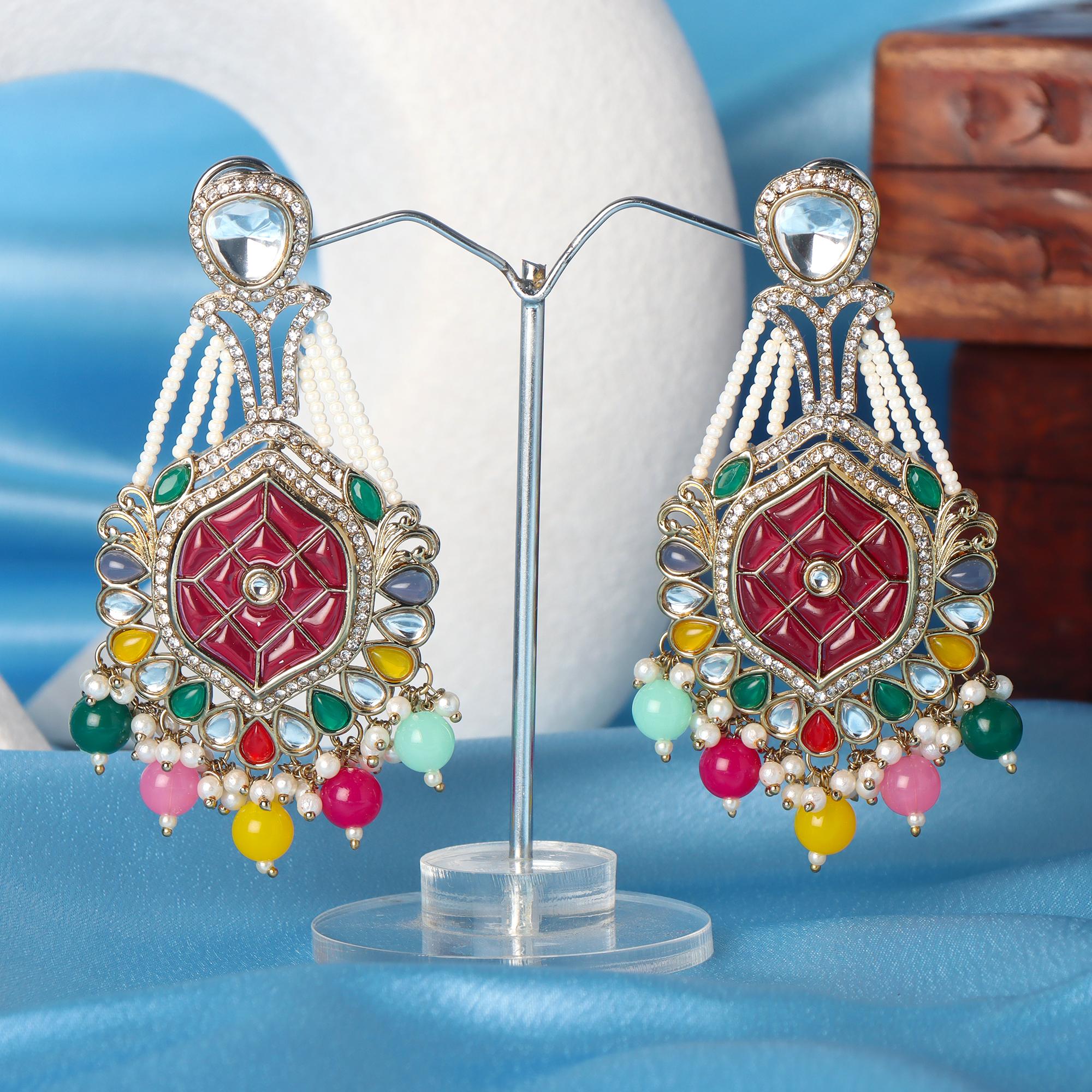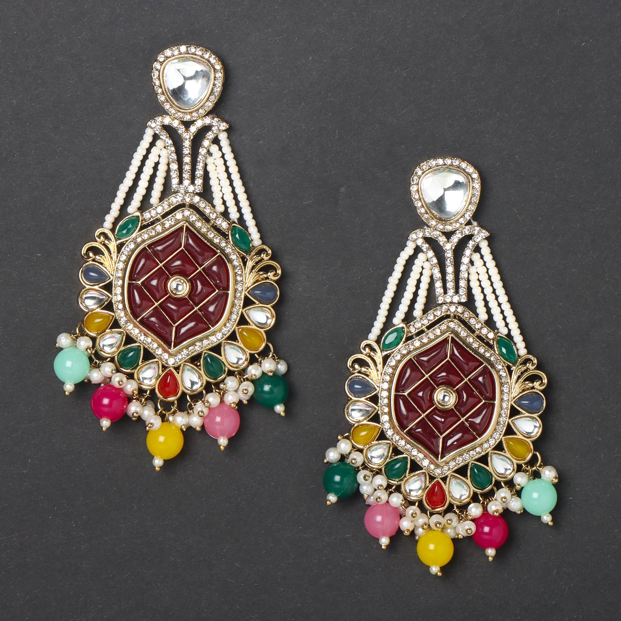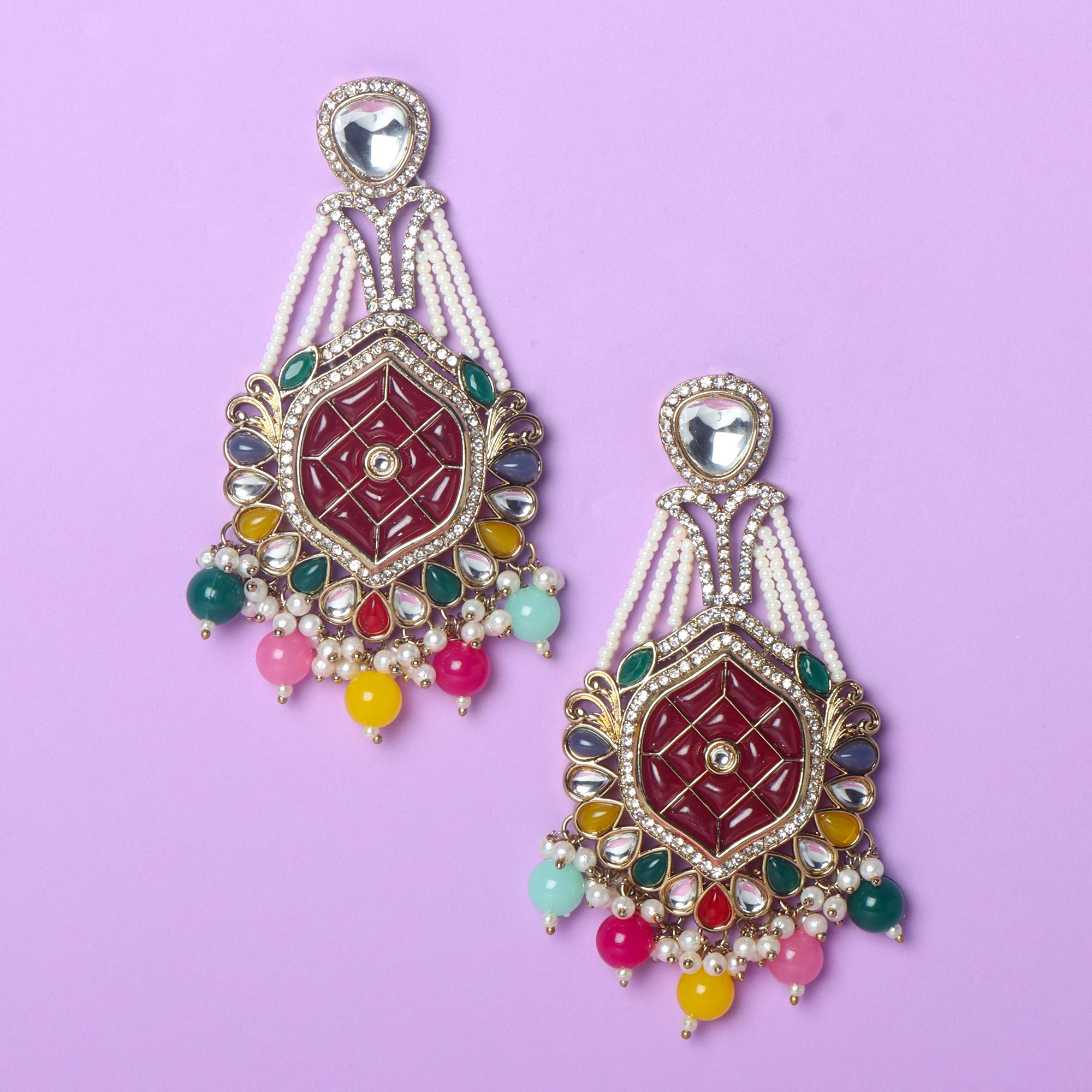 OrnaOra's vibrant imitation Multicolor Kundan Meenakari earrings feature a gold tone finish with sparkling faux kundan, patterned meenakari style center, multi-coloured accents, and imitation pearl/bead drops. Stunning imitation jewelry.