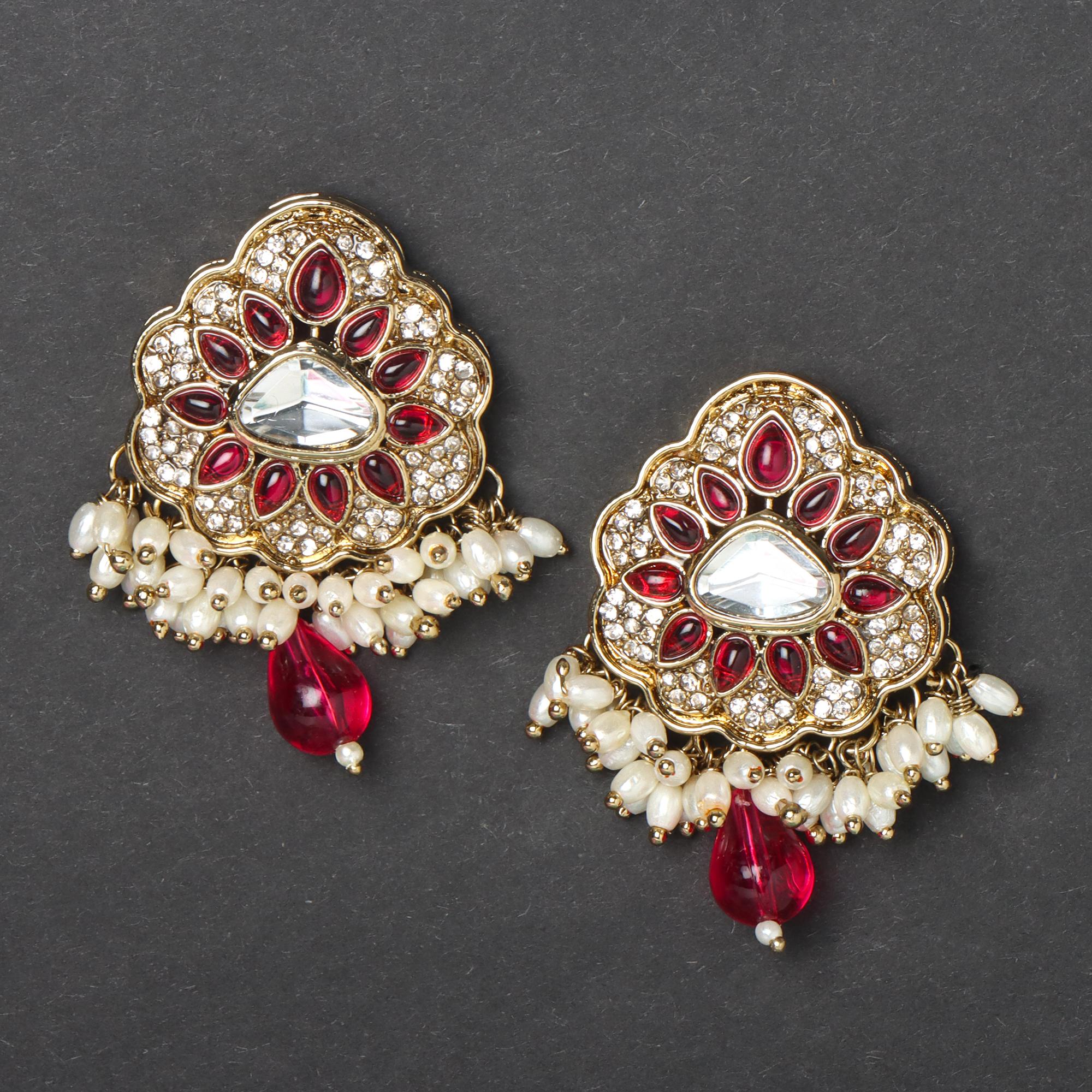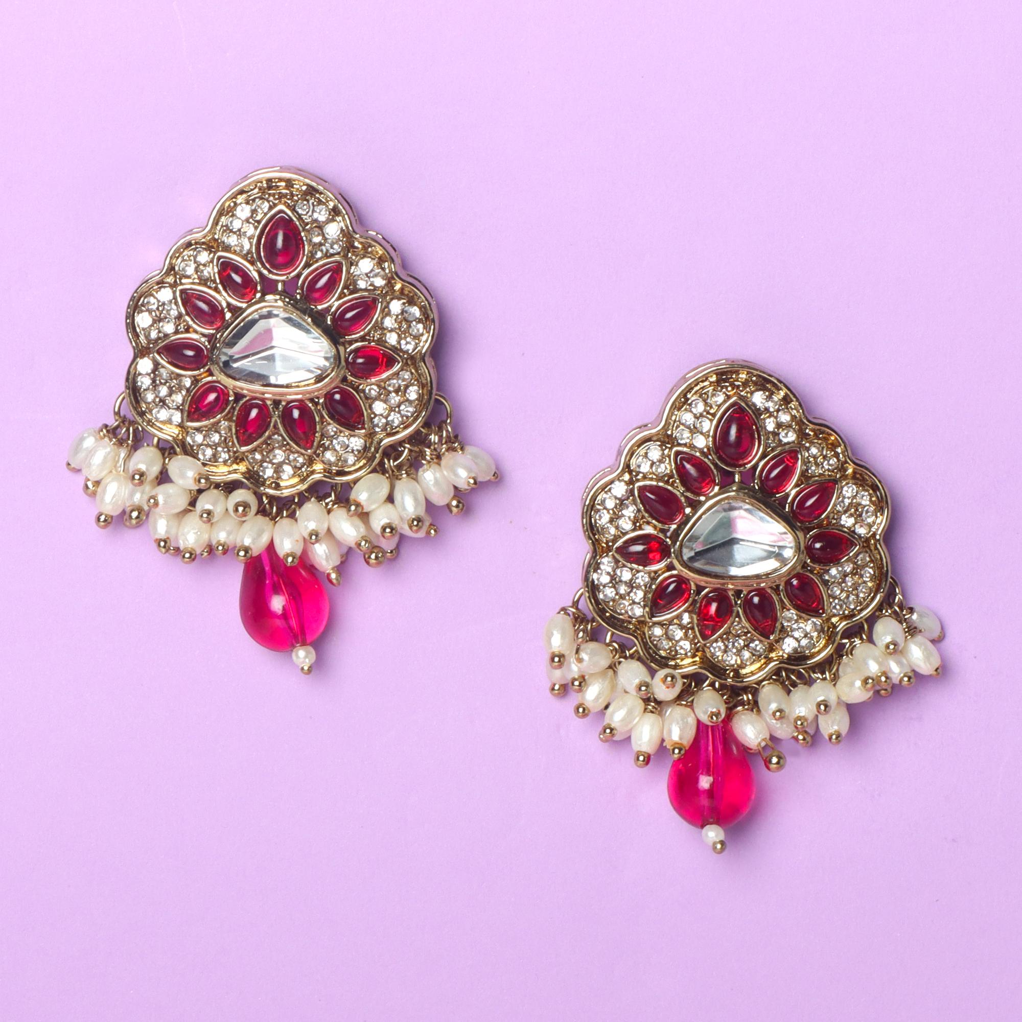 OrnaOra's vibrant imitation Rani Miraya Kundan studs feature a gold tone finish with sparkling faux kundan, red and multi-coloured stone accents, imitation pearls, and a maroon bead drop. Charming imitation jewelry.