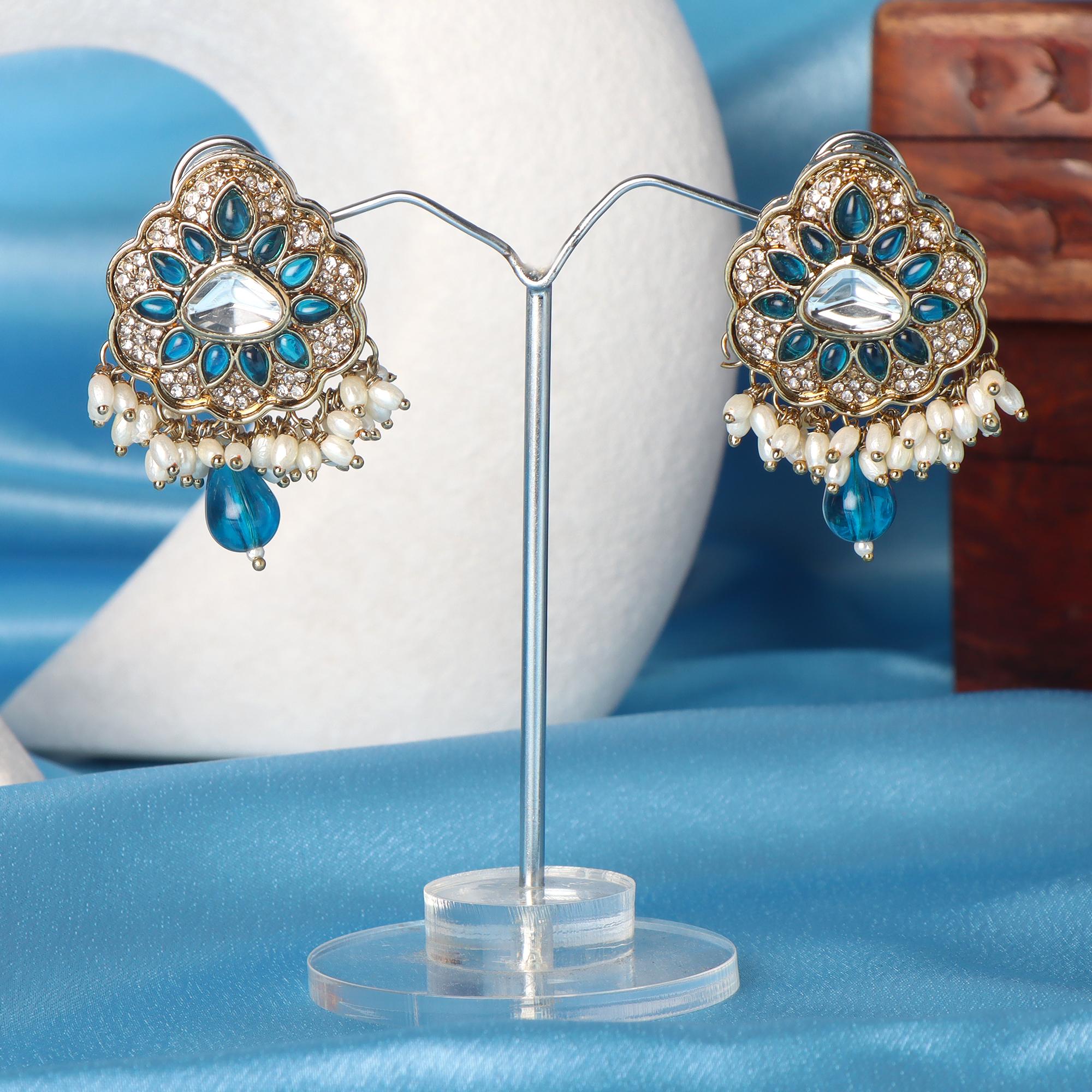 OrnaOra's striking imitation Sapphire Moissanite studs feature a gold tone finish with sparkling faux stones, rich sapphire blue accents, colourful details, imitation pearls, and a blue bead drop. Elegant imitation jewelry.