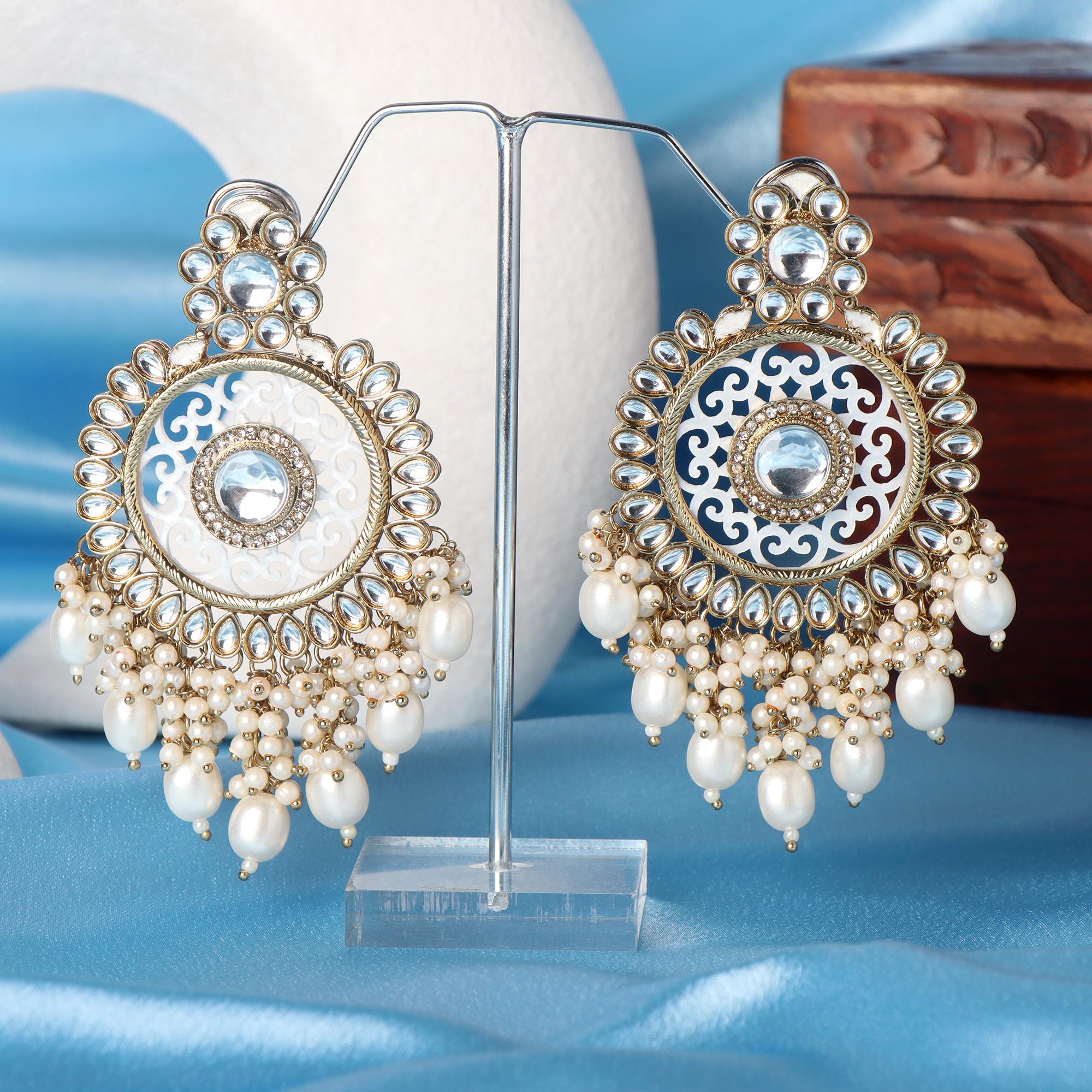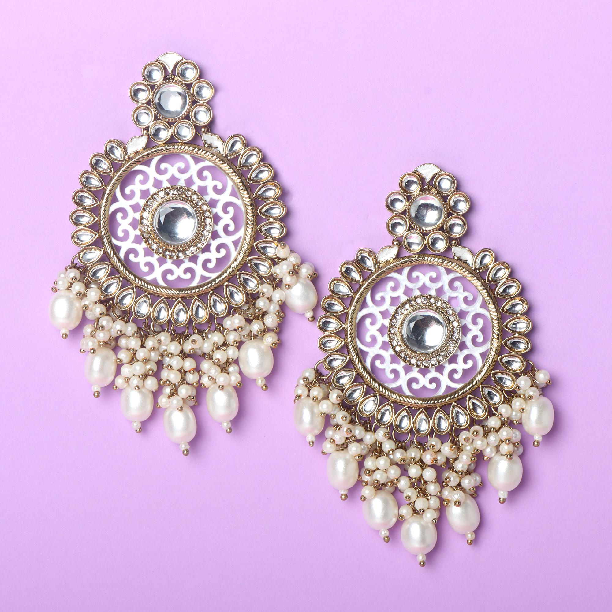 OrnaOra's beautiful imitation Ivory Miraya Chandbalis feature a gold tone finish with sparkling faux kundan stones, elegant ivory enamel details, imitation pearls, and white bead drops. Dramatic imitation jewelry.