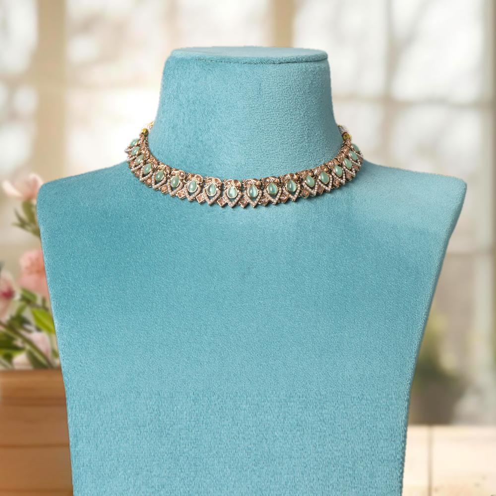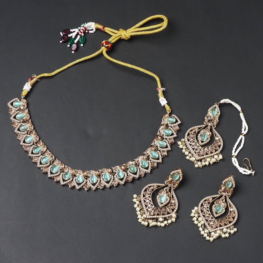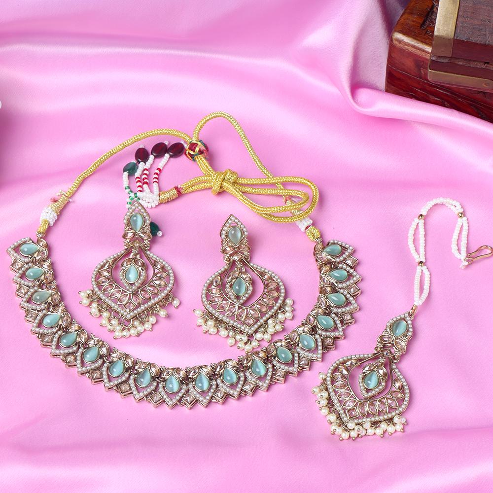 OrnaOra's imitation choker features an antique gold tone with intricate detailing and serene mendi green stone accents. This set includes matching imitation earrings and a delicate maang tikka for a traditional look.
