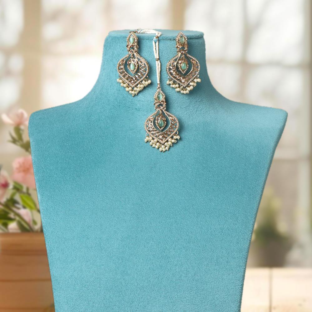 OrnaOra suggests pairing this imitation jewelry set with a light-colored silk saree or a traditional salwar kameez for an elegant and sophisticated ethnic appearance. The maang tikka completes the ensemble.