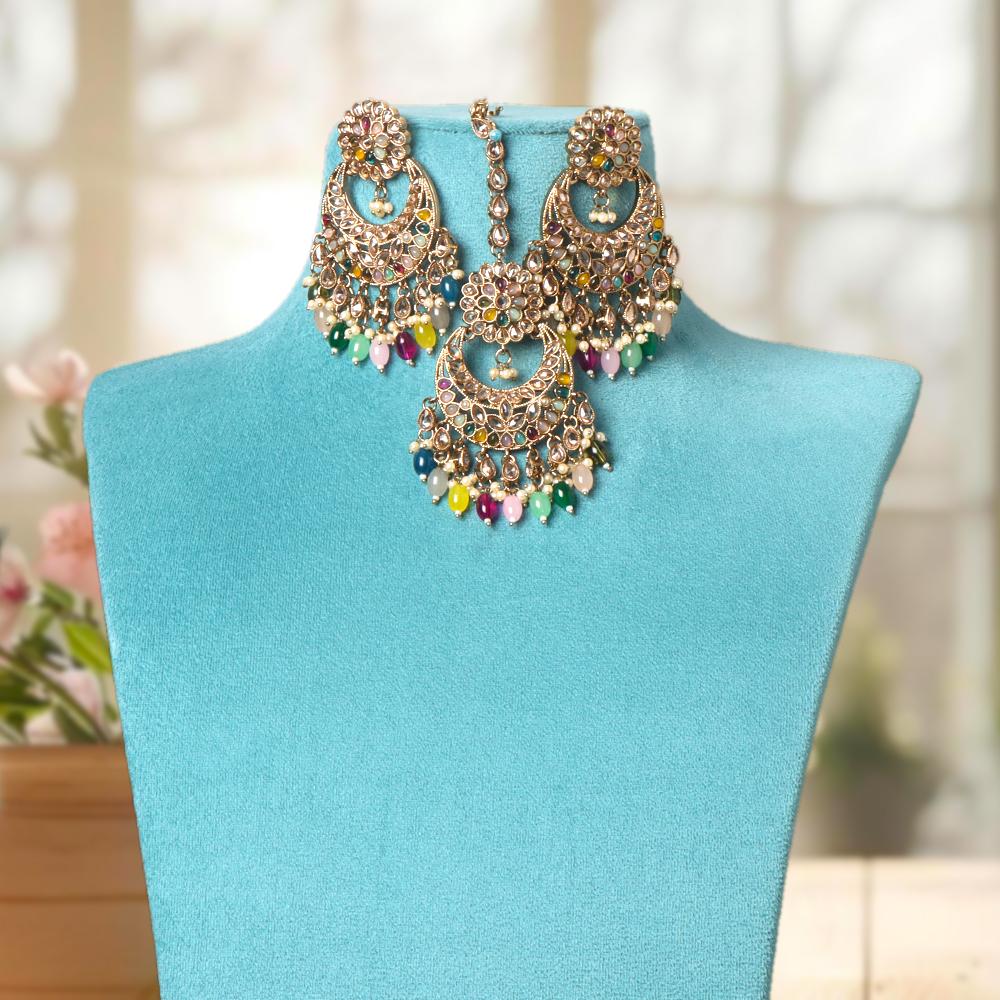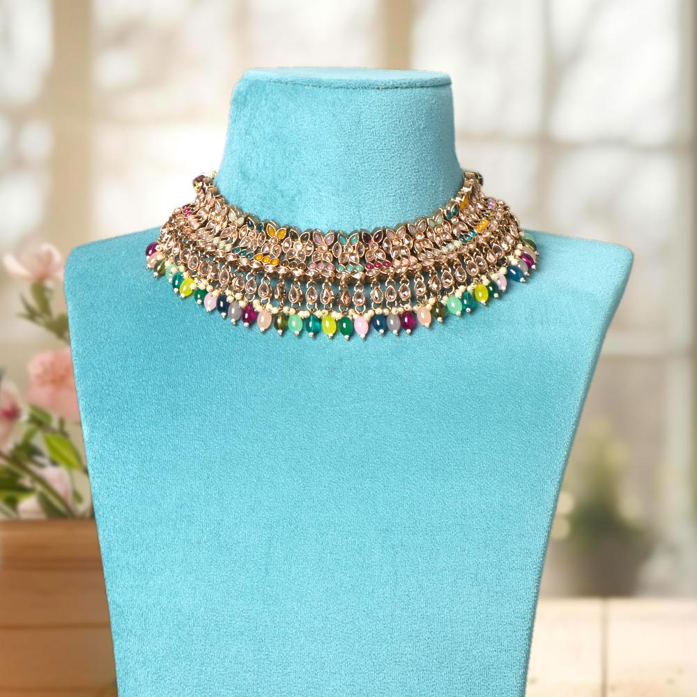 OrnaOra's imitation choker features intricate Kundan-inspired detailing adorned with vibrant multicolor stone drops and delicate faux pearl accents. This set includes matching statement imitation earrings for a festive look.