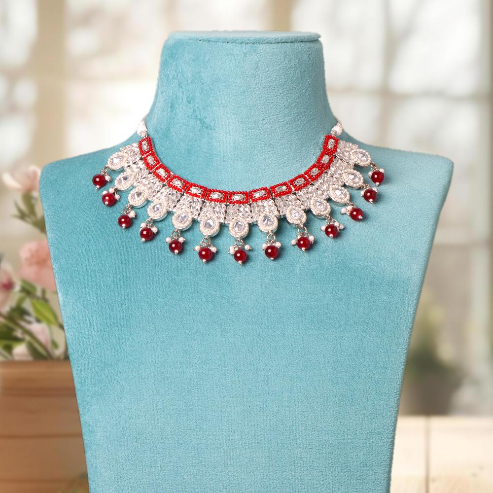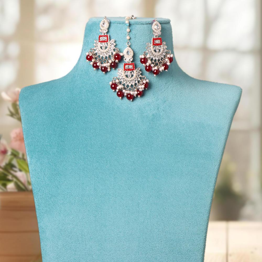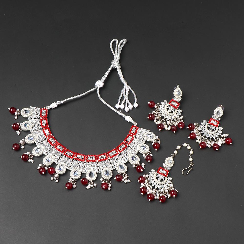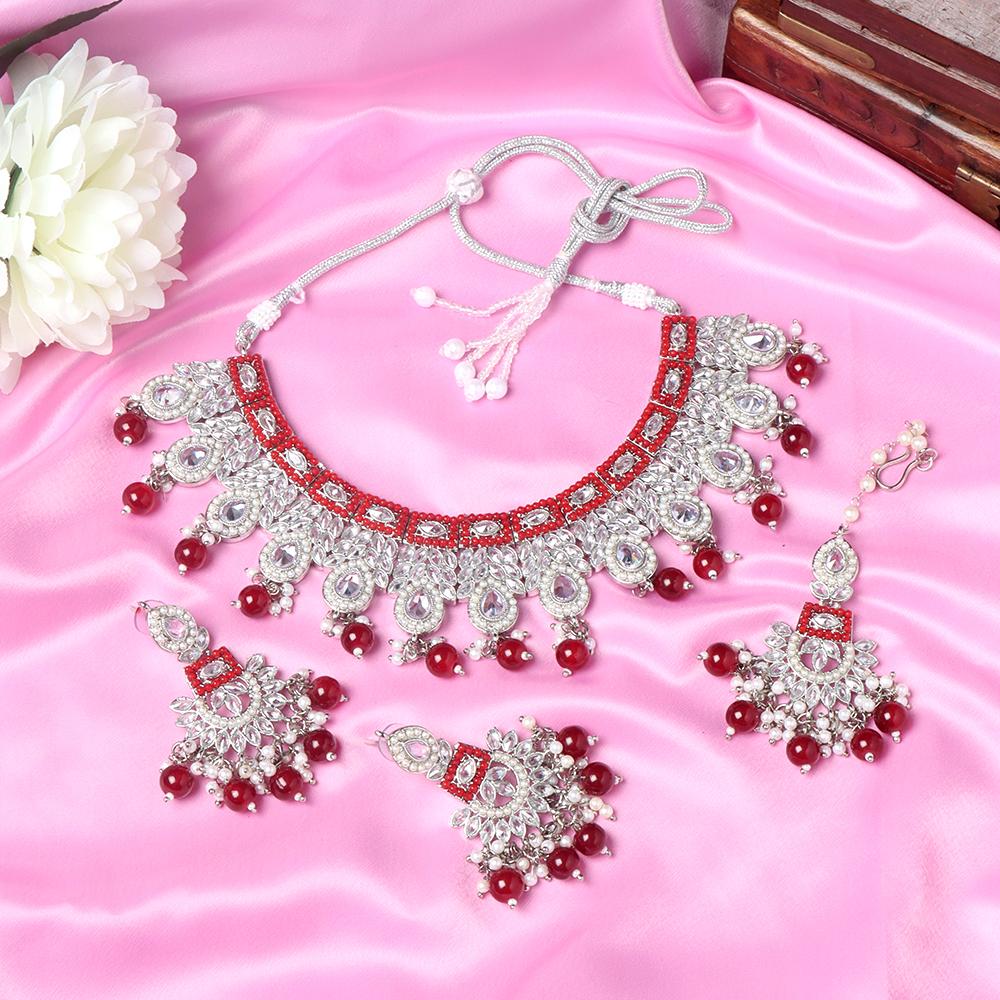 OrnaOra's elegant imitation jewelry set features a necklace, earrings, and maang tikka, adorned with red beads and sparkling stones. Perfect for traditional and festive occasions.