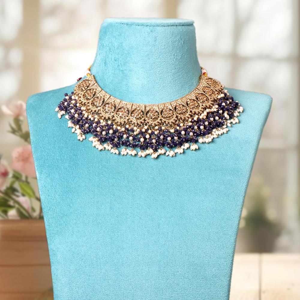OrnaOra's elegant imitation jewelry set with a necklace and matching earrings adorned with royal blue beads. Perfect for traditional outfits and festive occasions.