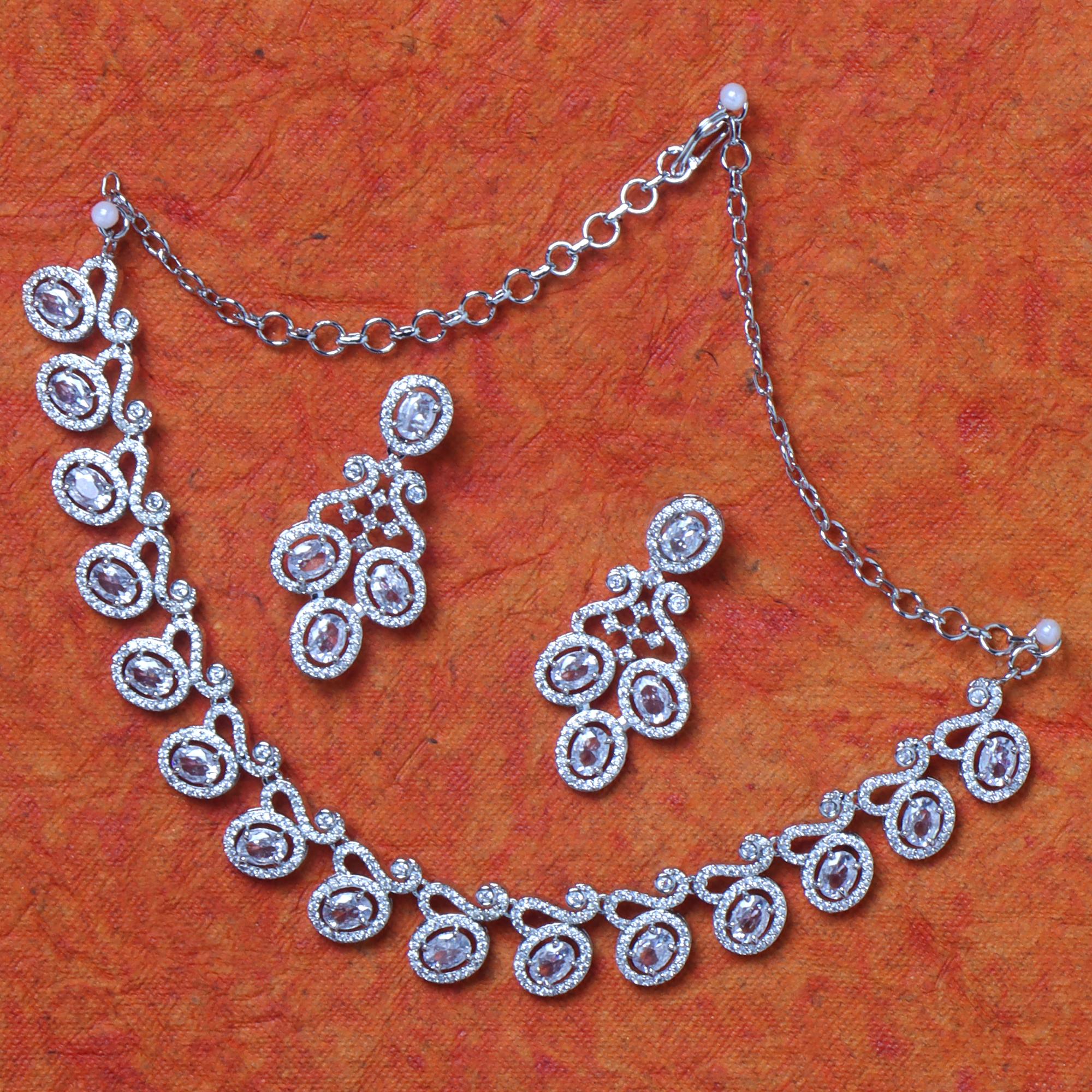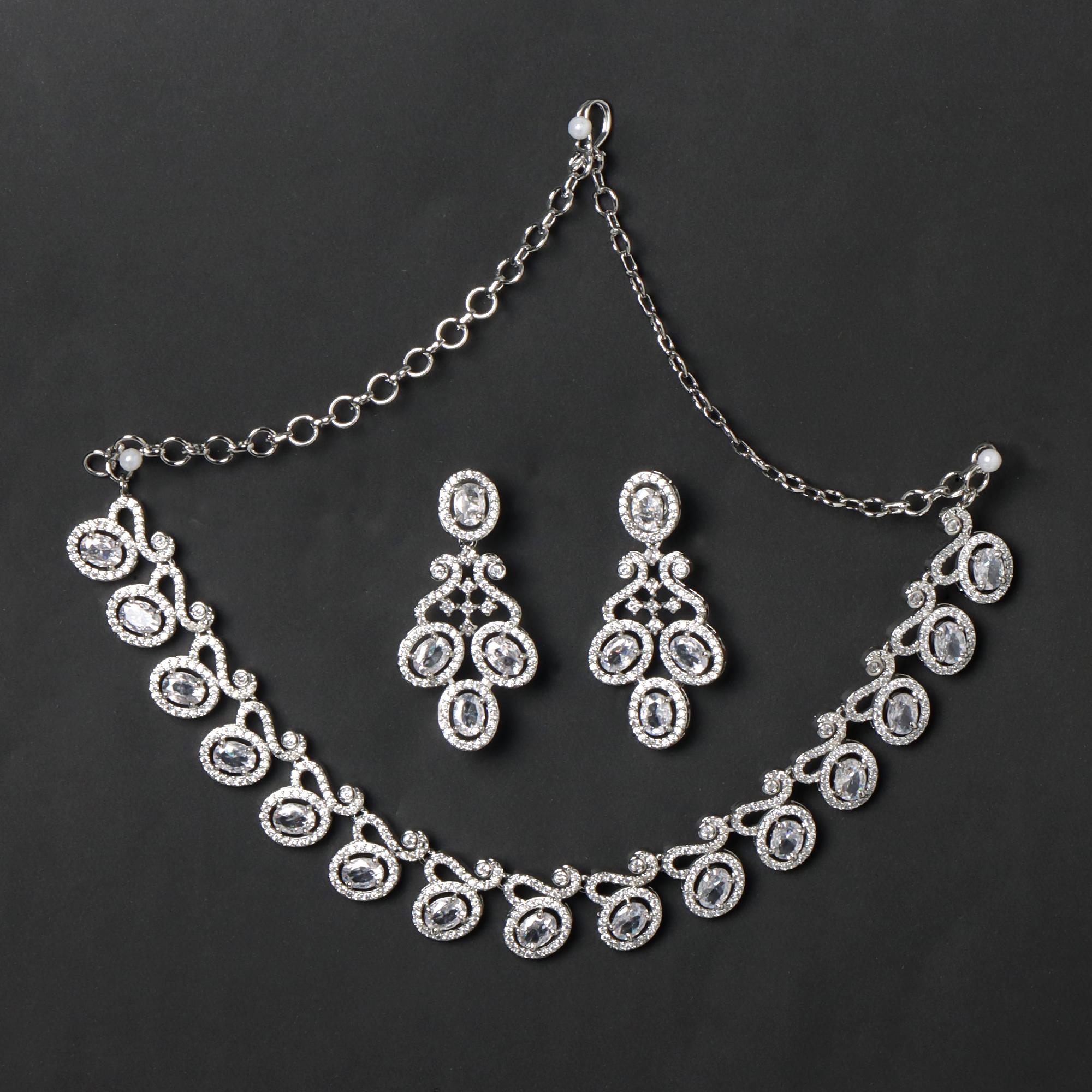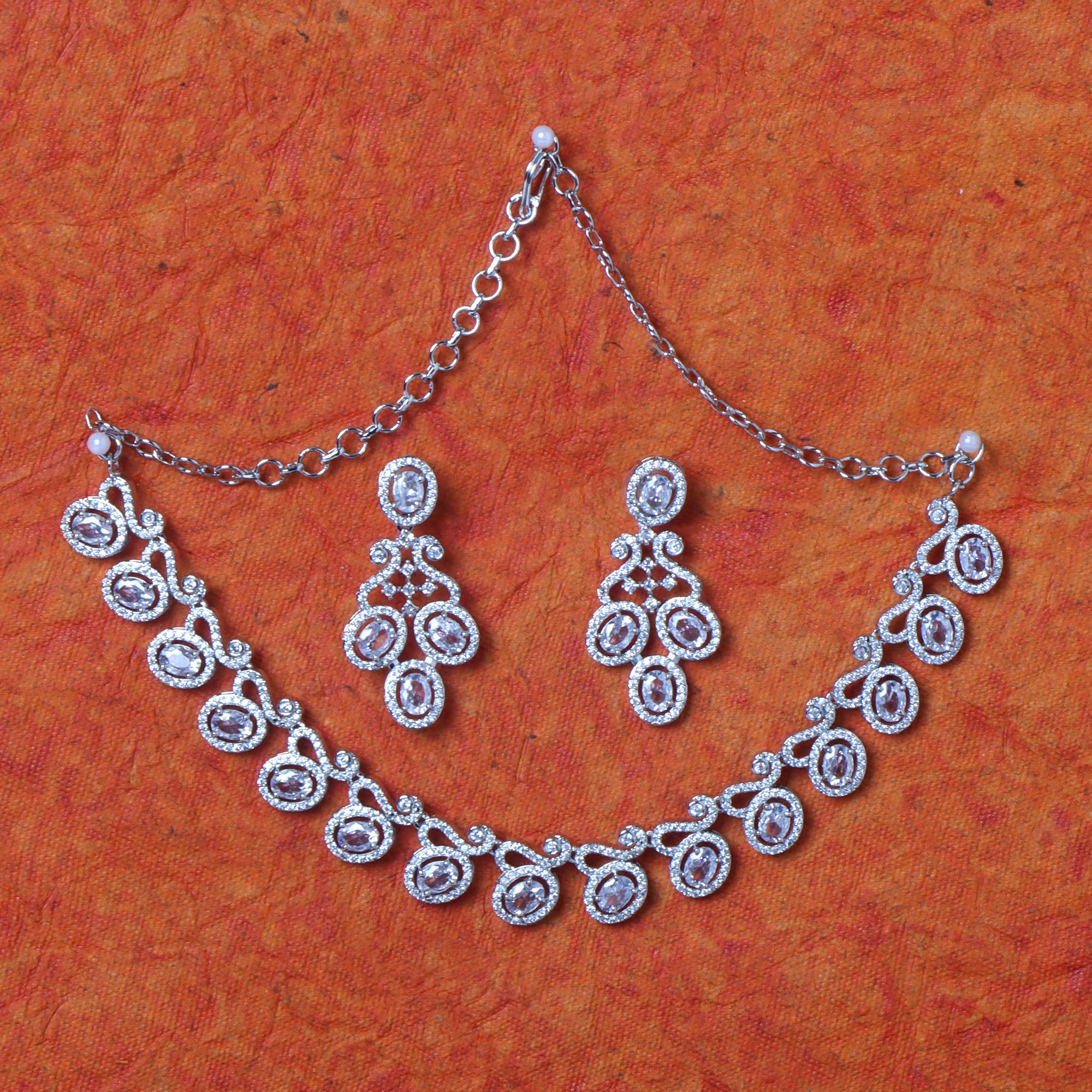 OrnaOra's elegant Silver American Diamond Jewellery Set features sparkling American Diamond stones in a beautiful linked oval design. Includes a necklace and matching dangle earrings. Adds timeless brilliance.