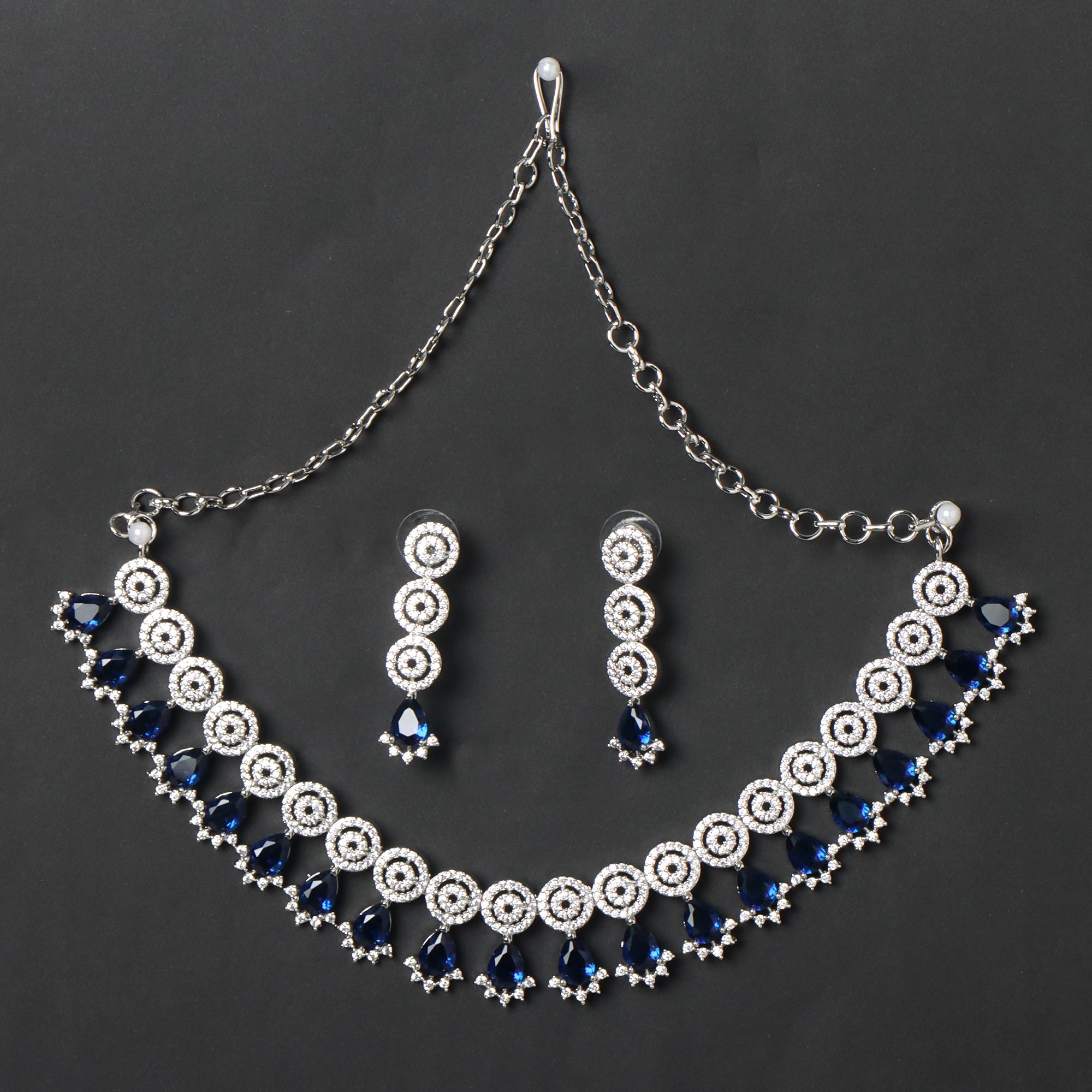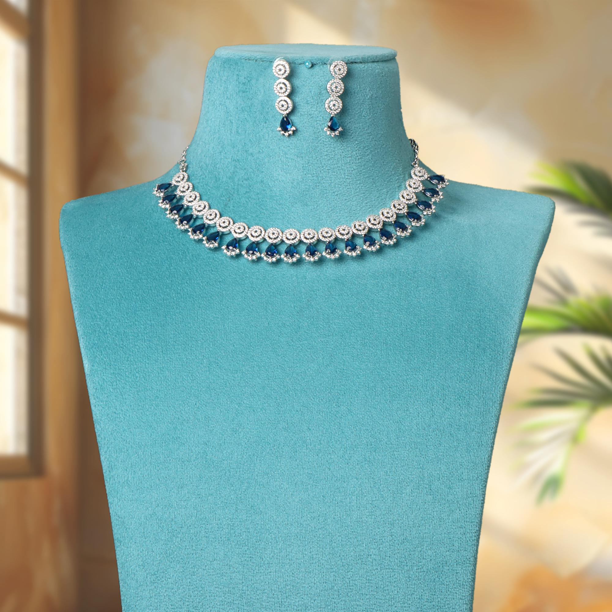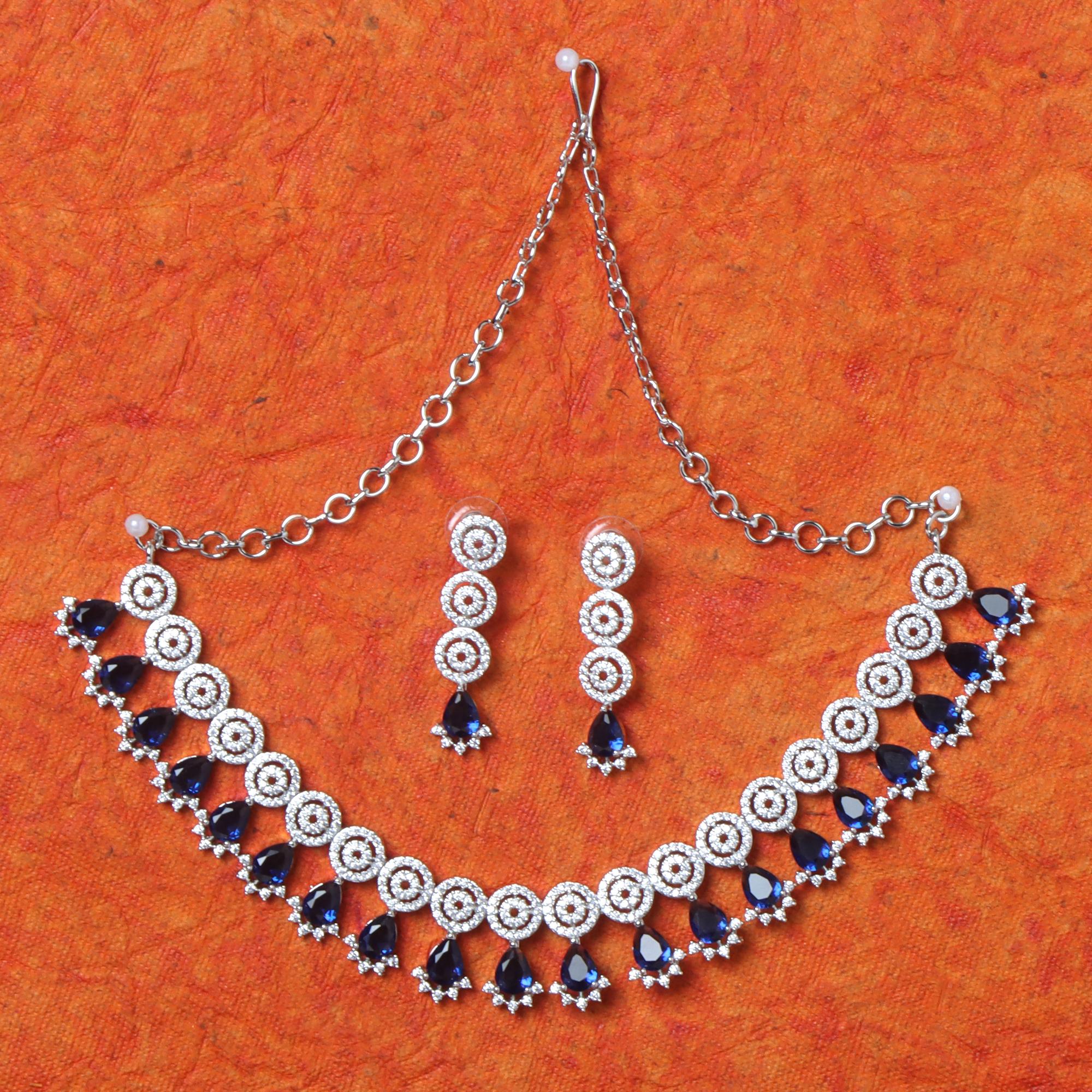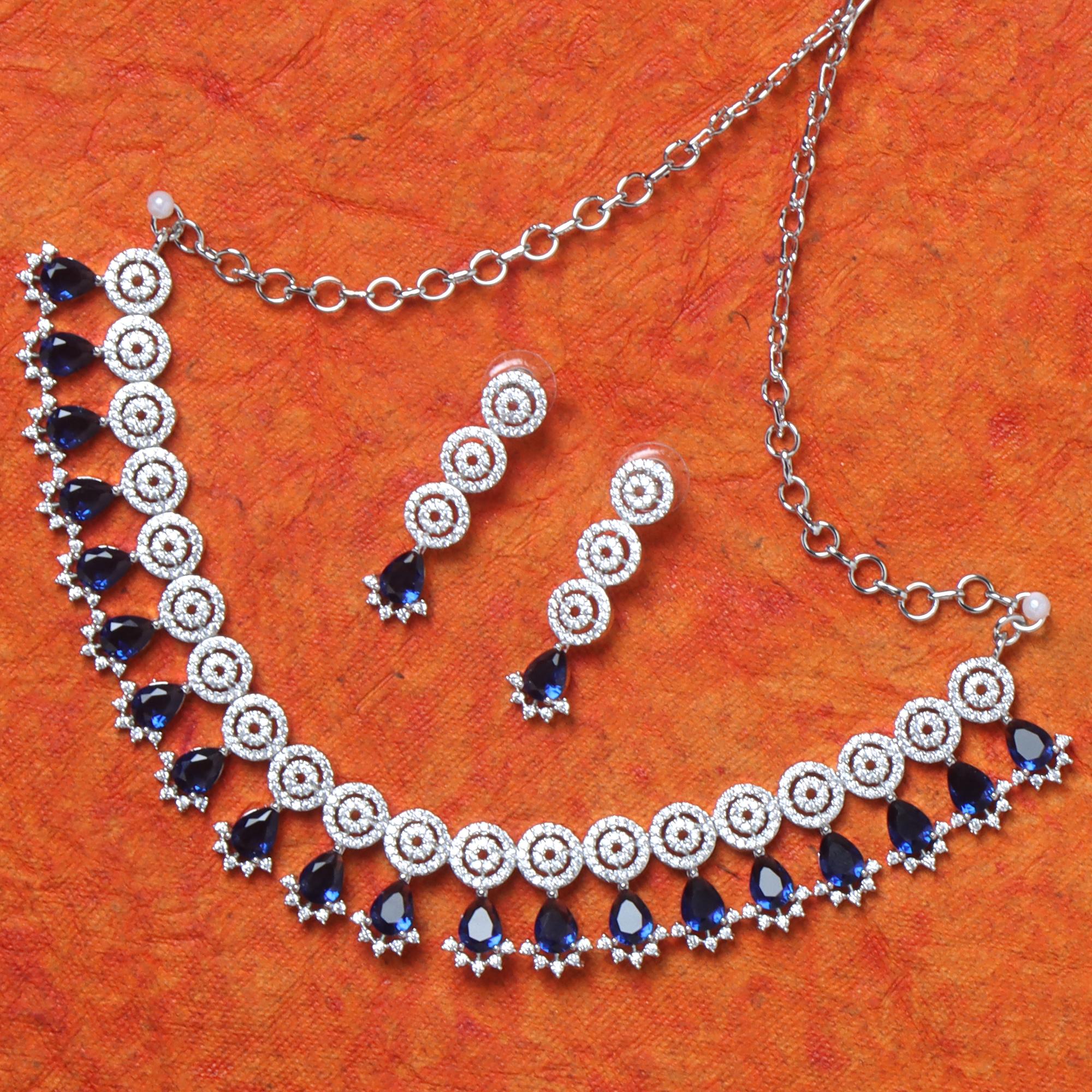 OrnaOra's stunning Silver Blue American Diamond Jewellery Set features sparkling AD studded links and brilliant blue stone drops. Includes a beautiful necklace and matching dangle earrings. Adds a vibrant touch.