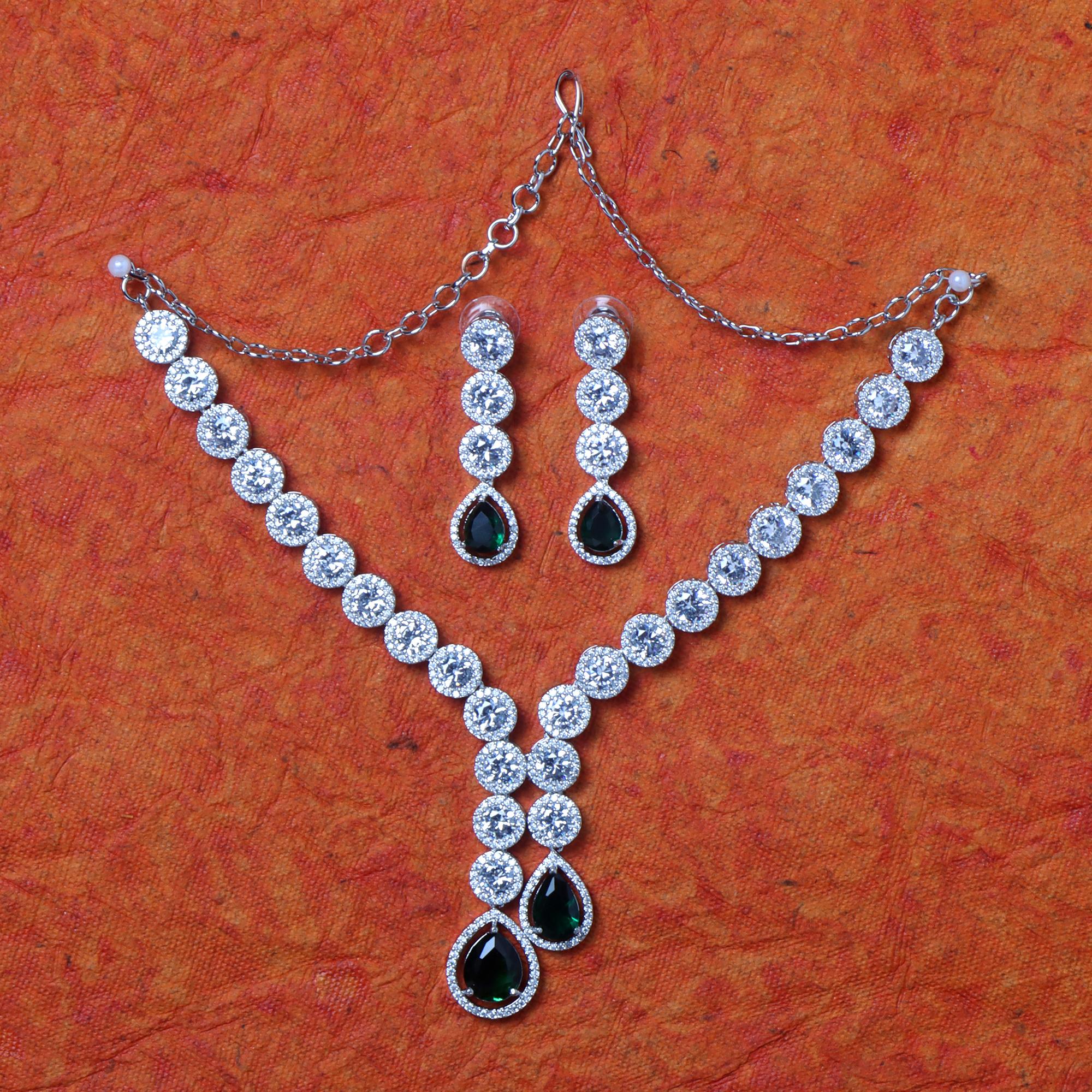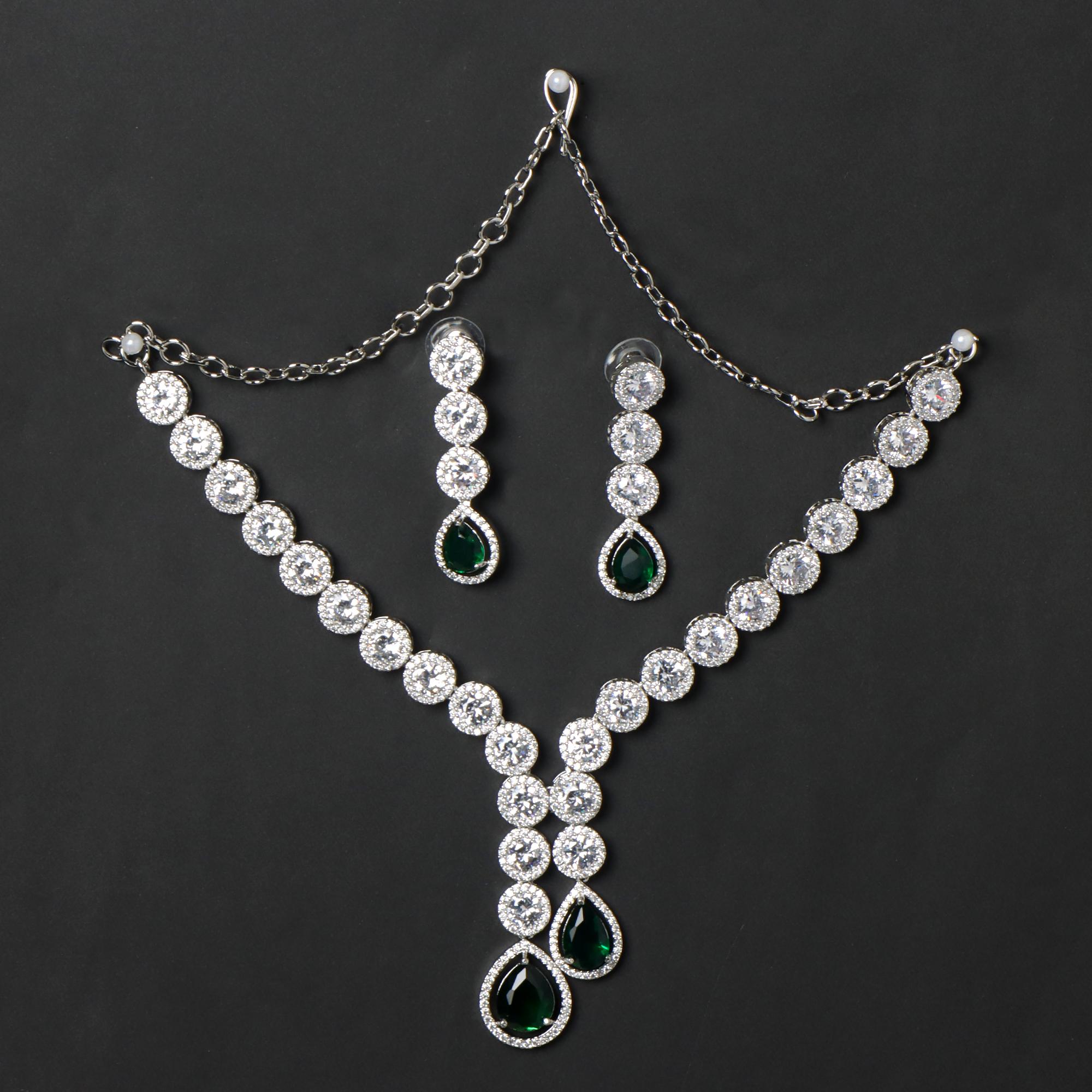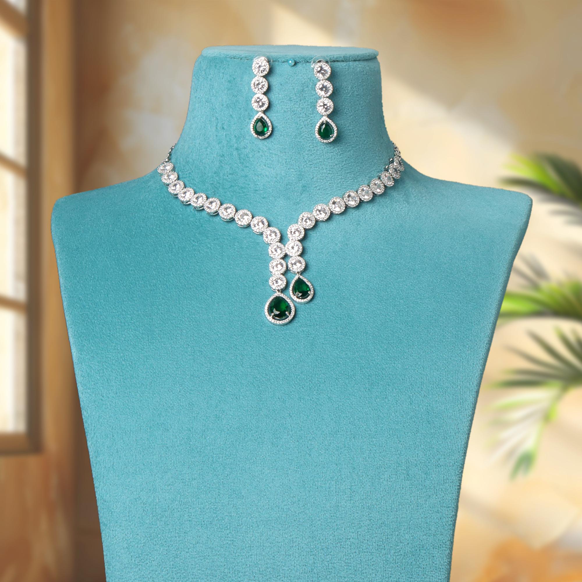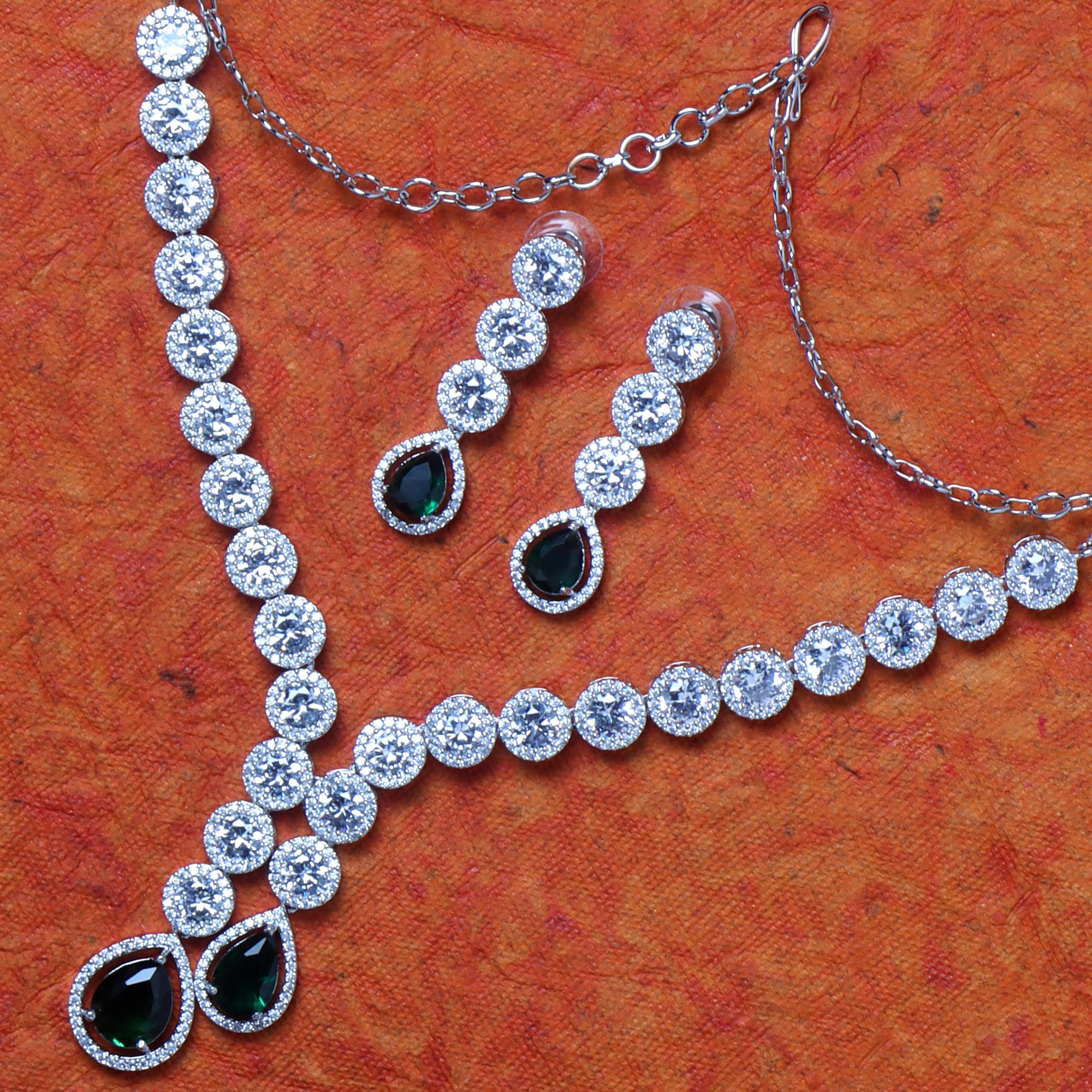 OrnaOra's elegant Silver Jewellery Set features sparkling stones and rich Emerald stone drops. Includes a beautiful Y-shaped necklace and matching dangle earrings. Adds a touch of radiant colour.