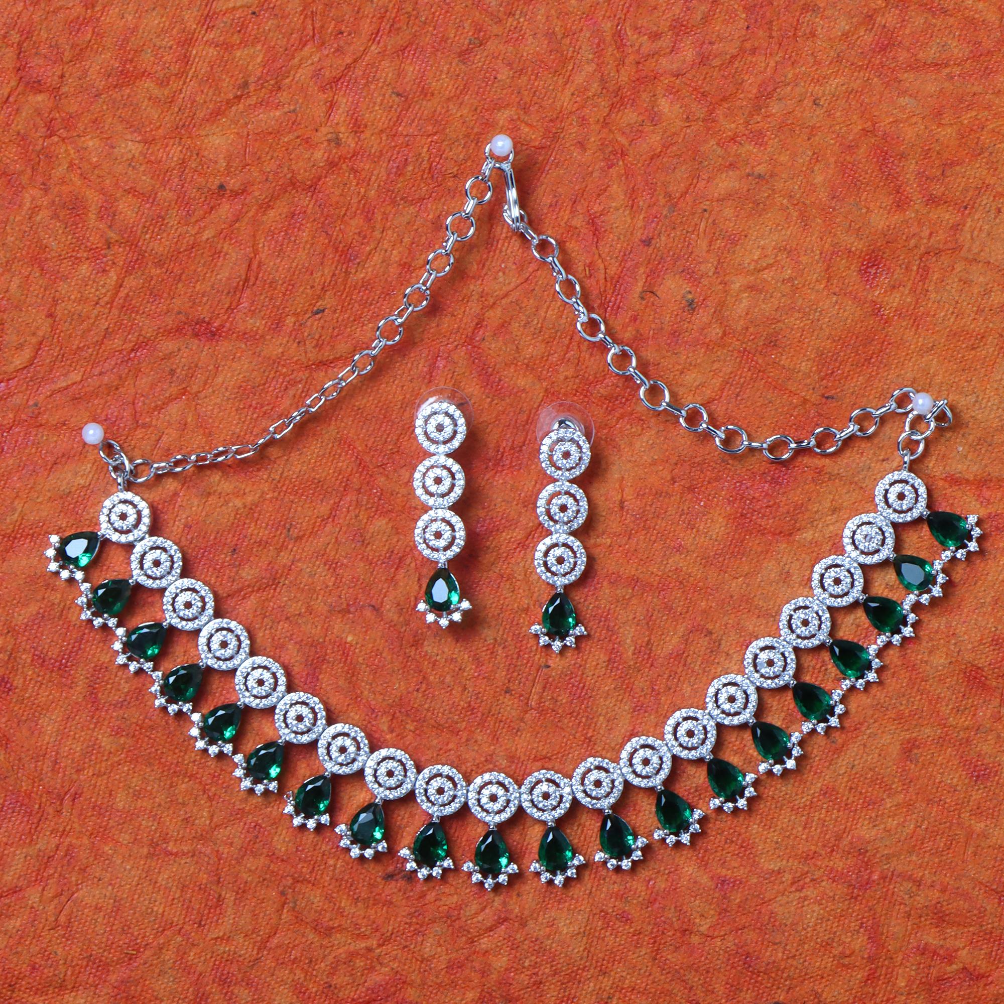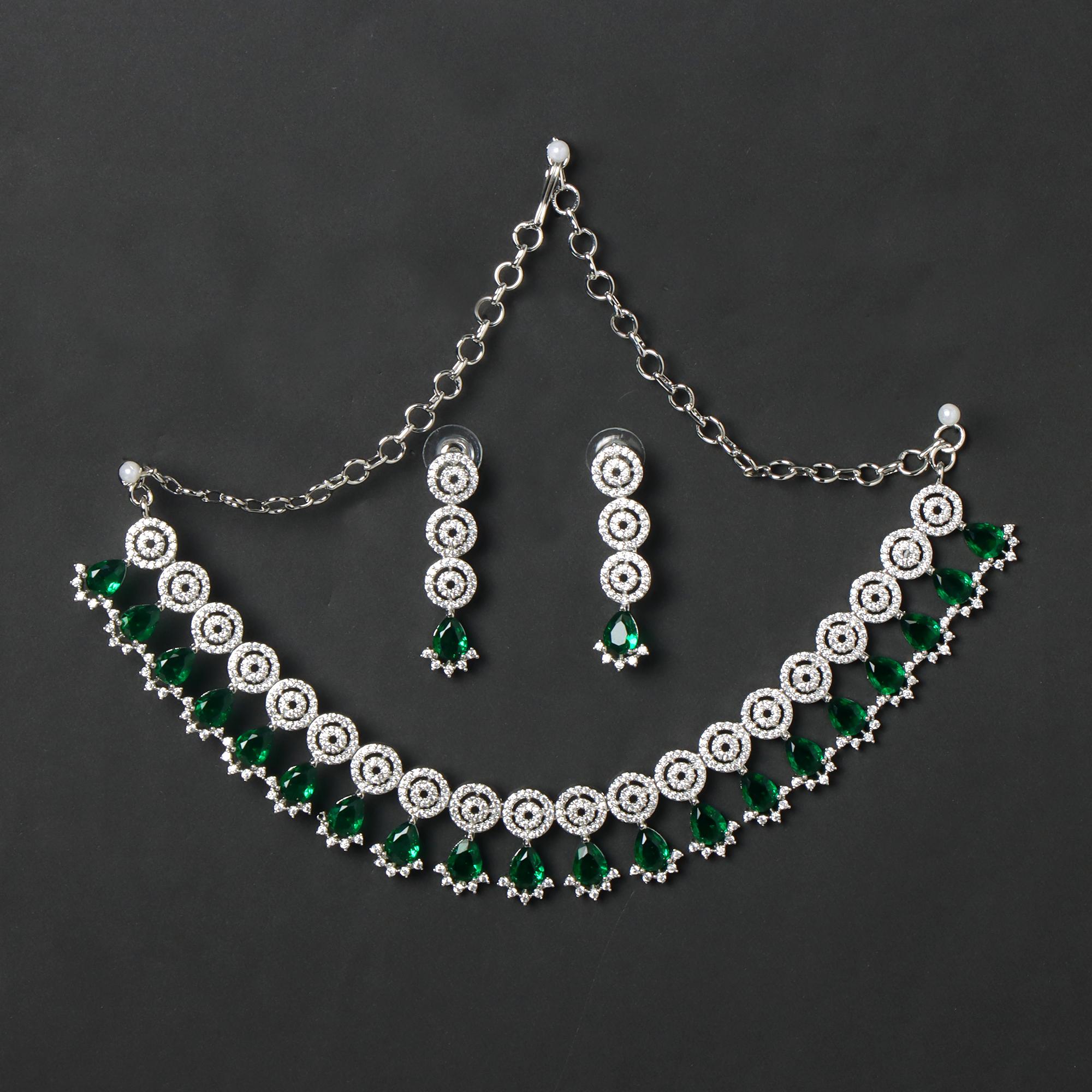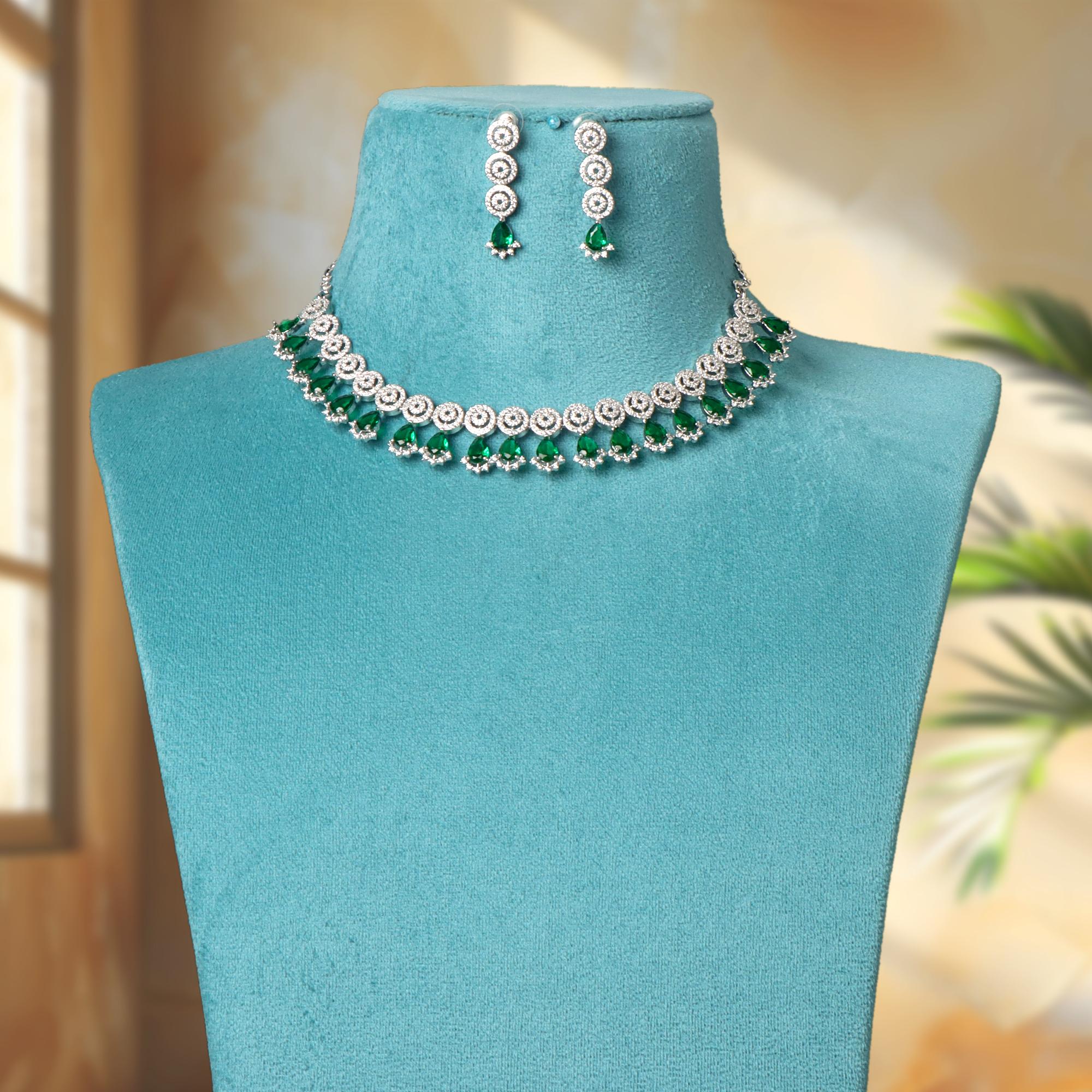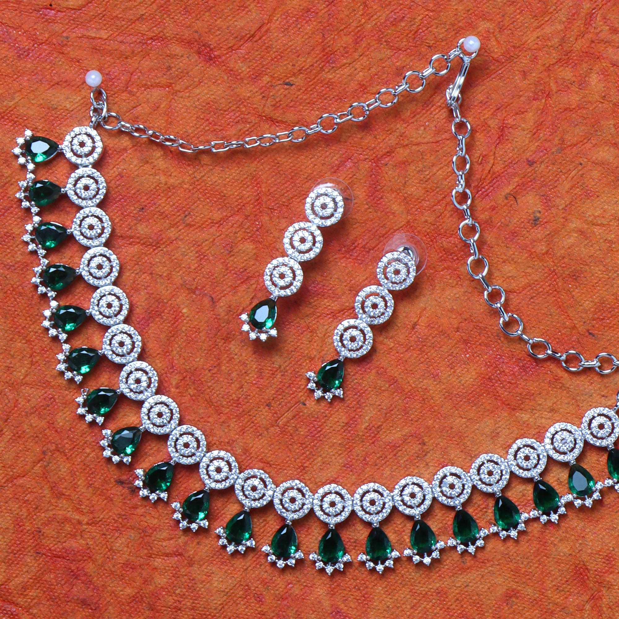 OrnaOra's exquisite Rhodium-Plated Jewellery Set features sparkling White and vibrant Green Stone-Studded details. Includes a beautiful necklace and matching dangle earrings. Adds elegant colour and sparkle.