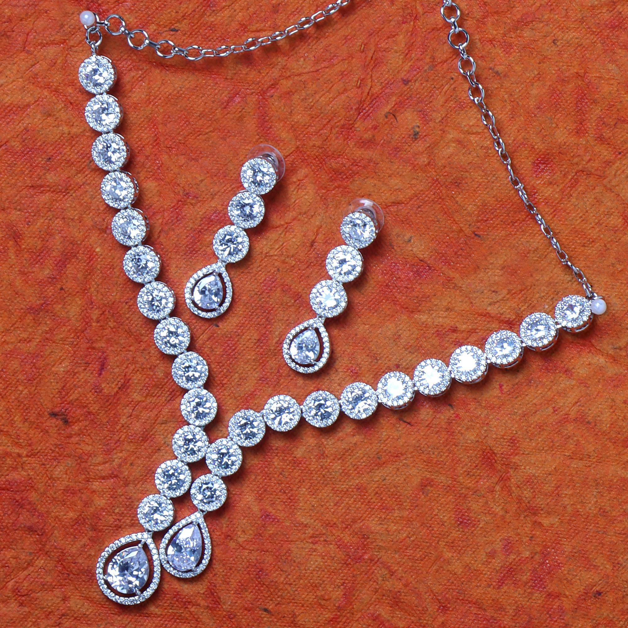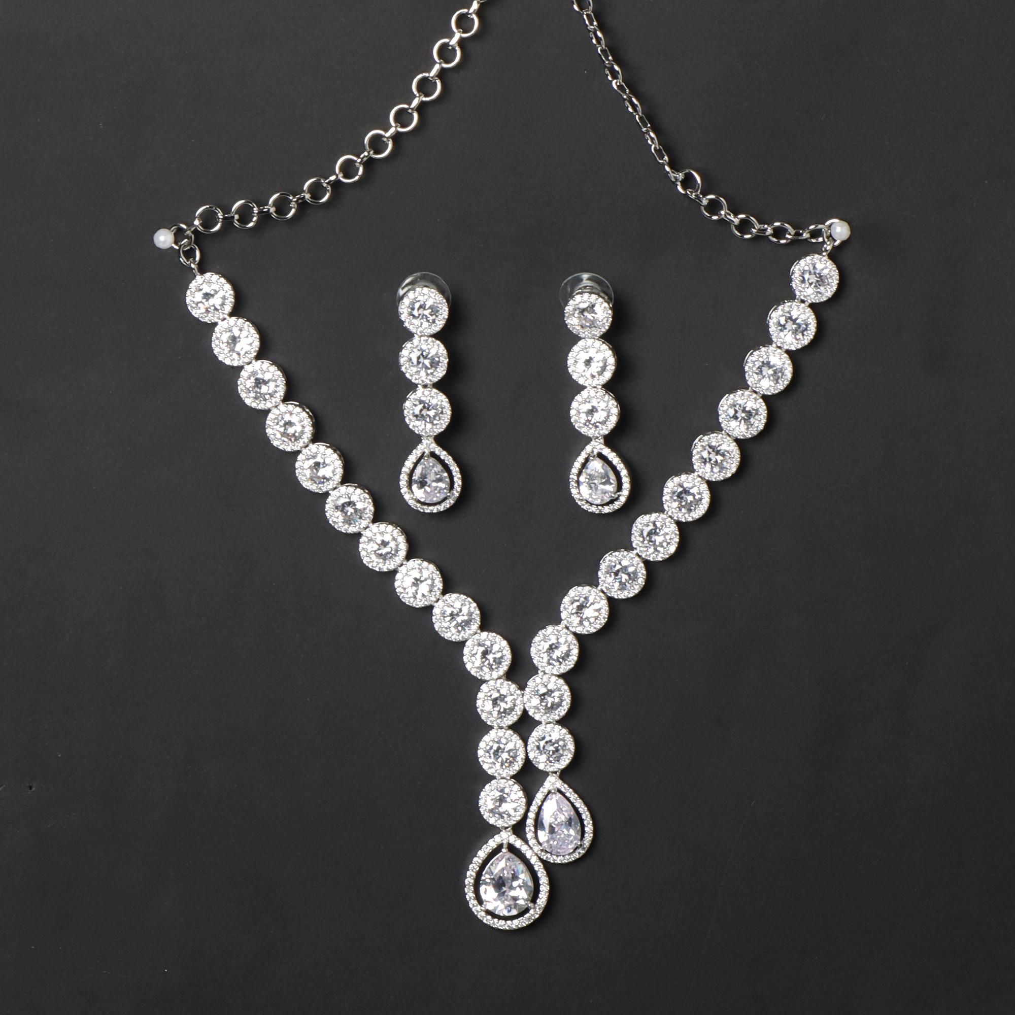 OrnaOra's elegant Silver Zirconia Jewellery Set features sparkling Zirconia stones in a graceful water drop design. Includes a beautiful Y-shaped necklace and matching dangle earrings. Perfect for weddings.