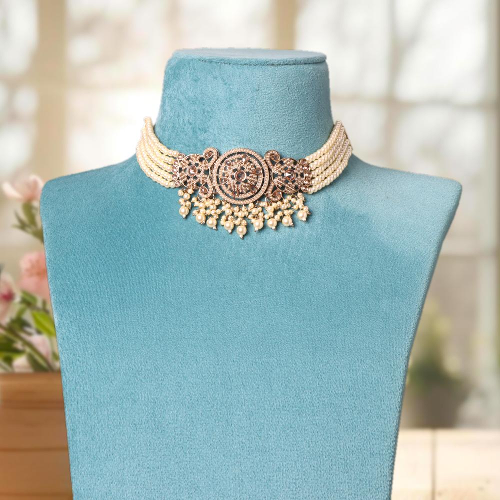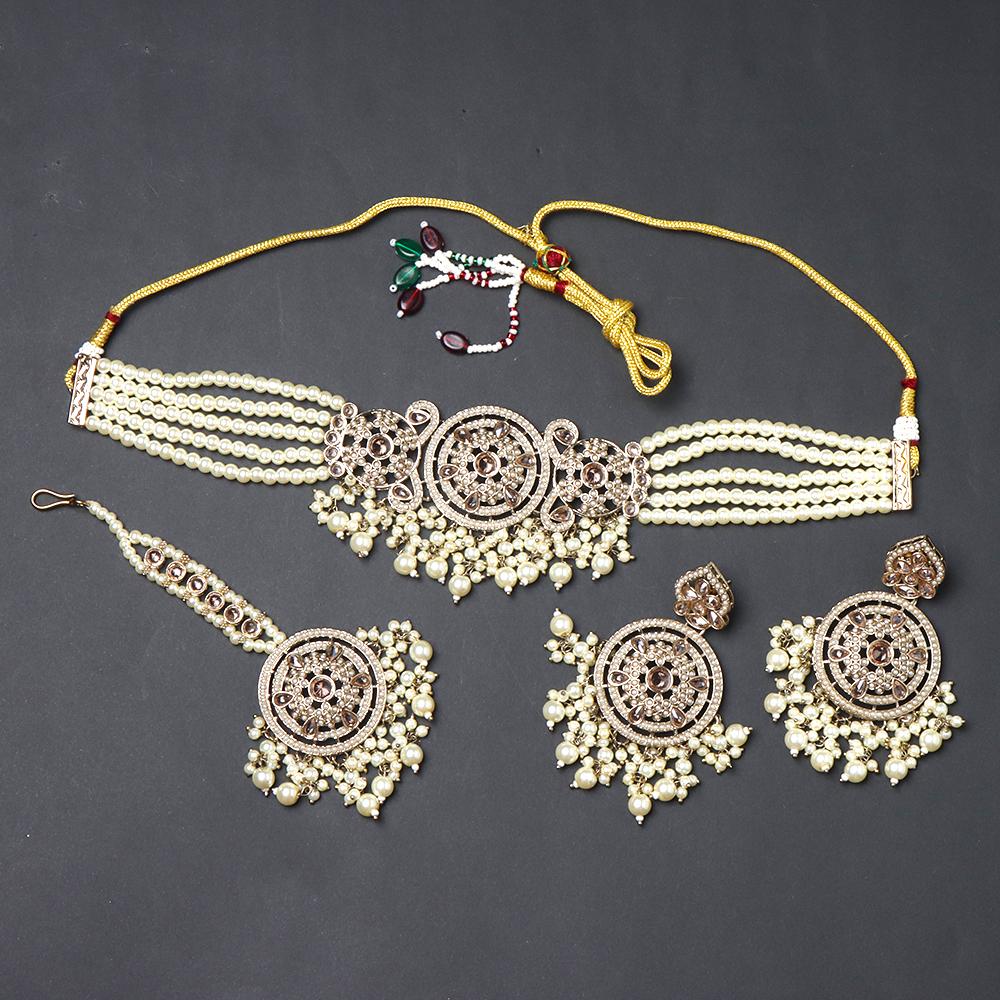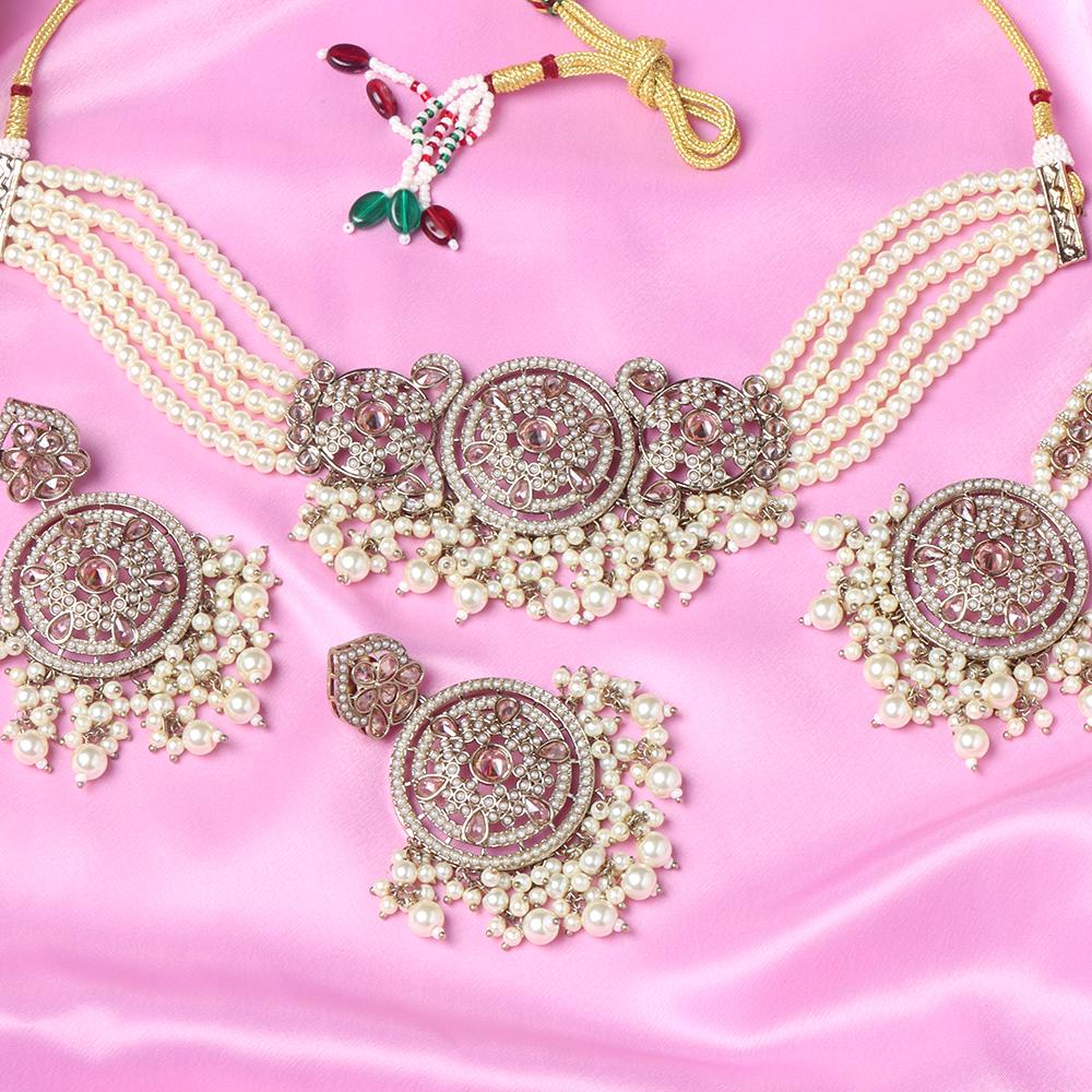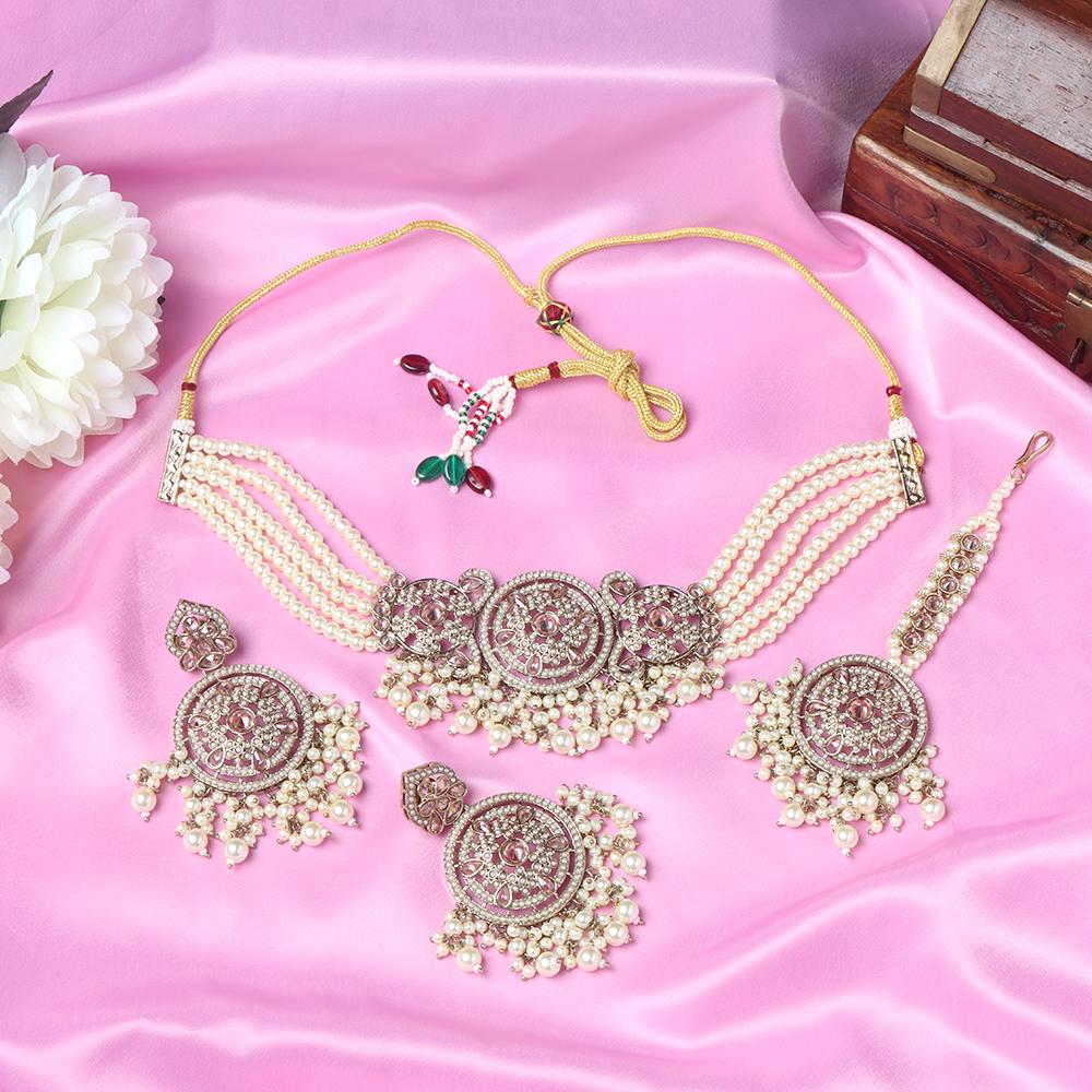 OrnaOra's imitation jewelry set features a Kundan-inspired choker with intricate detailing and delicate faux pearl drops. Includes matching imitation earrings and a beautiful maang tikka for a complete ethnic look.